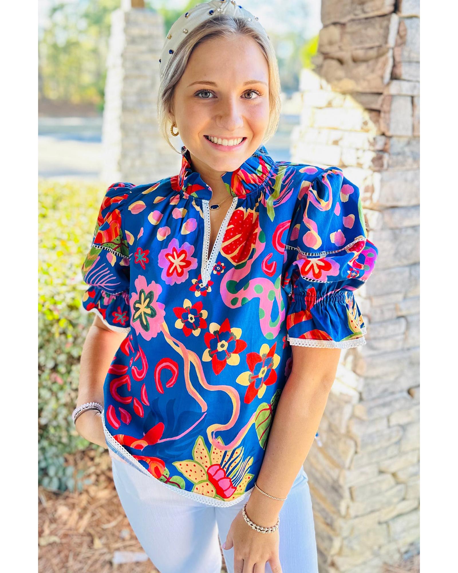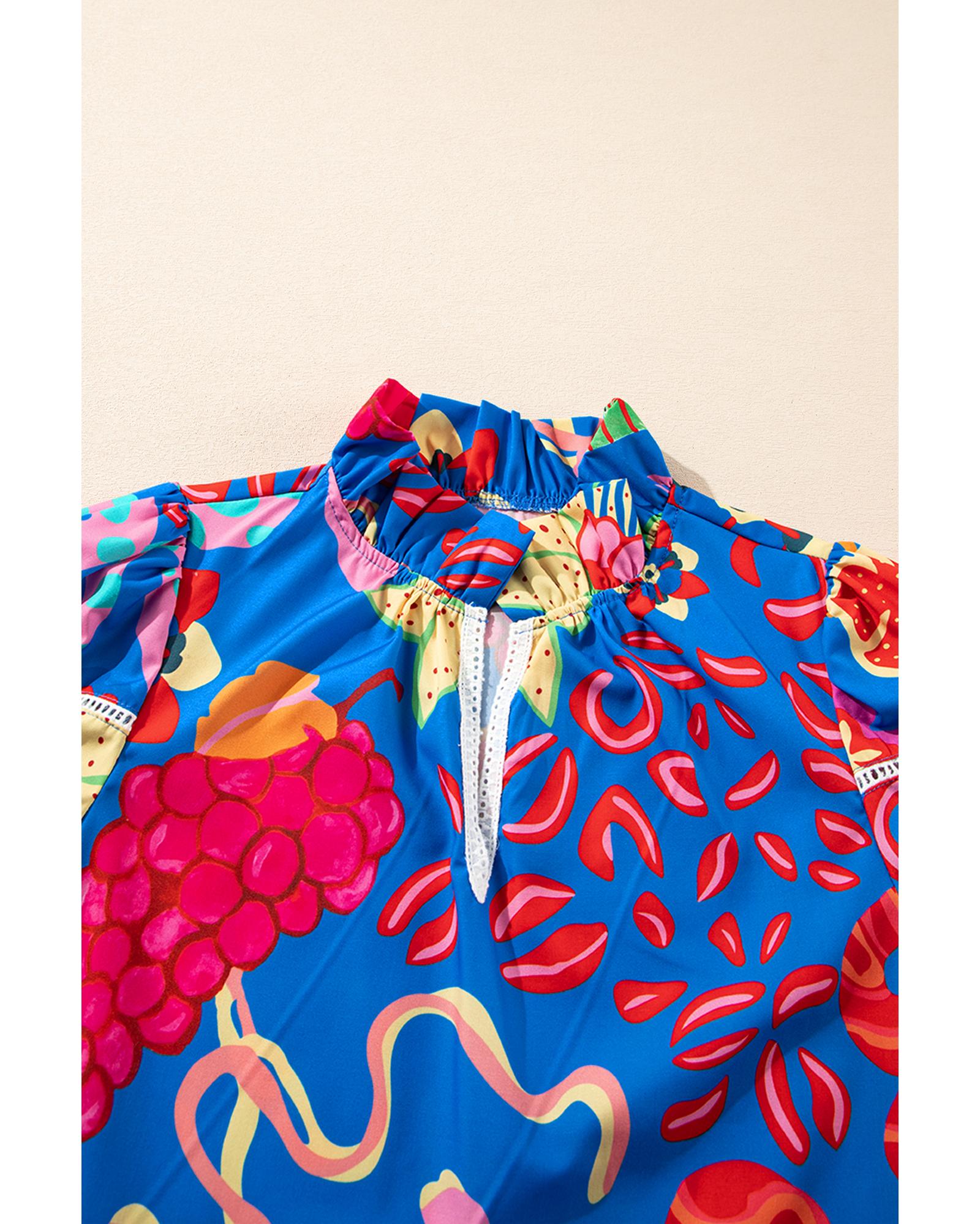 Blue Abstract Print Frilled Collar Ruffled Puff Short Sleeve Top – XL
