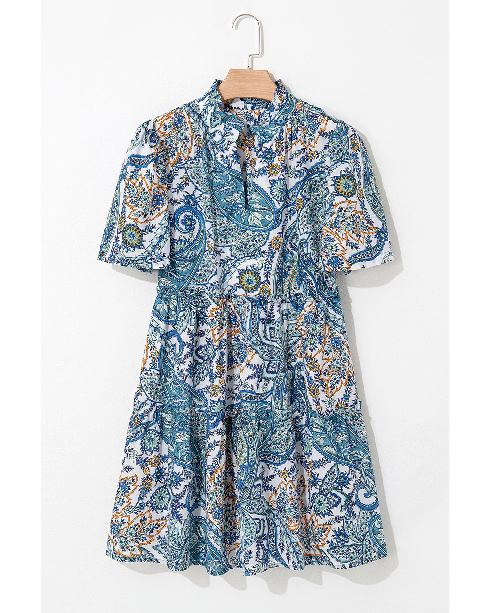 - Blue Bohemian Paisley Floral V Neck Short Sleeve Mini Dress