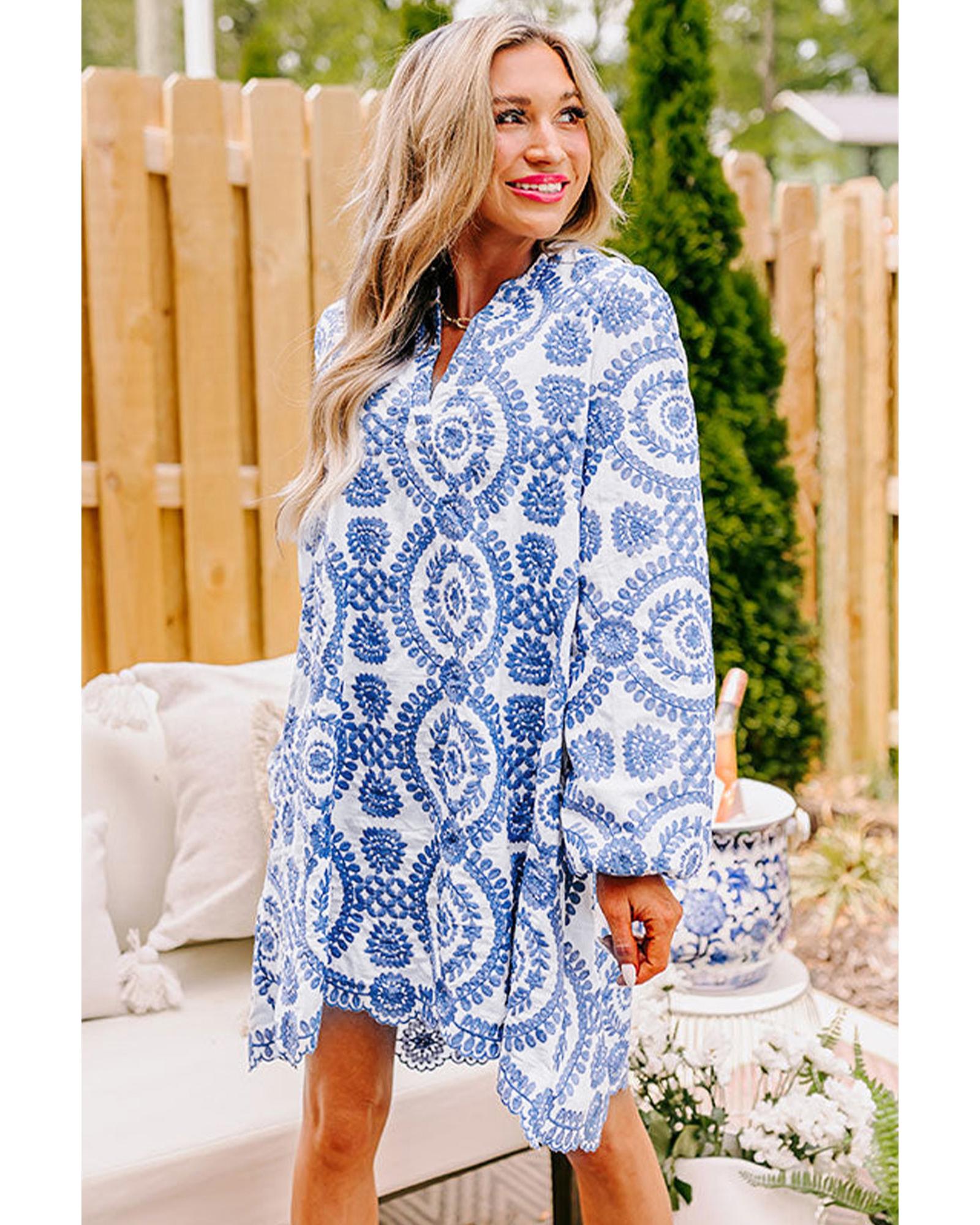Blue Boho Floral Embroidered Notch V Neck Shift Mini Dress – M