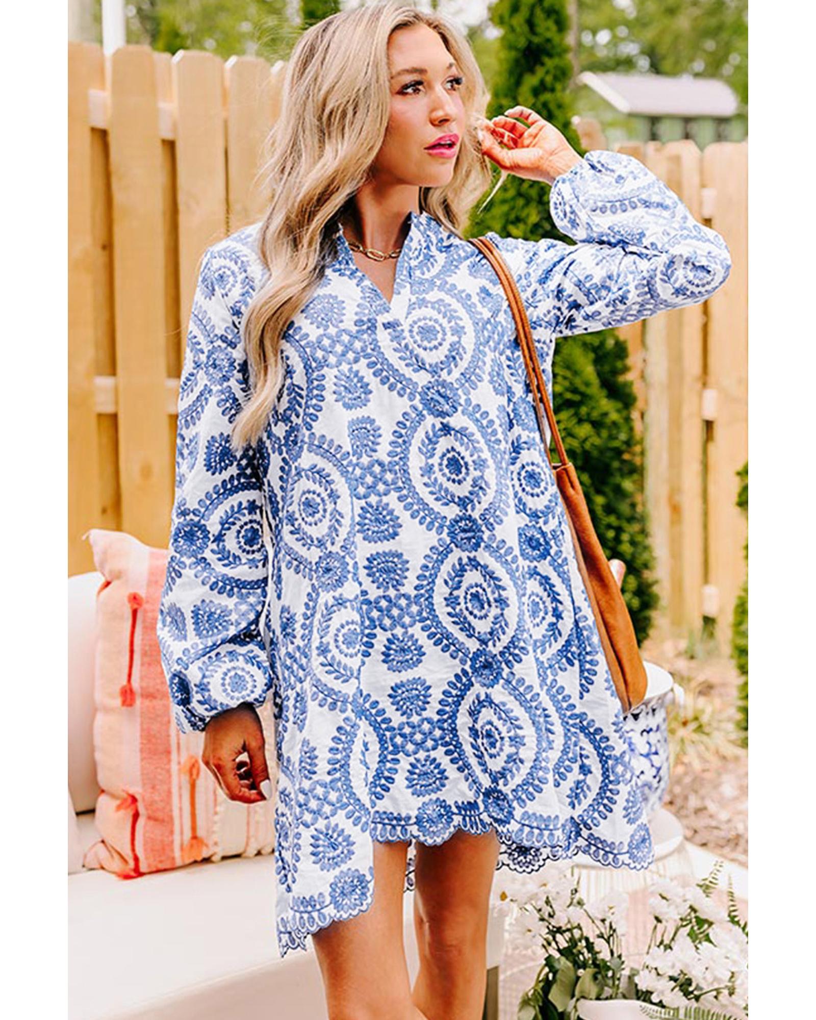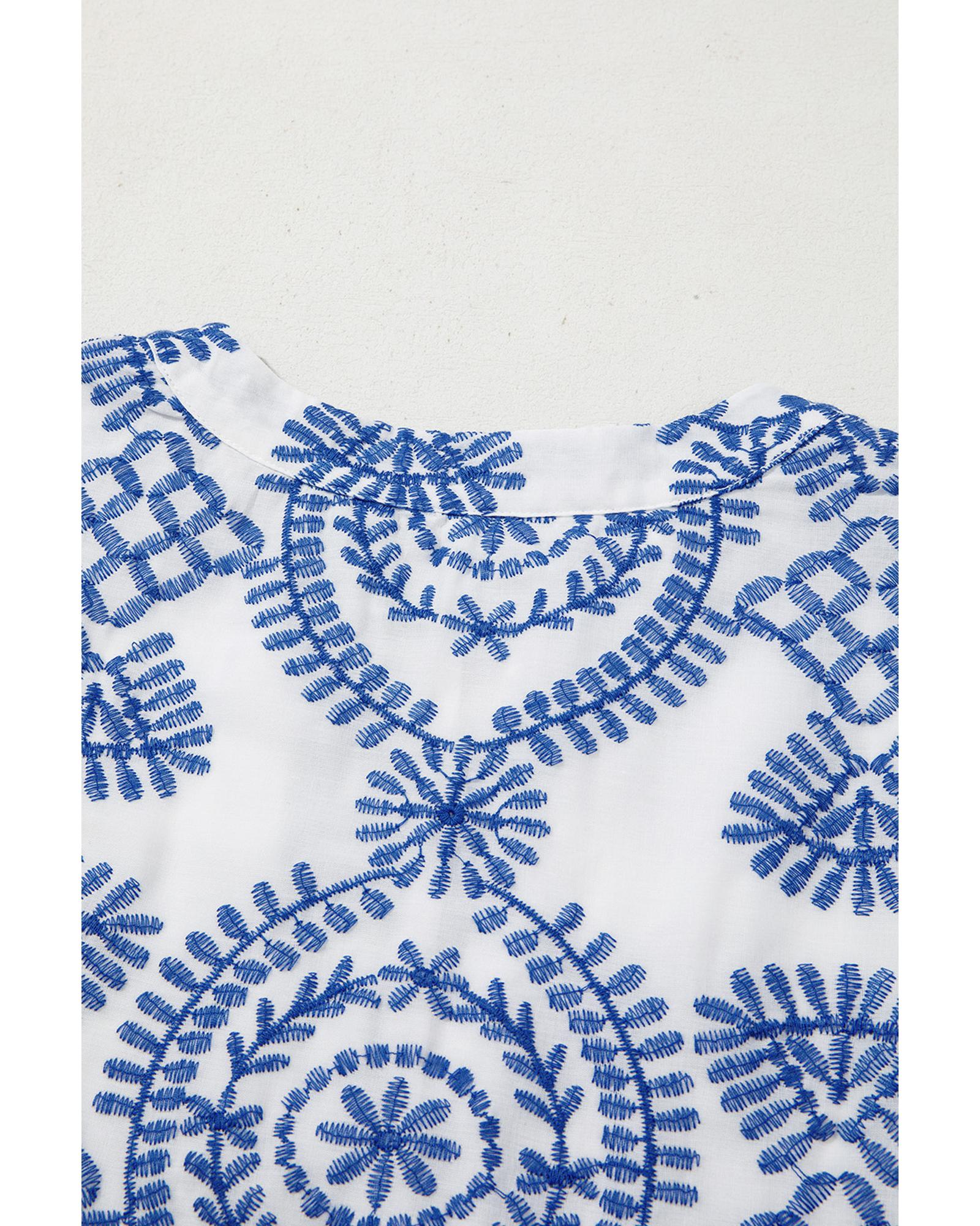 Blue Boho Floral Embroidered Notch V Neck Shift Mini Dress - L