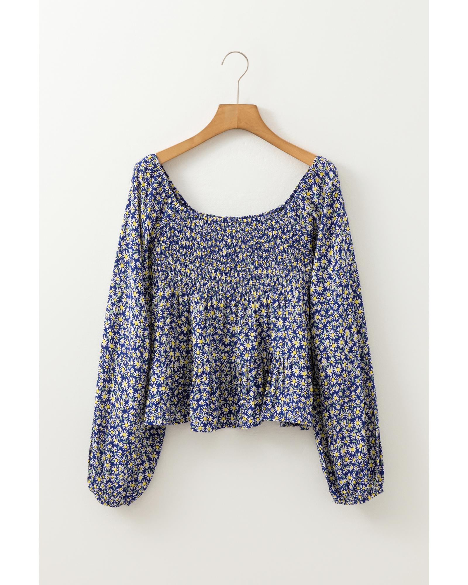 Blue Boho Floral Print Smocked Square Neck Loose Fit Blouse – M