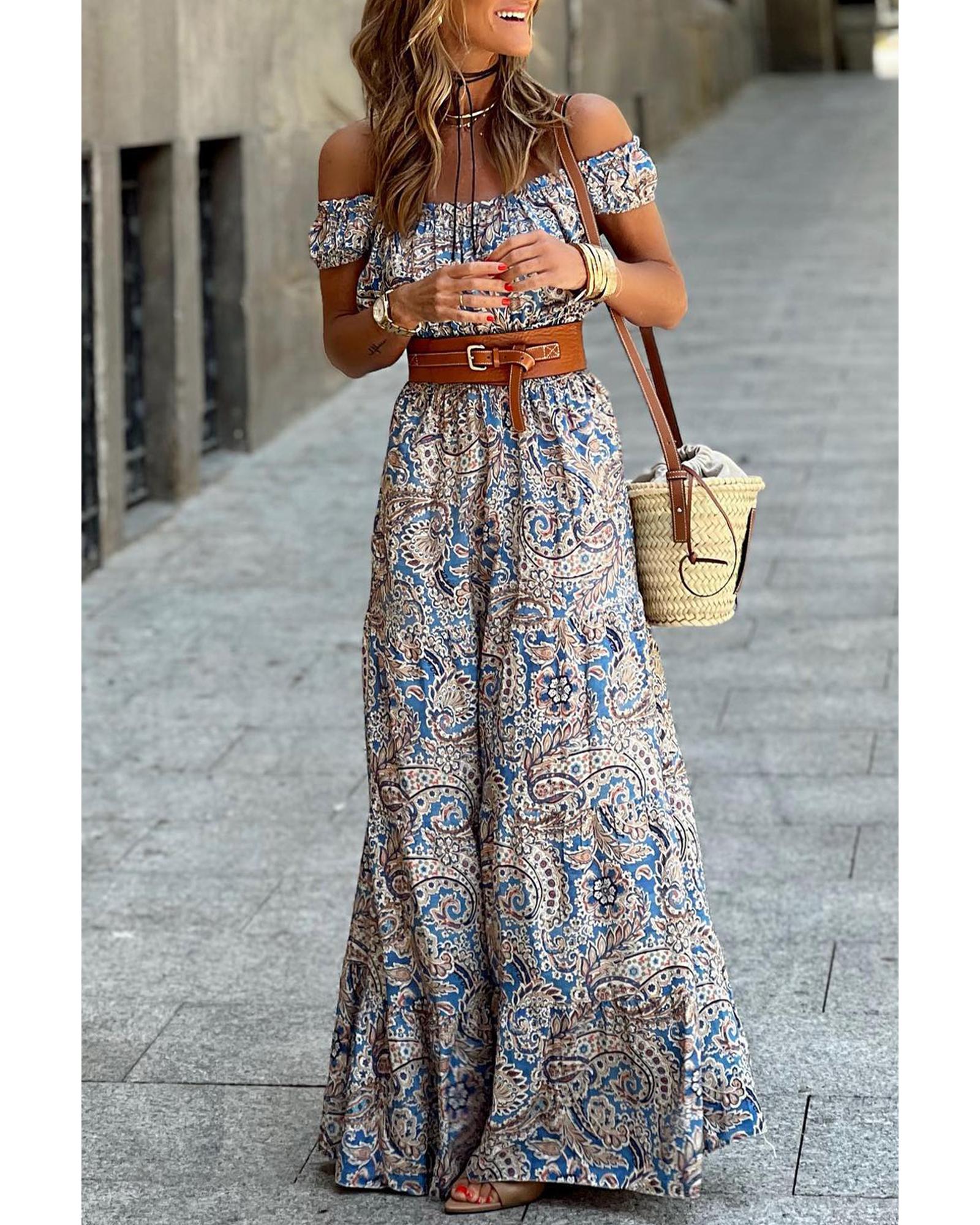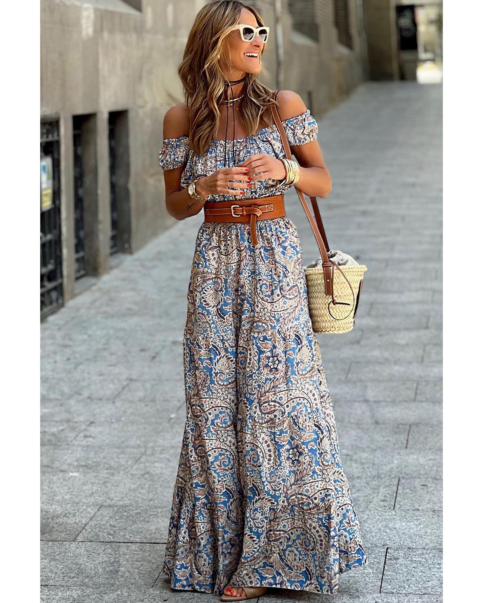 - Blue Boho Paisley Print Off Shoulder Maxi Dress