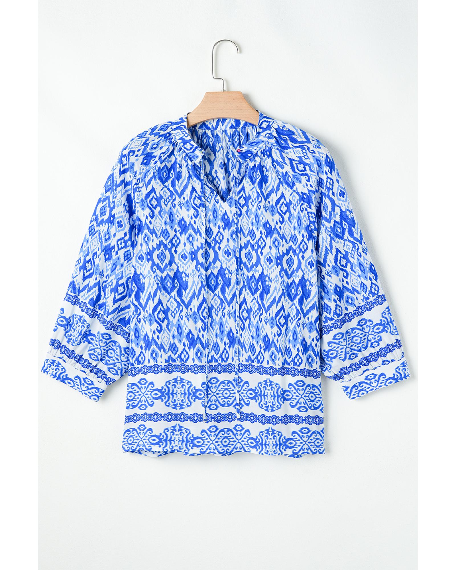 Blue Boho Printed 3/4 Sleeve Tied Neck Blouse – L