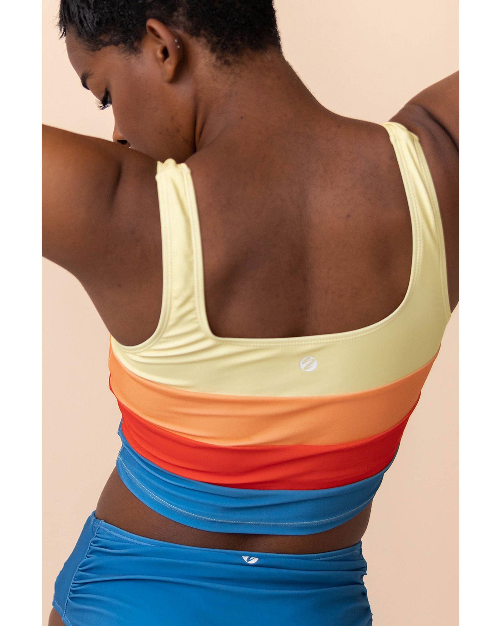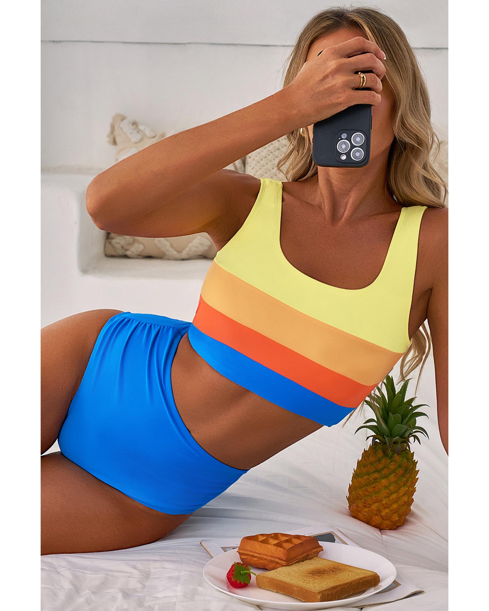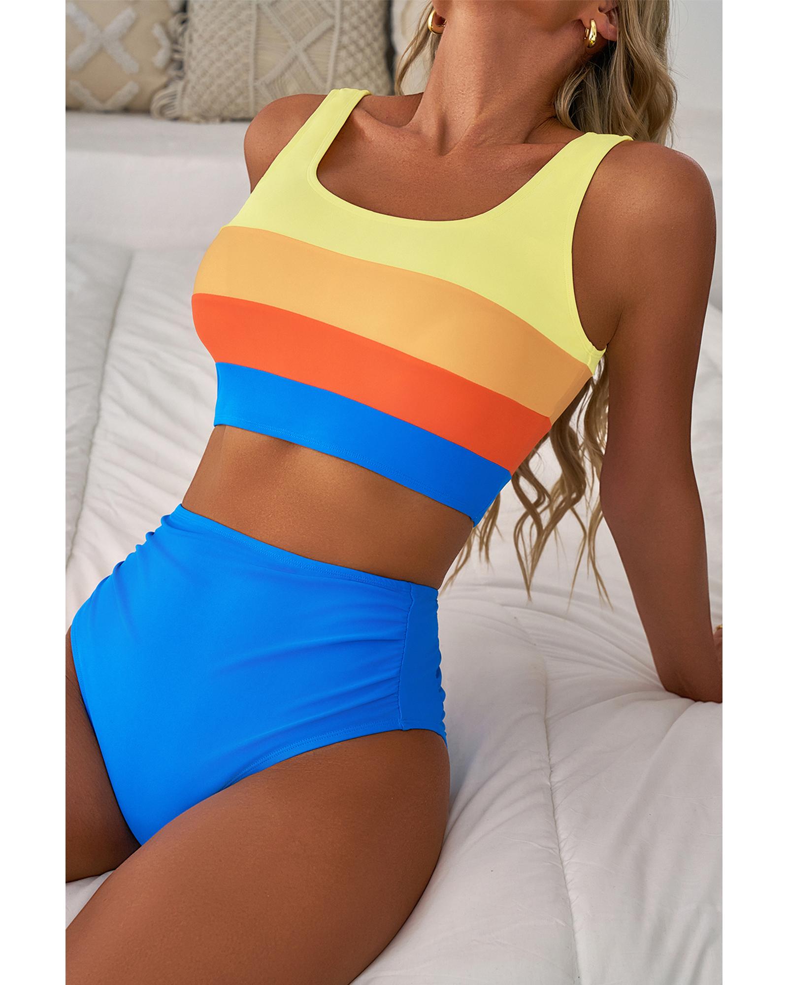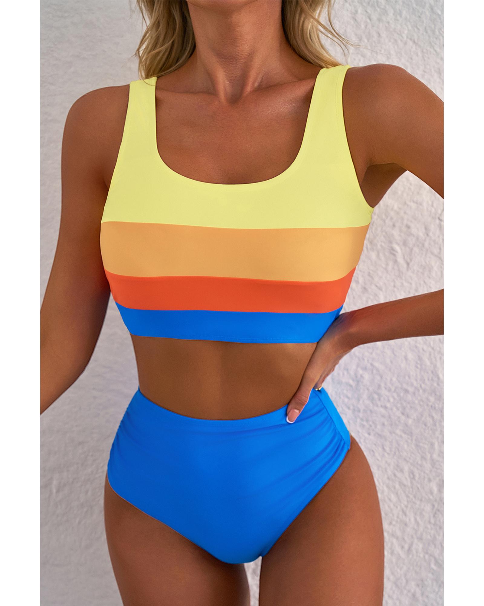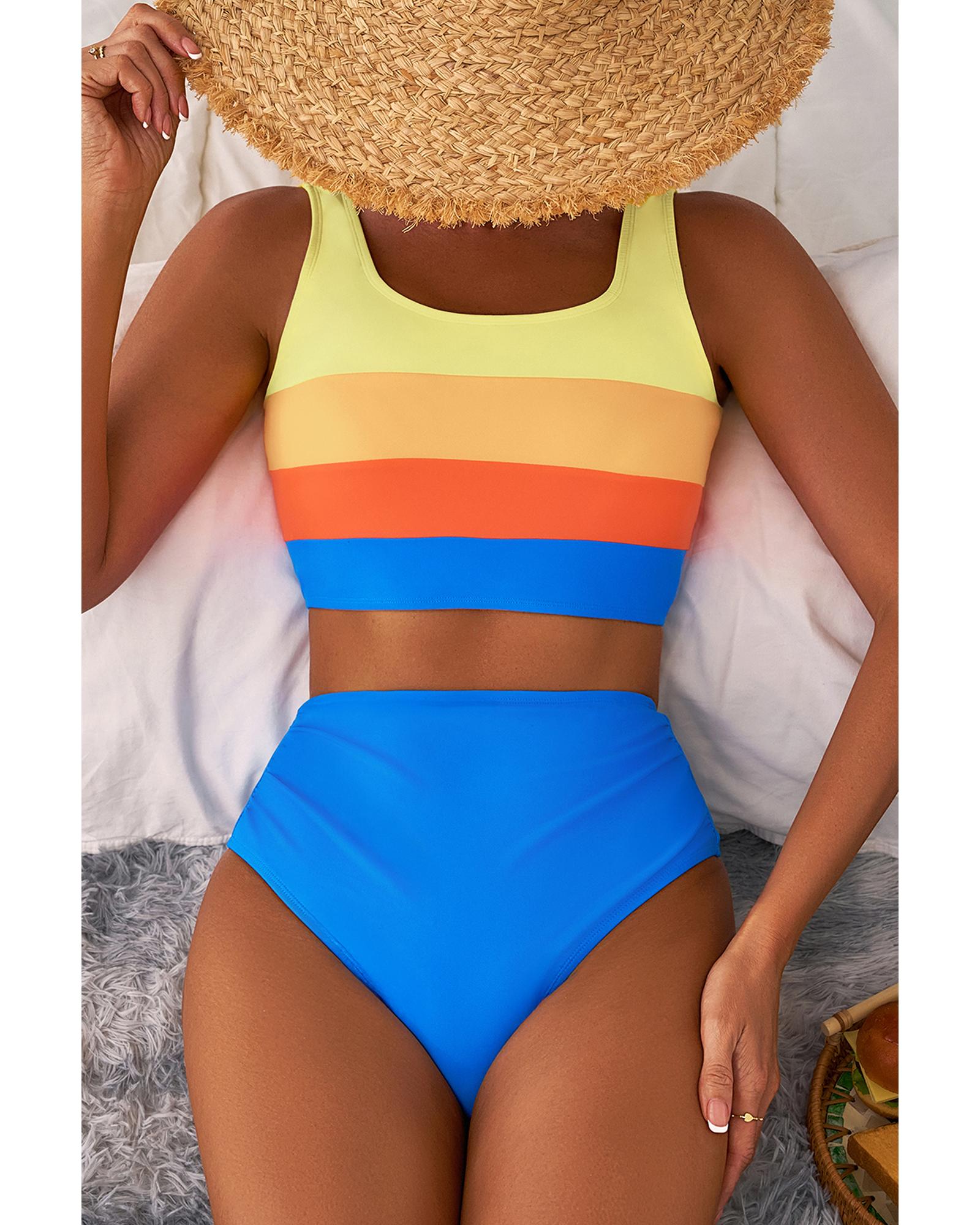 Blue Colorblock Square Neck Top Pleated High Waisted Bikini – L
