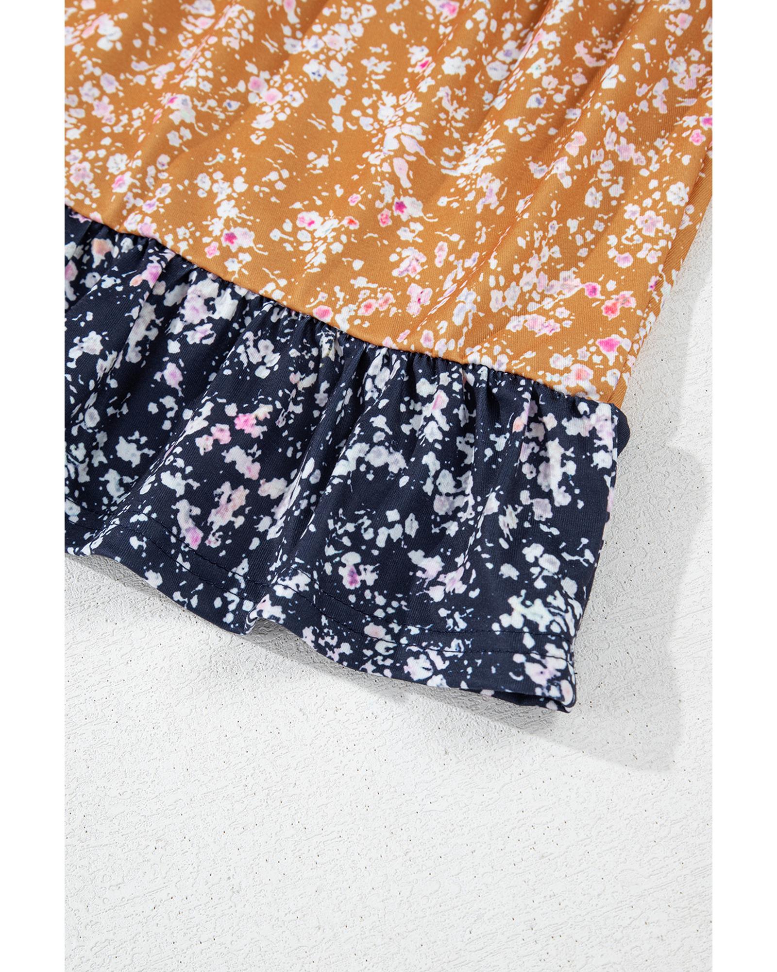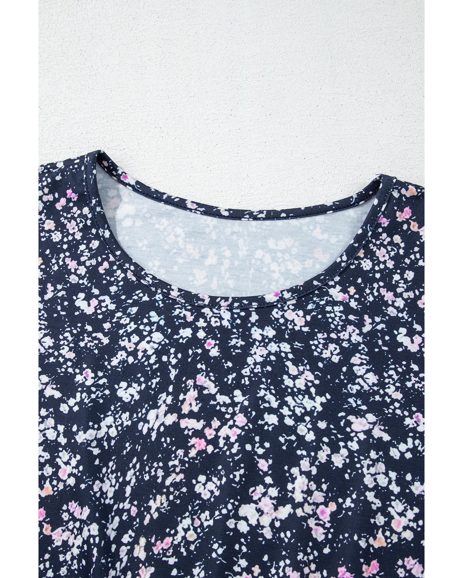 Blue Floral Color Block Patchwork Ruffled Hem Round Neck Blouse – L