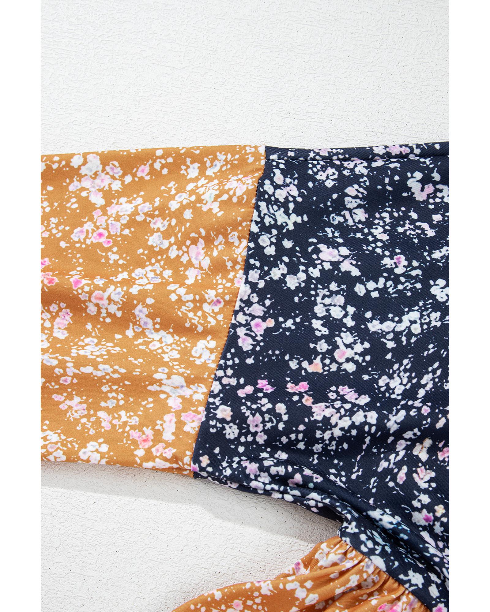 Blue Floral Color Block Patchwork Ruffled Hem Round Neck Blouse – XL