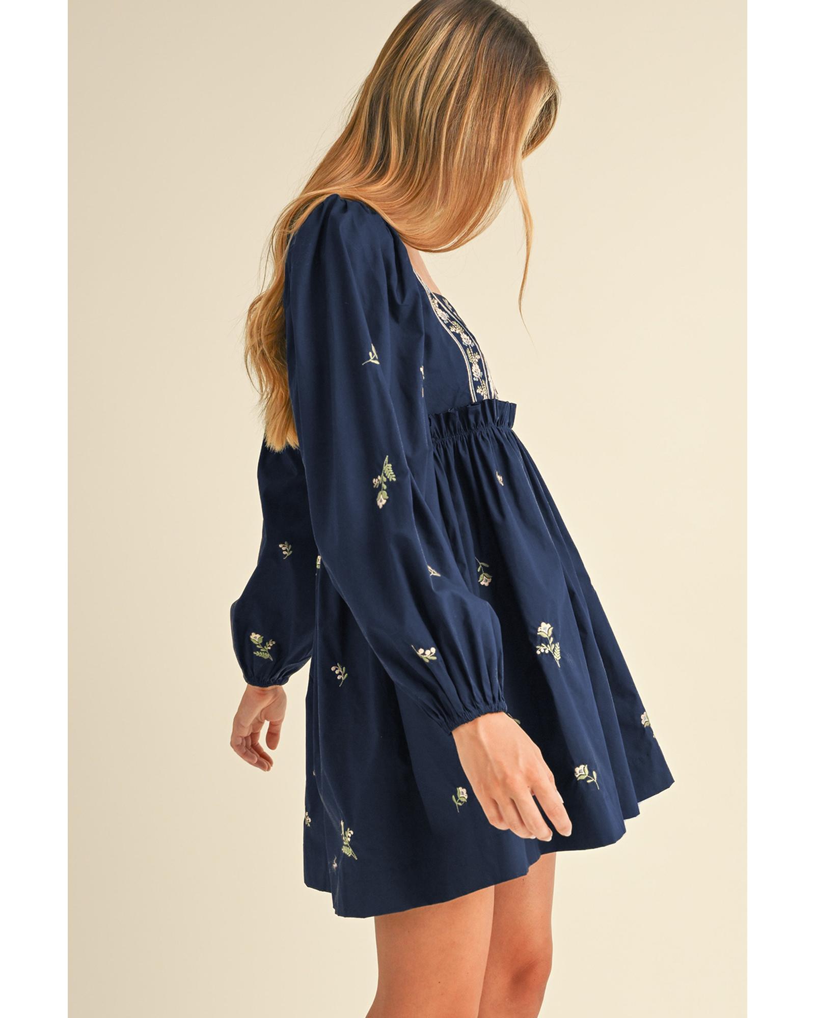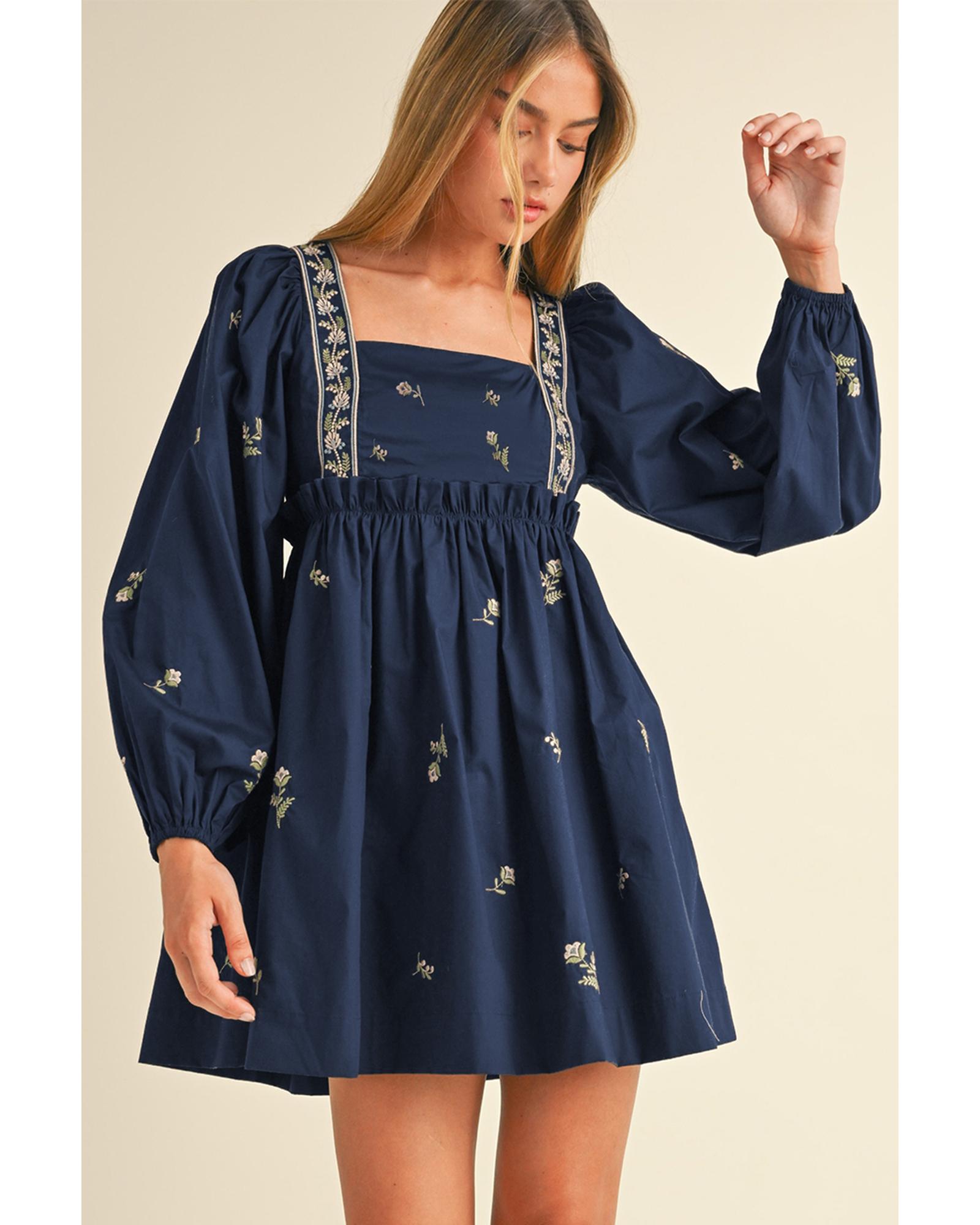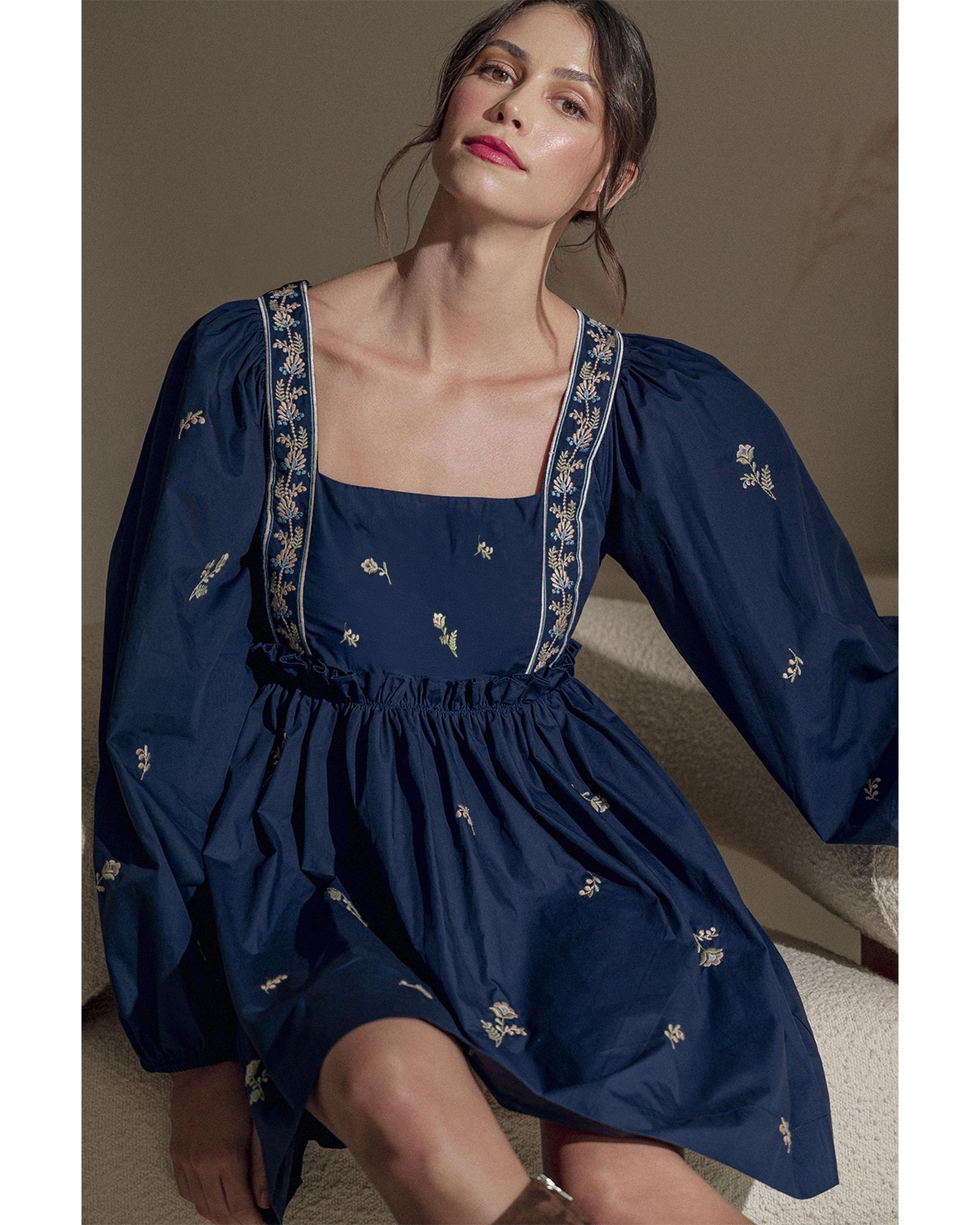 - Blue Floral Embroidered Square Neck Puff Sleeve Ruffled Mini Dress