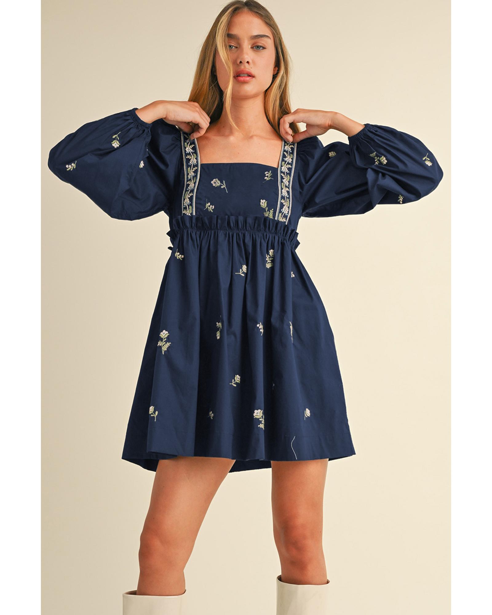 • Blue Floral Embroidered Square Neck Puff Sleeve Ruffled Mini Dress