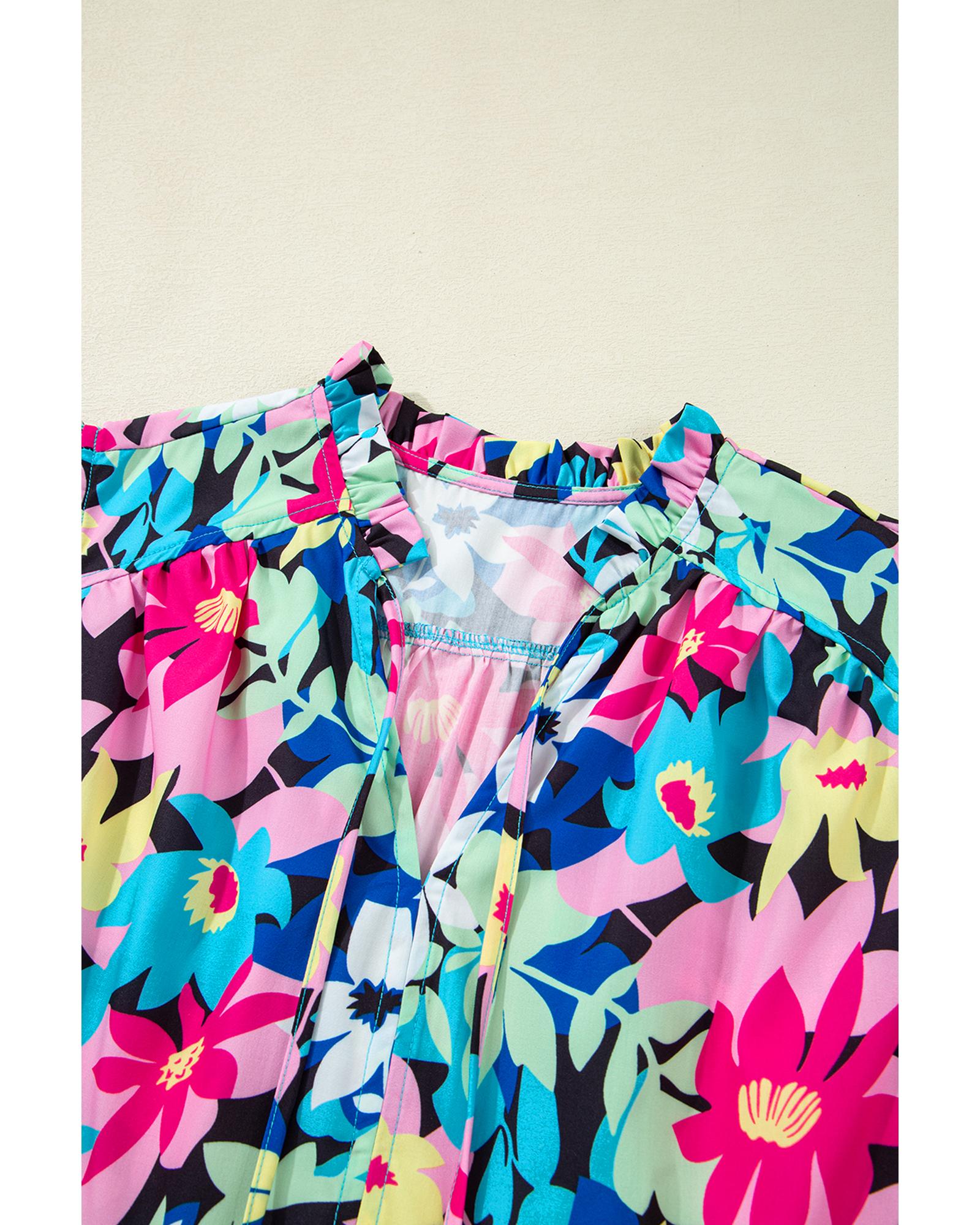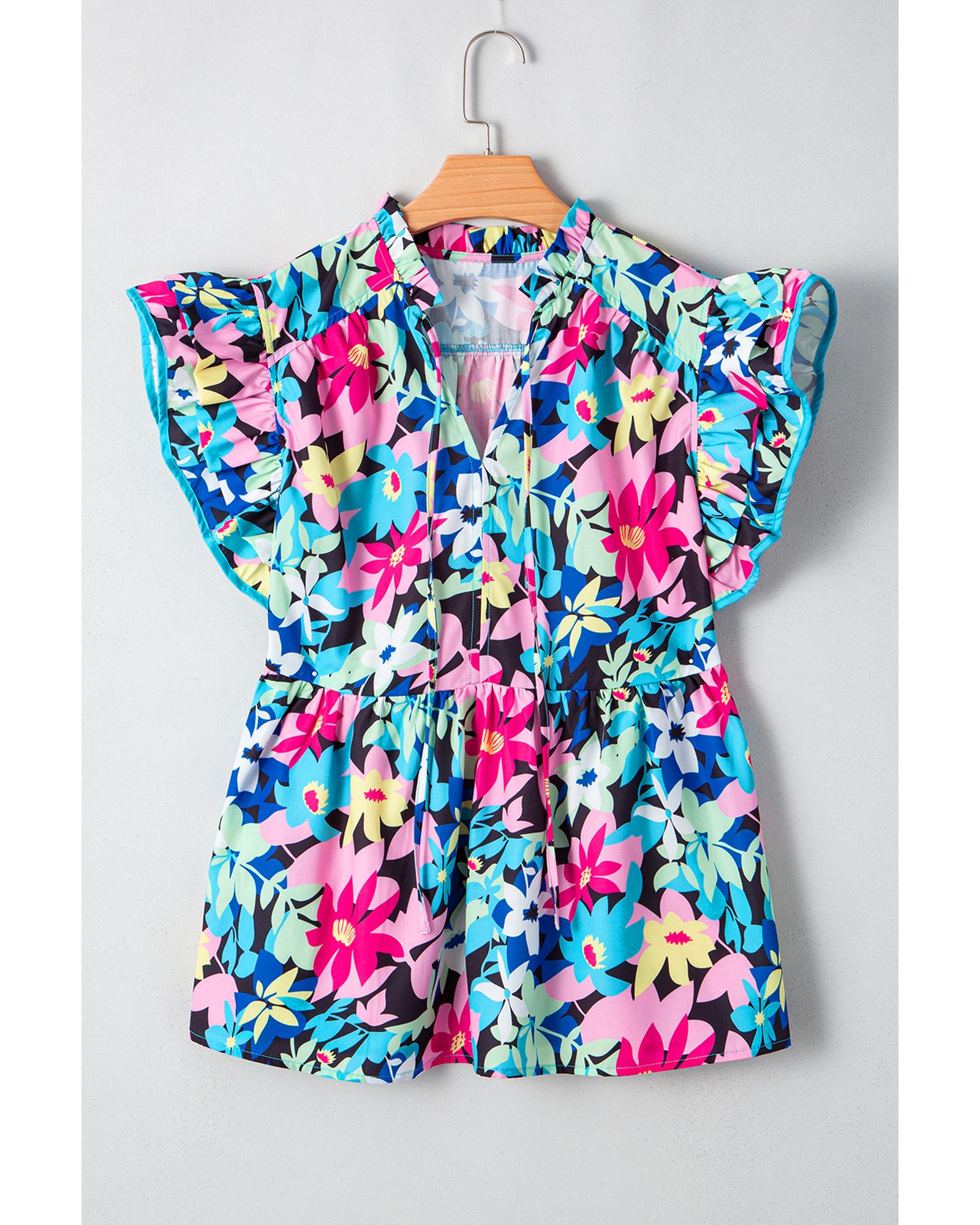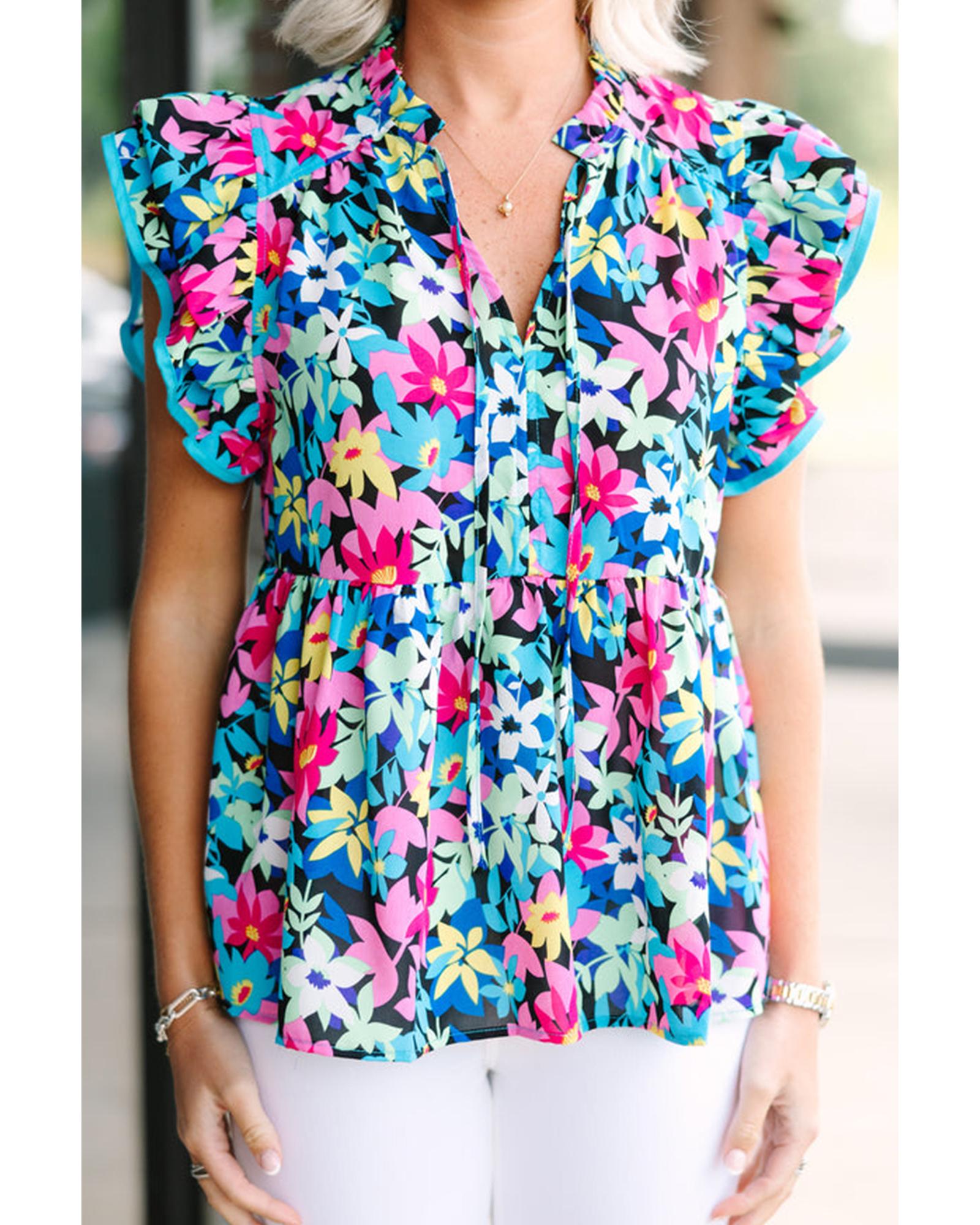 Blue Floral Flutter Sleeve Tied Notched Neck Plus Size Blouse – 4X
