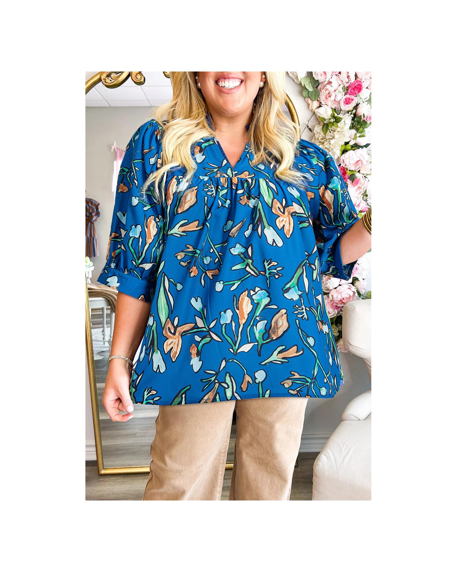 Blue Floral Notched V Neck Half Sleeve Plus Size Blouse – 3X