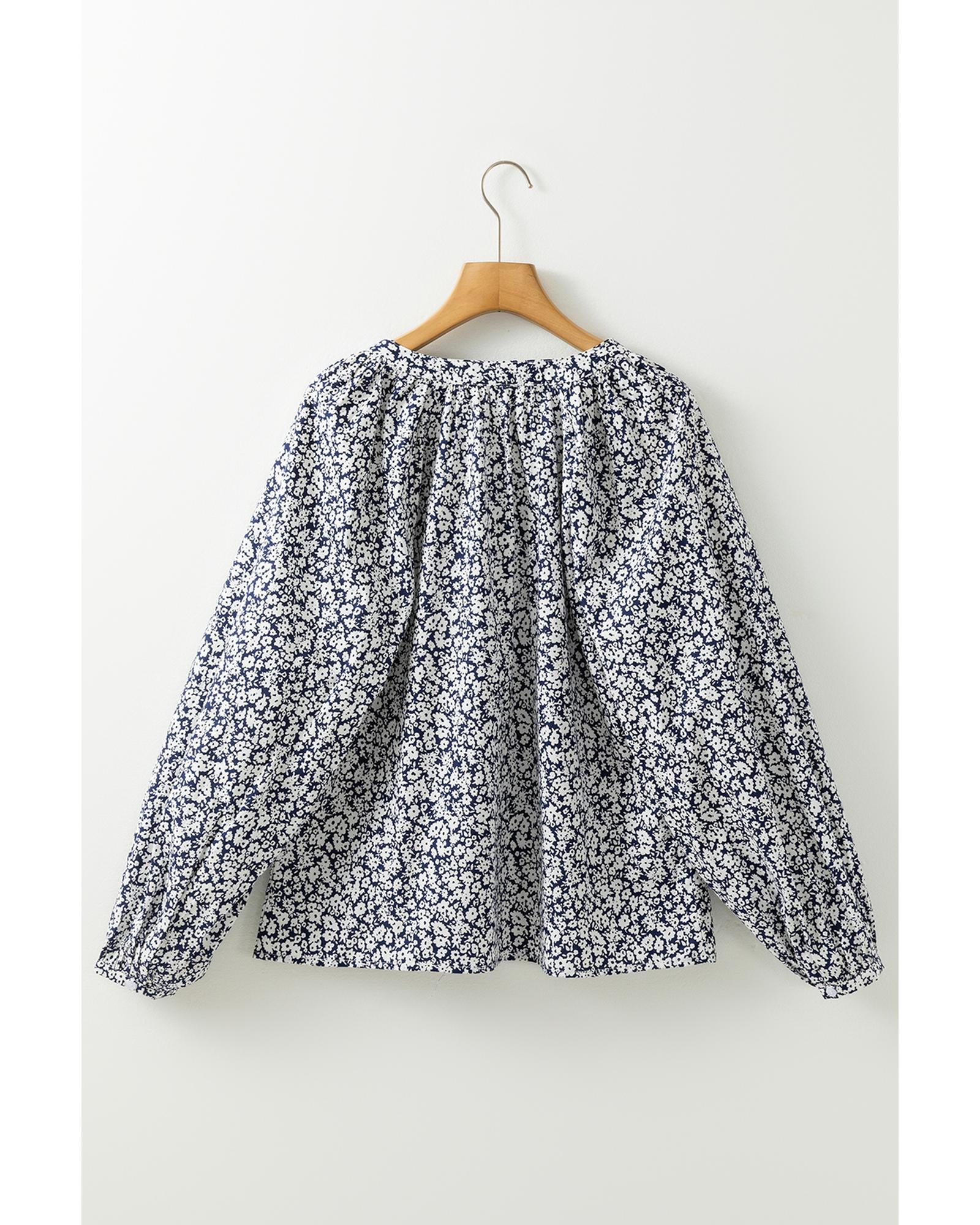 Blue Floral Print Notched V Neck Puff Sleeve Blouse – S