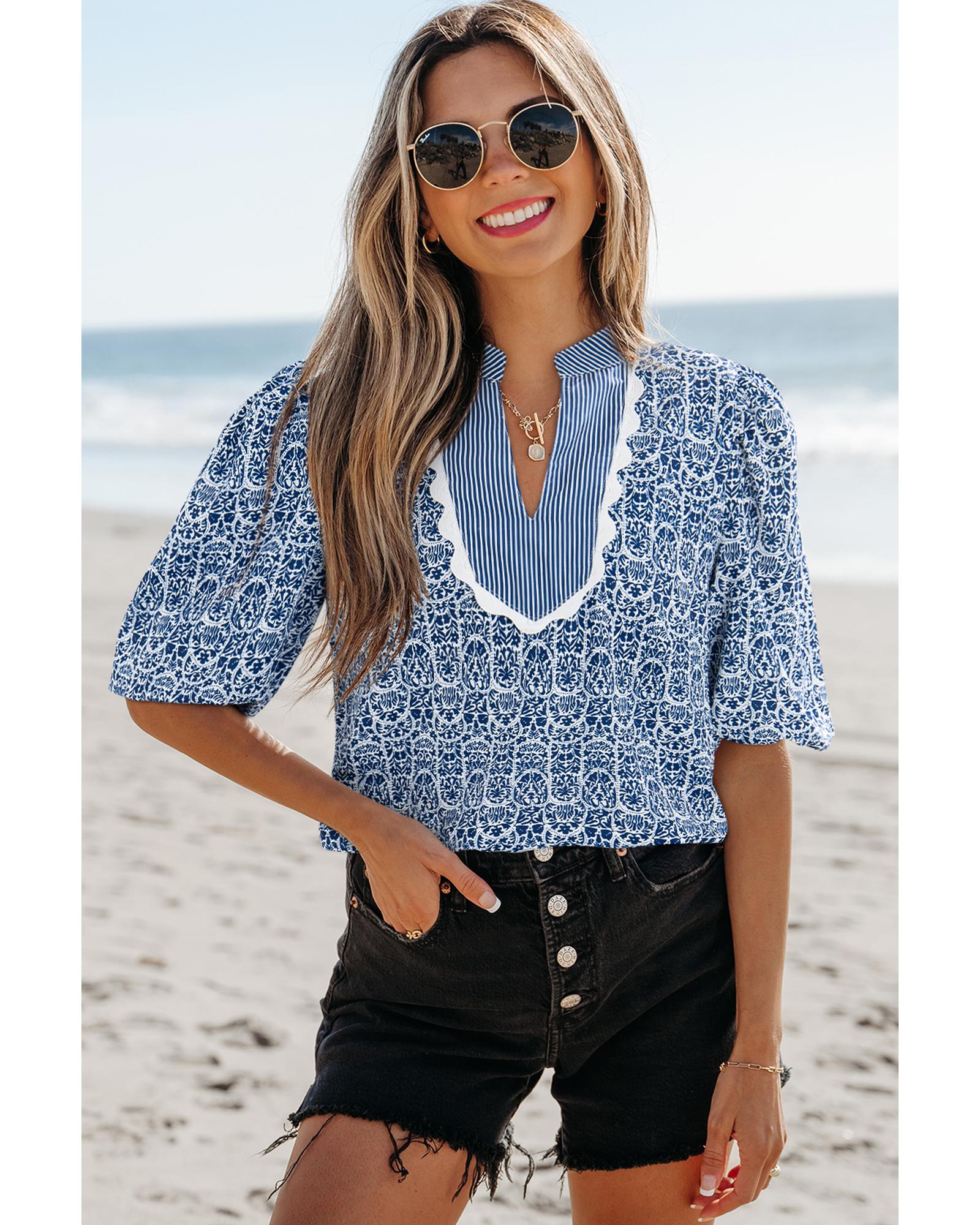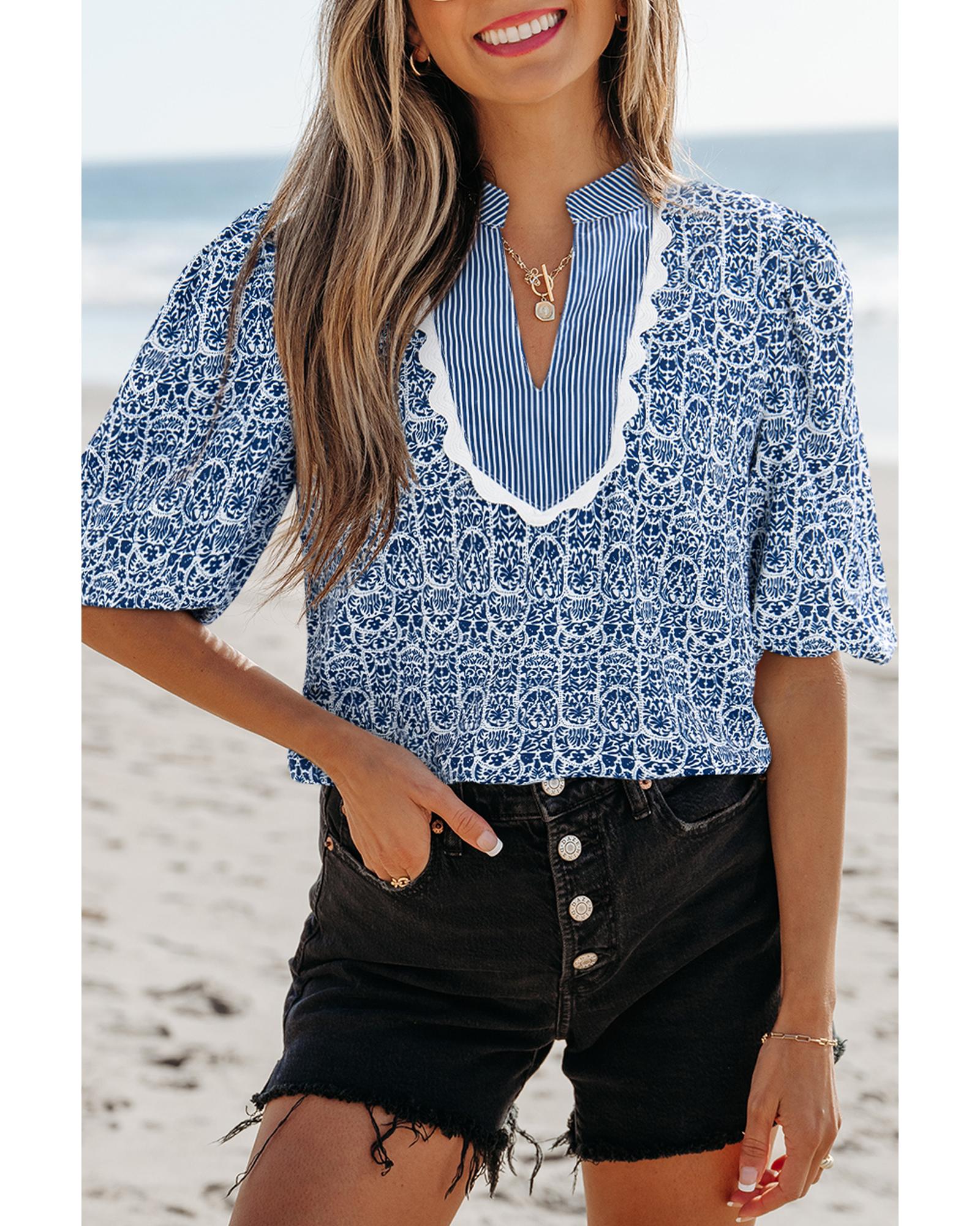Blue Floral Striped Print Contrast Ric-rac Puff Sleeve Top – S