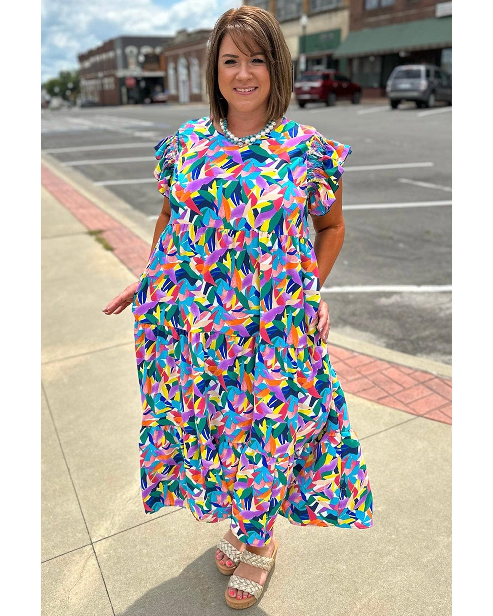 Blue Geometric Print Ruffled Short Sleeve Plus Size Tiered Maxi Dress – 3X
