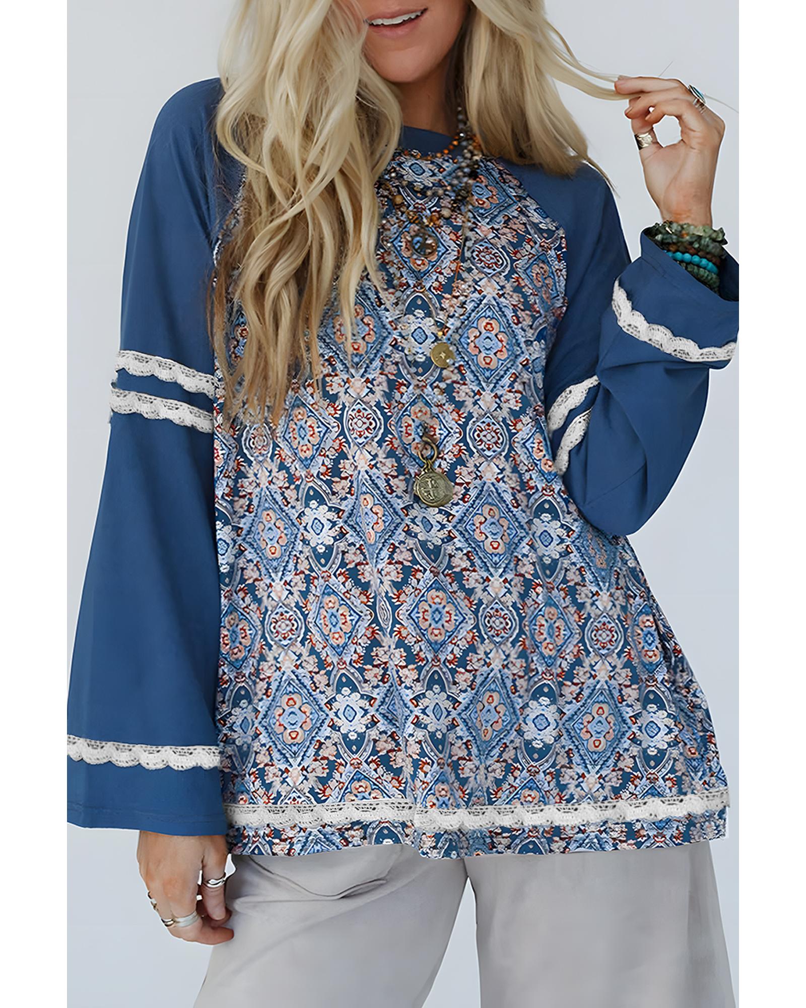 Blue Geometric Printed Lace Patchwork Ric Rac Raglan Long Sleeve Top – M
