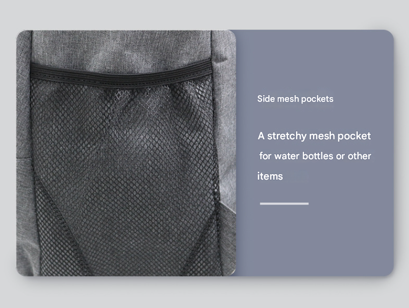 - Two elasticated side mesh pockets, ideal for water bottles, umbrellas, or snacks.