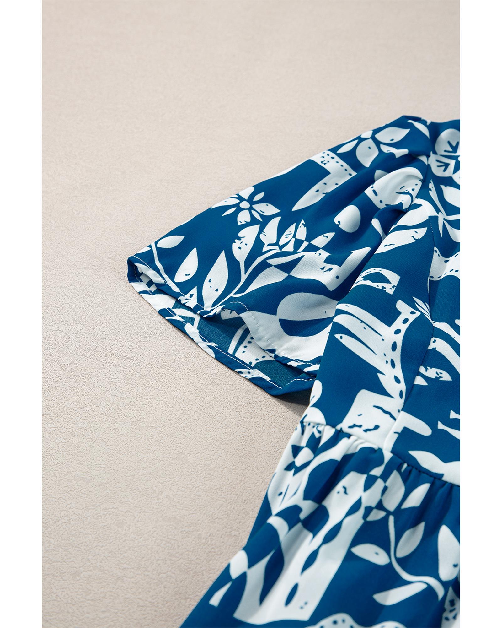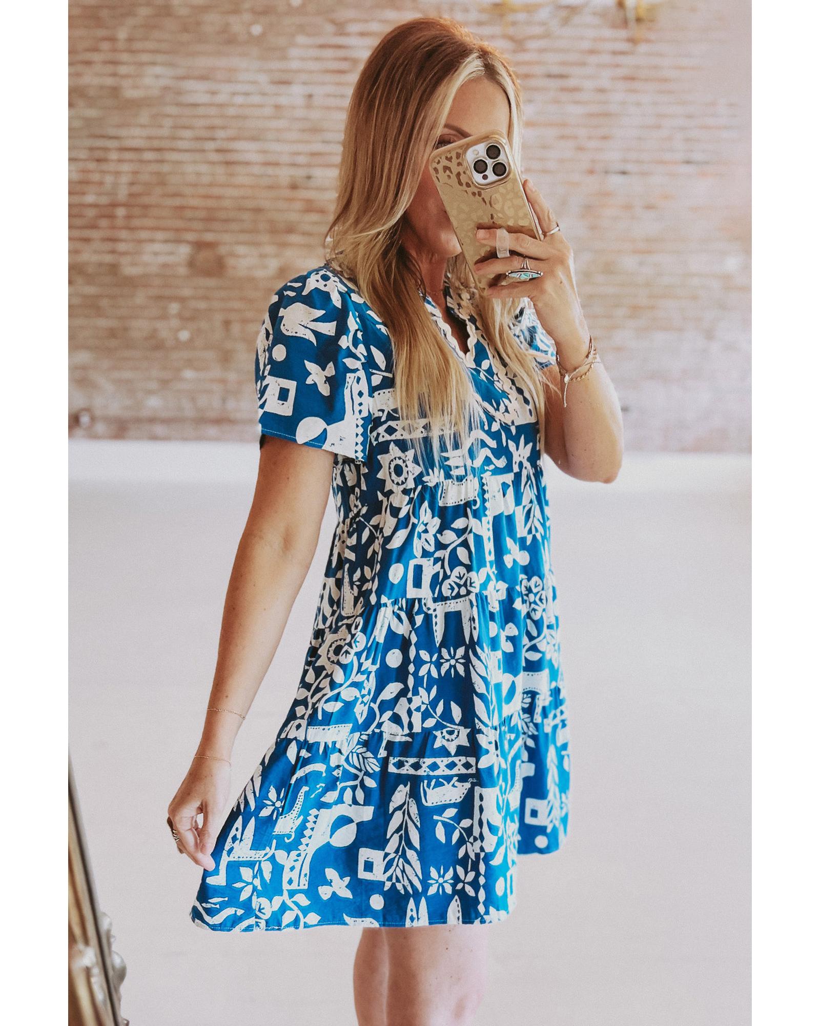- Blue Ricrac Trim Split Neck Floral Loose Dress