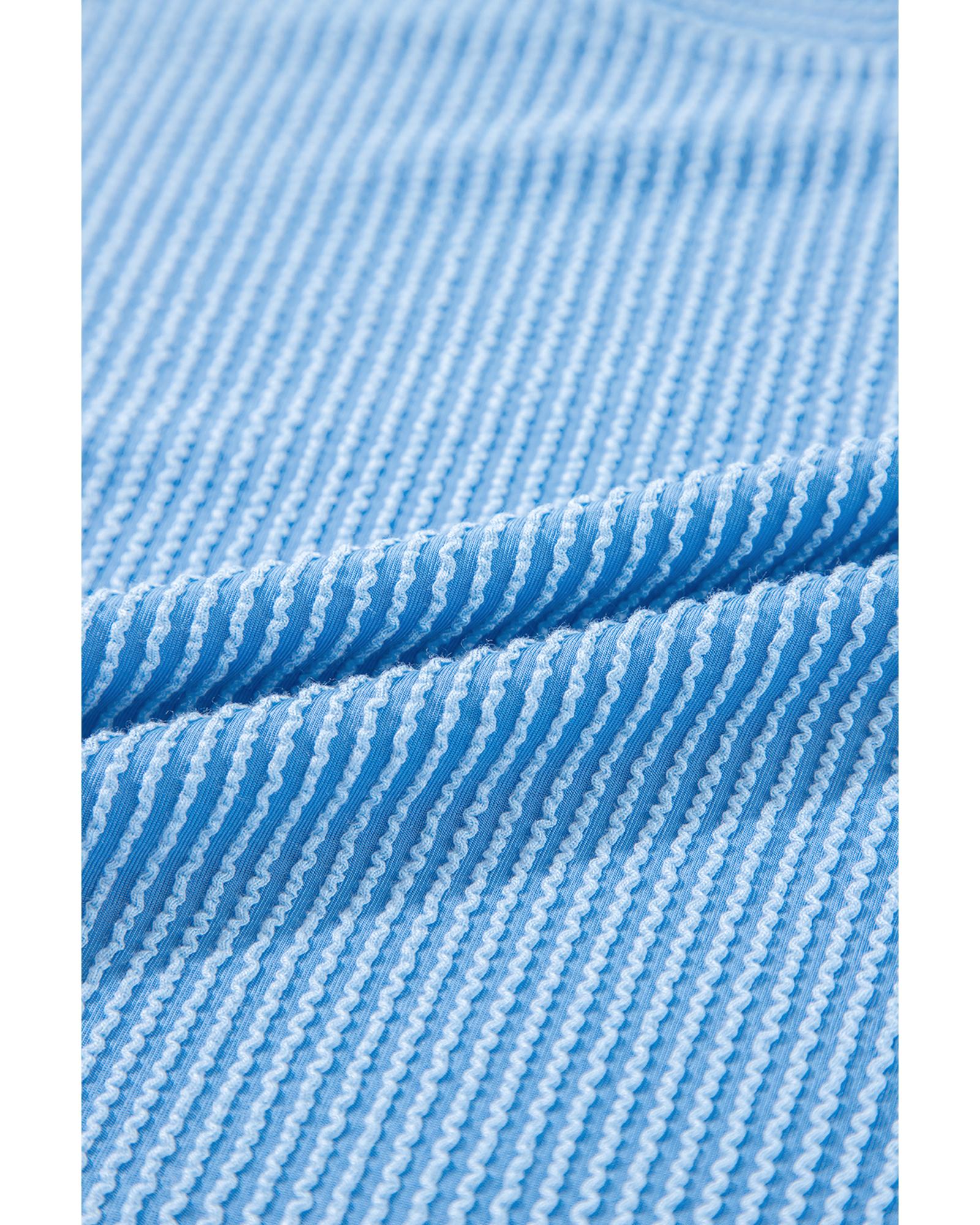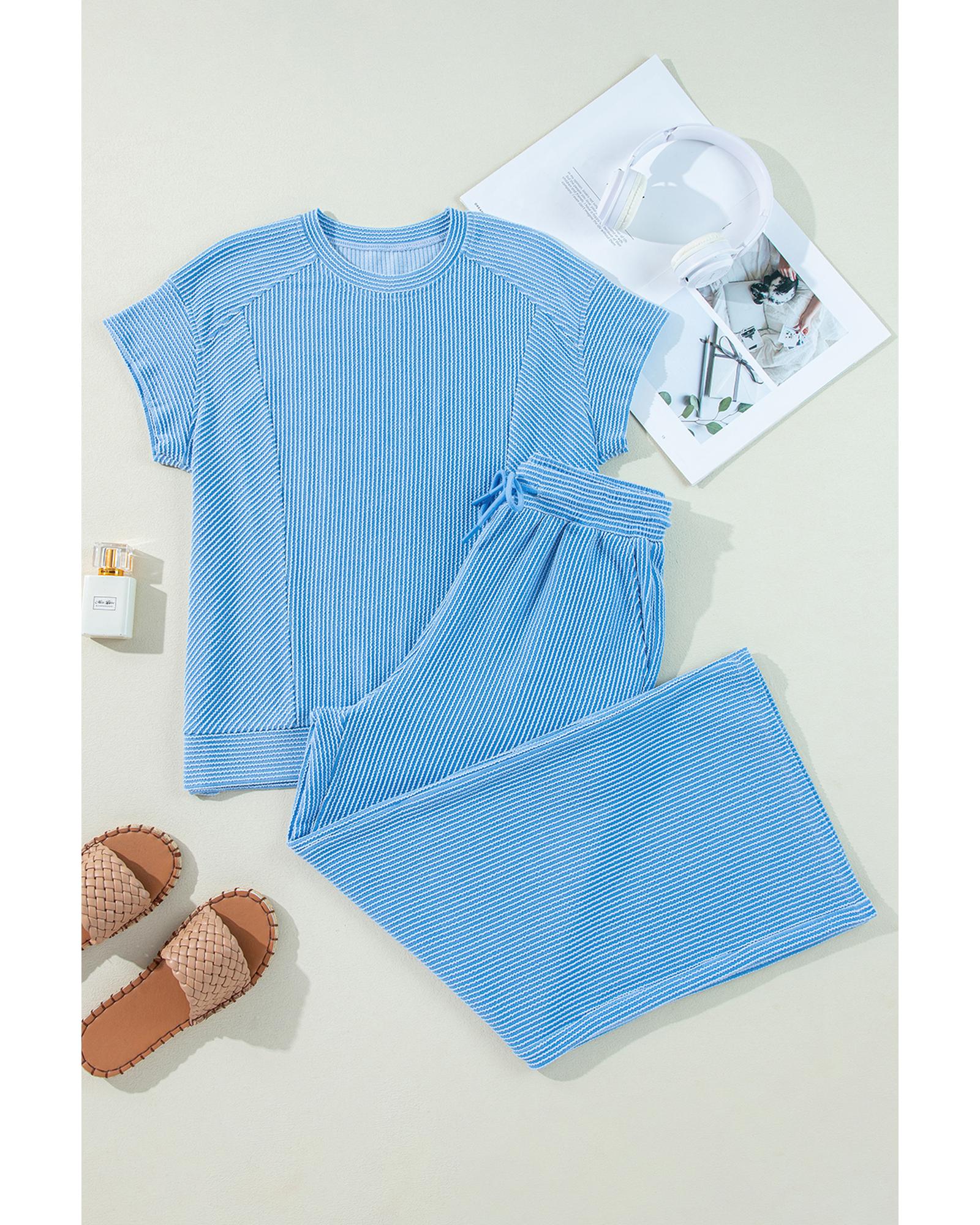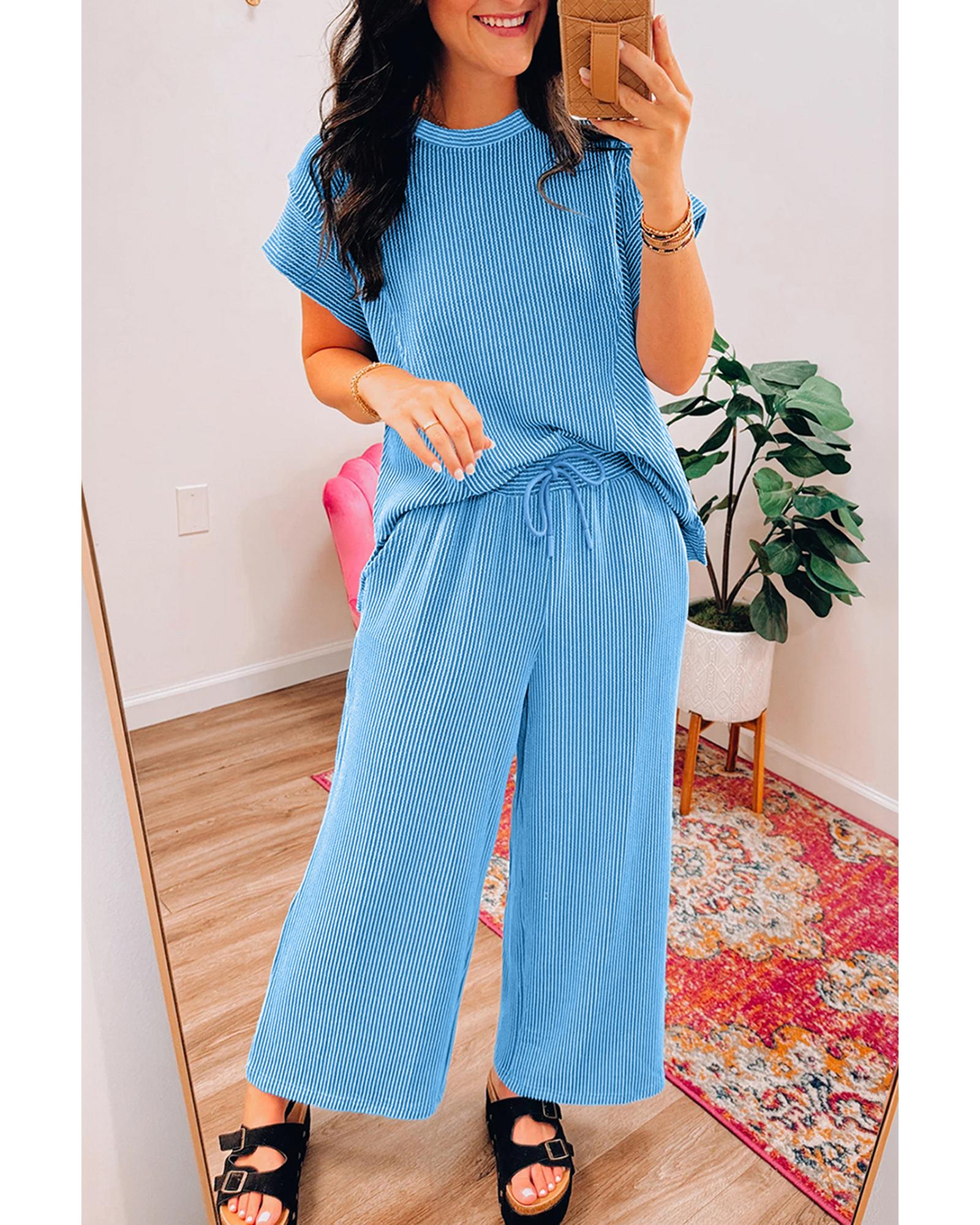 Blue Solid Corded Knit Short Sleeve T Shirt and Wide Leg Pants Set – S