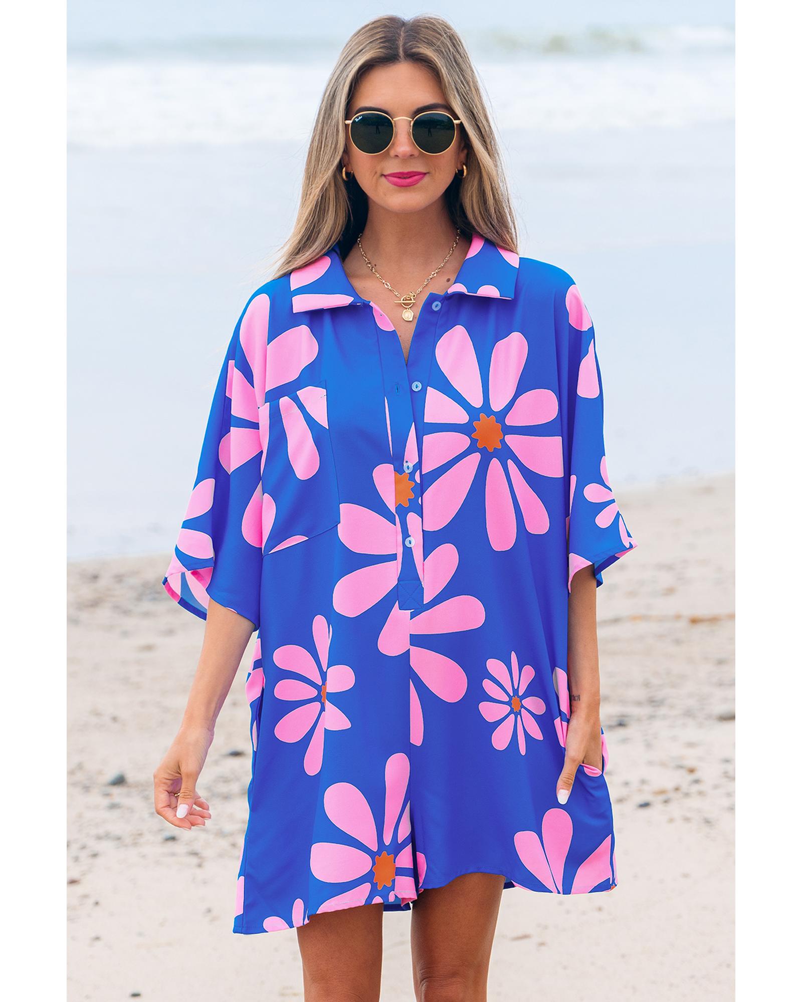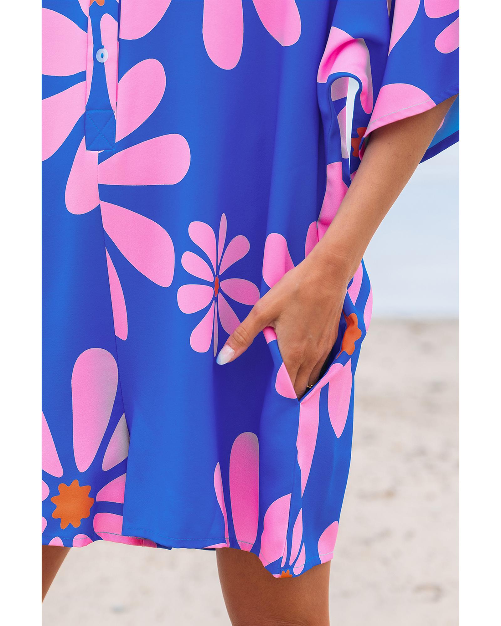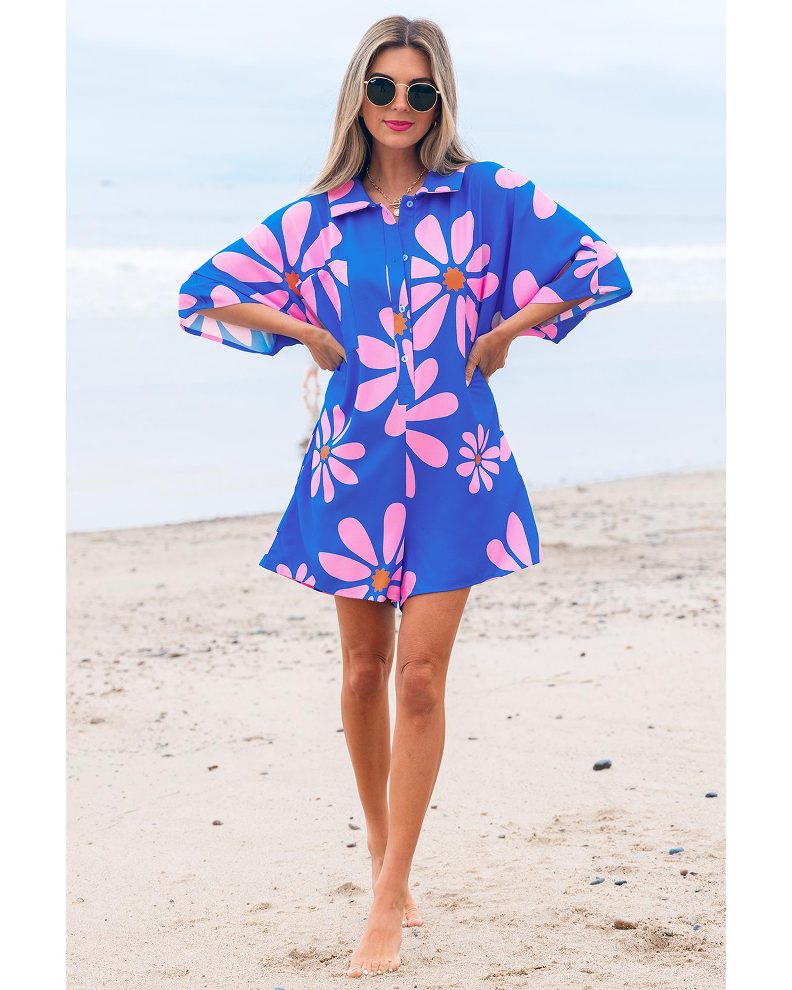 • Blue Summer Flower Print Shirt Collar Button Front Loose Romper