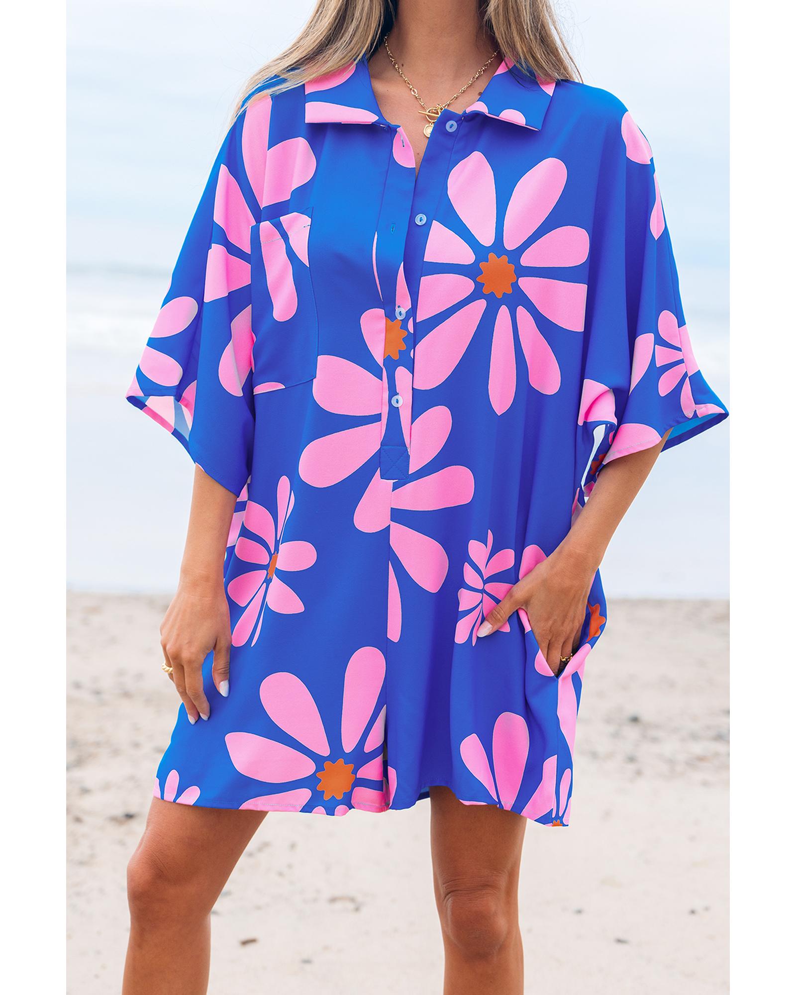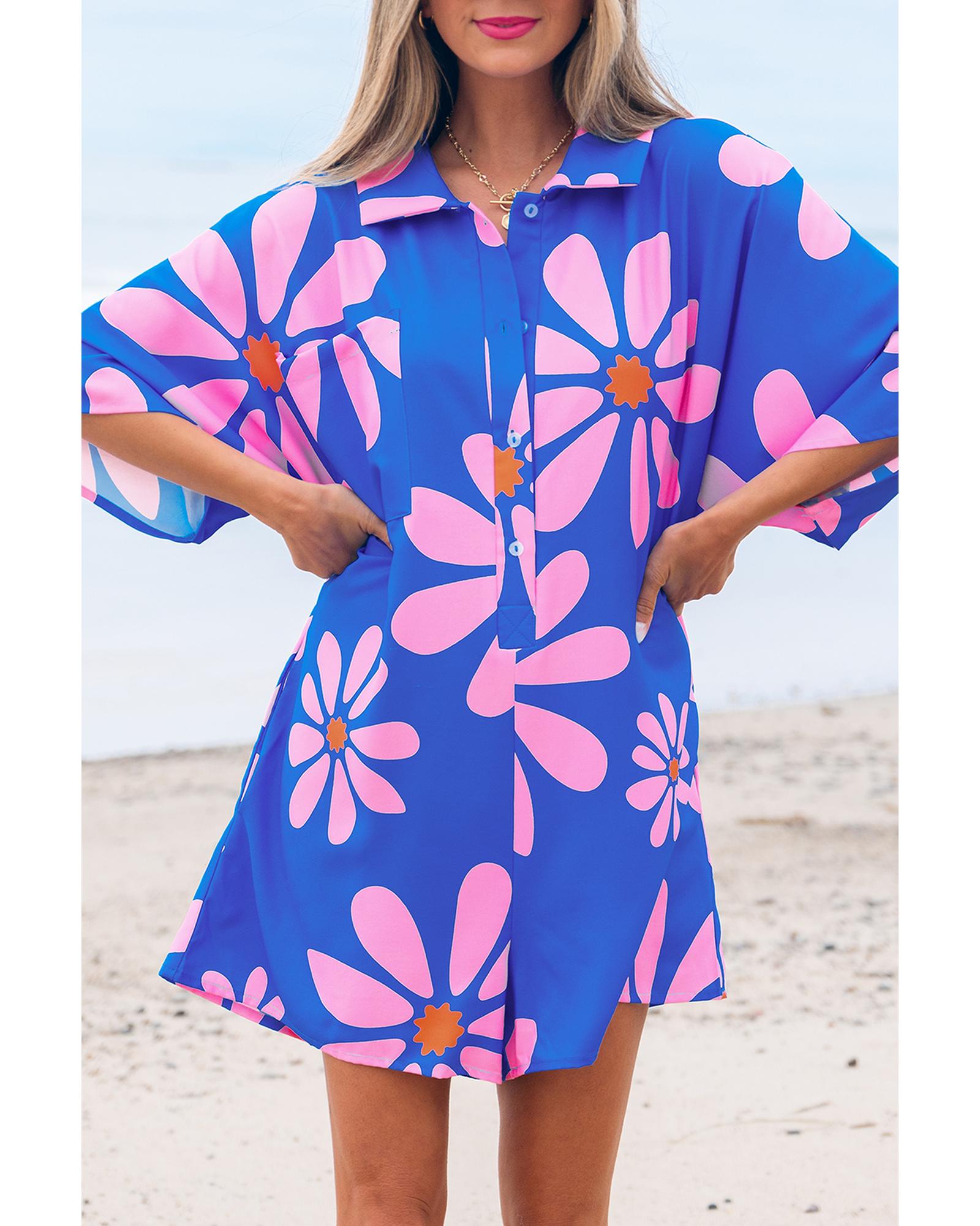 - Blue Summer Flower Print Shirt Collar Button Front Loose Romper