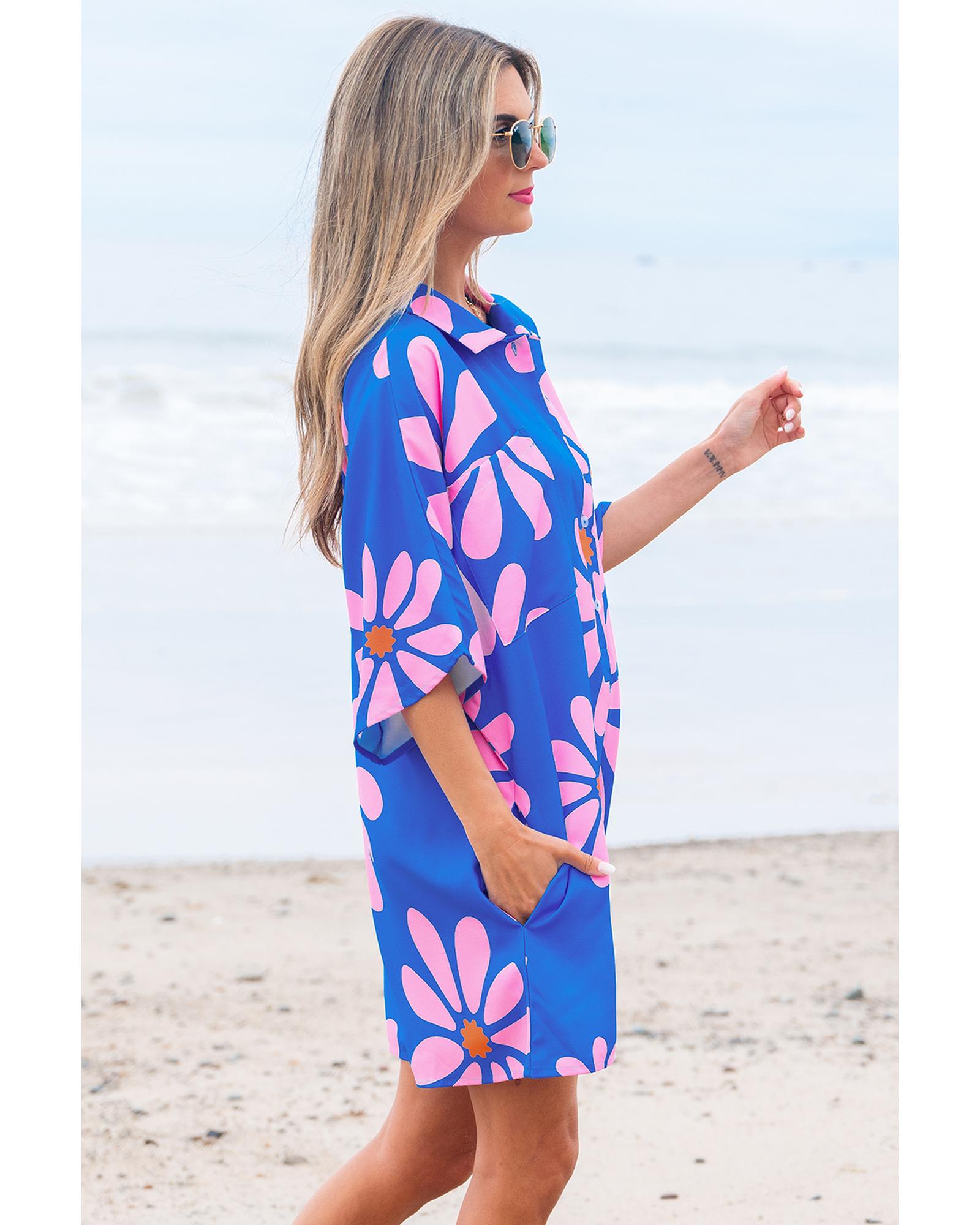 Blue Summer Flower Print Shirt Collar Button Front Loose Romper – XL