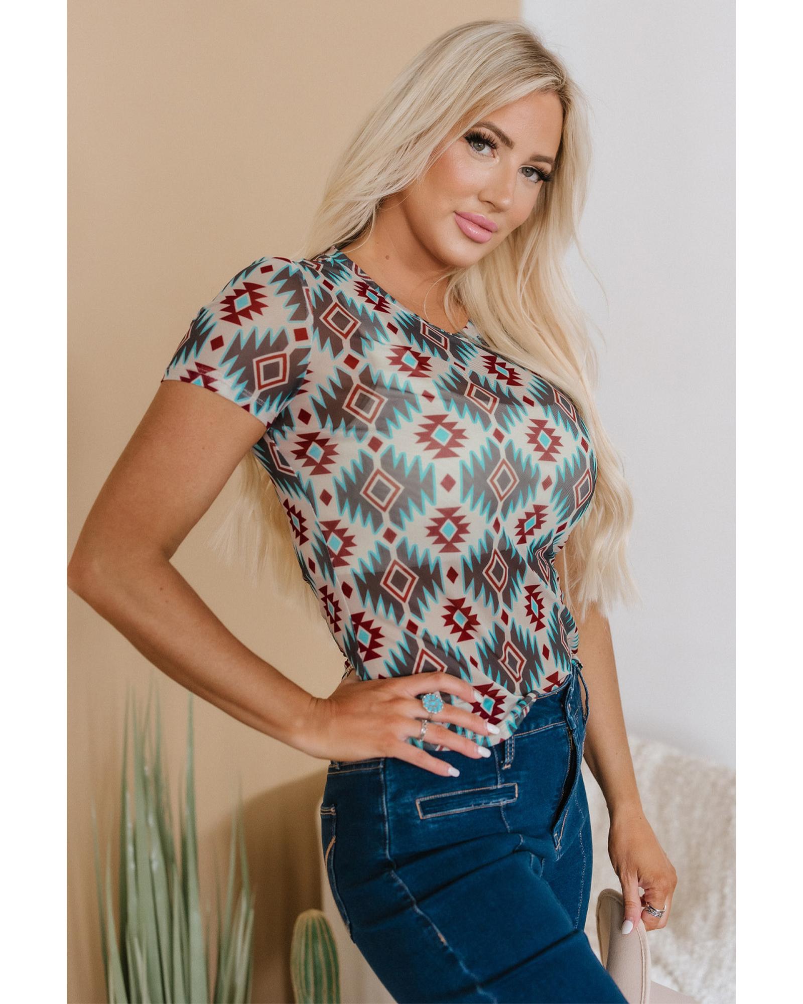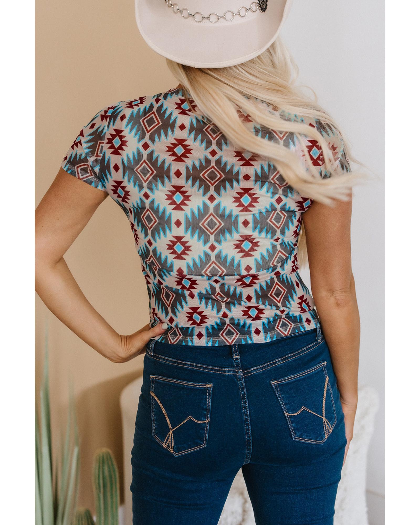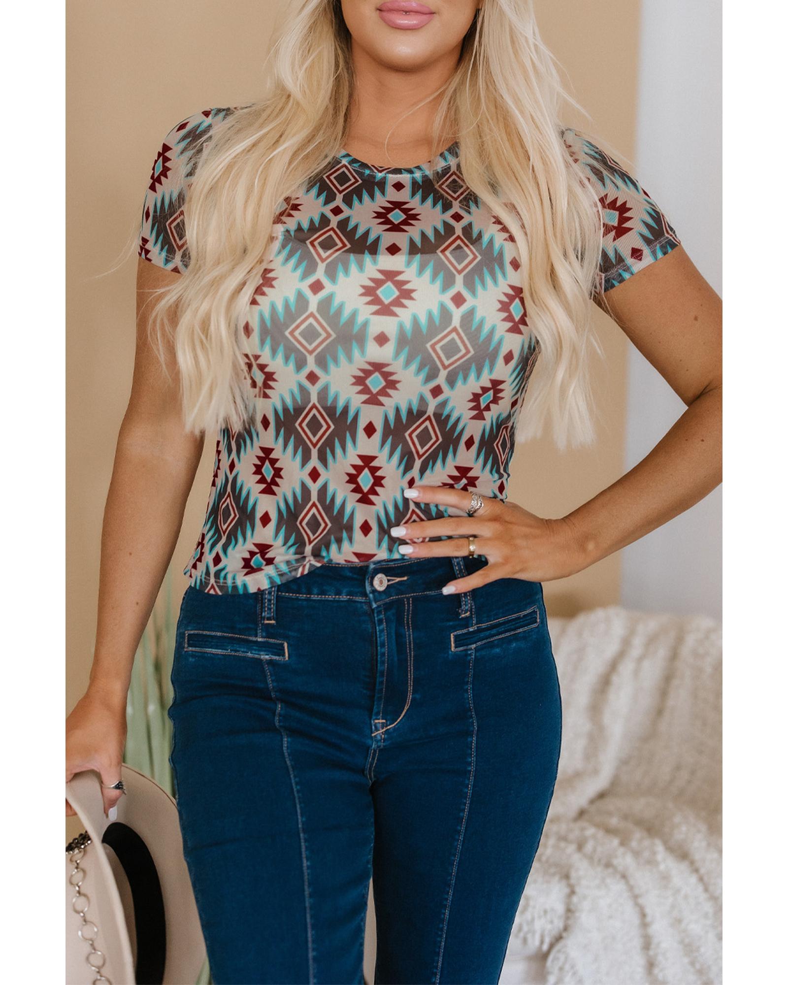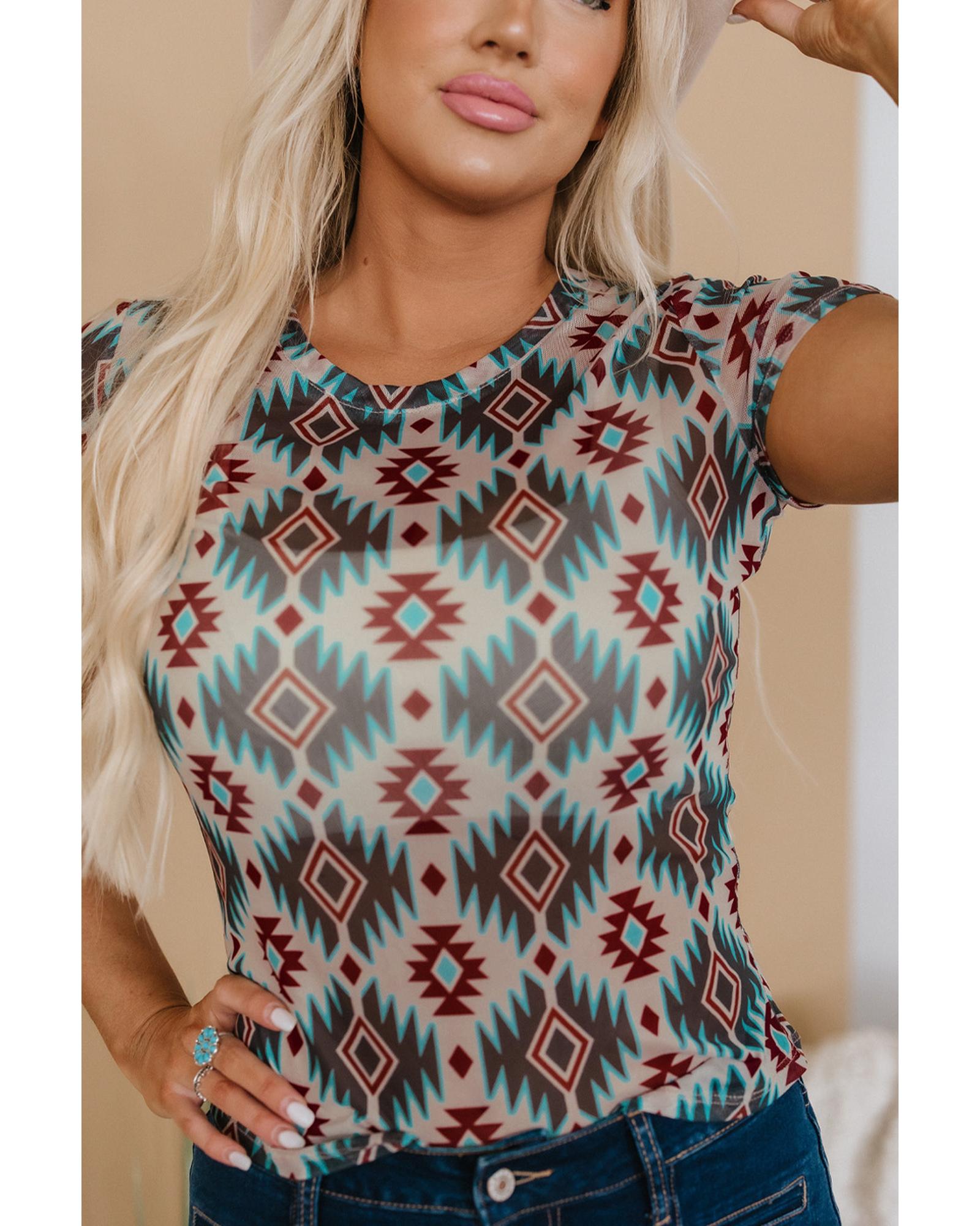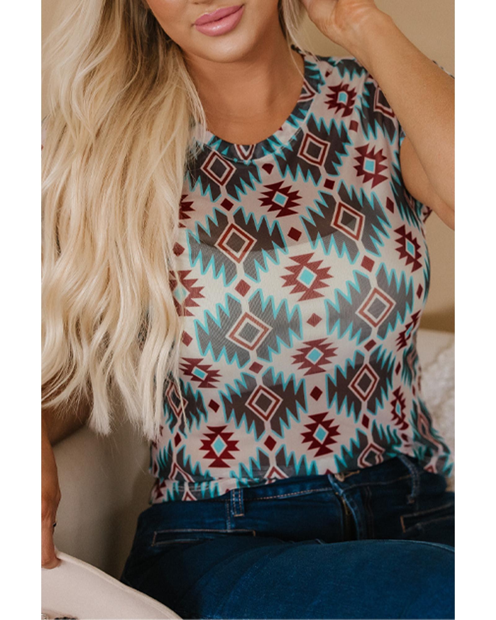 Blue Western Aztec Print Mesh Slim T Shirt – L