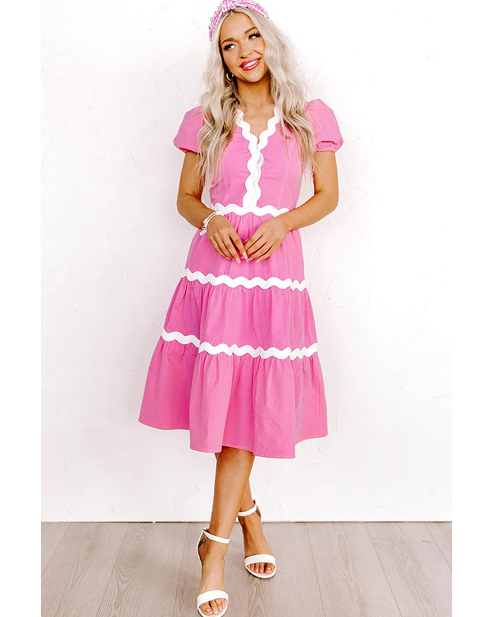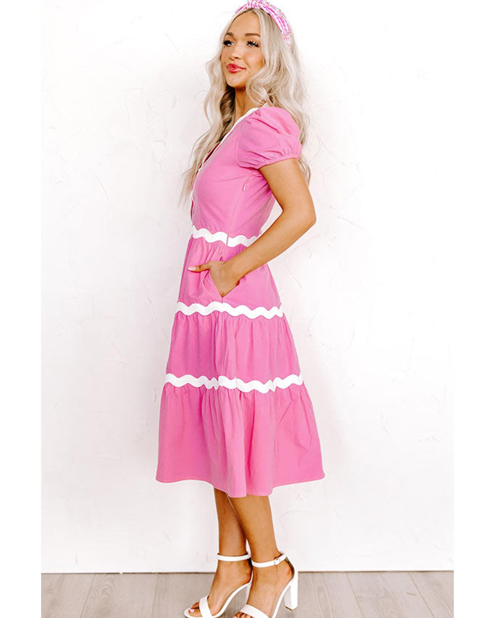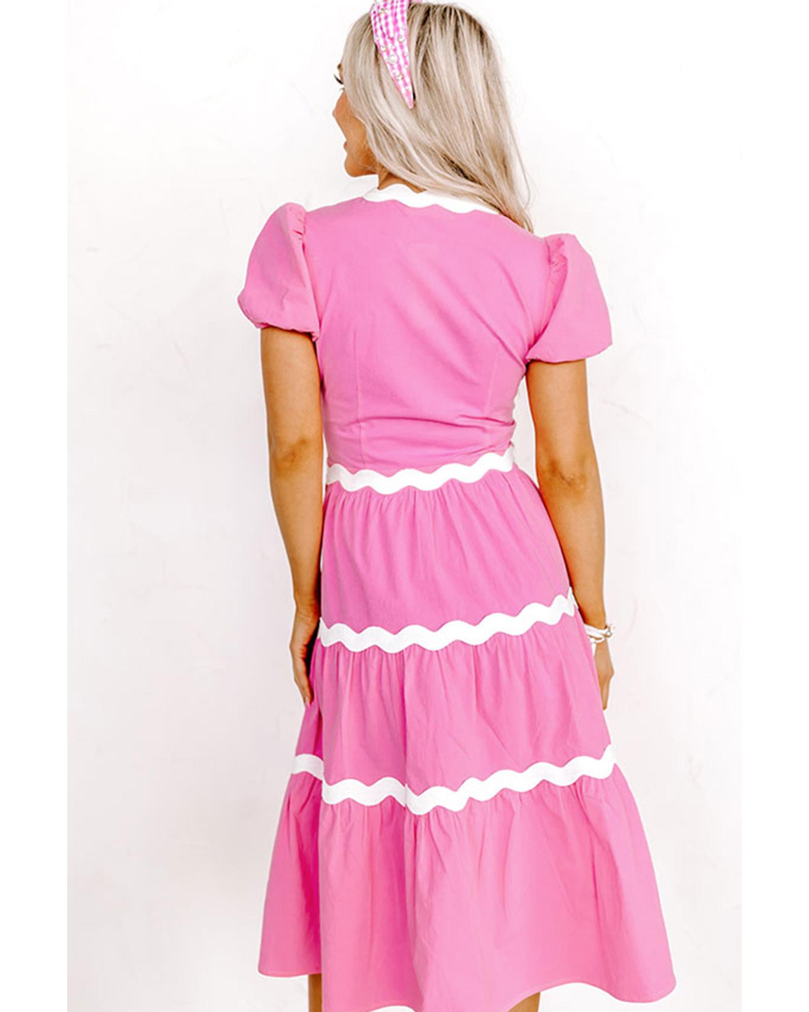Bonbon Ric Rac Trim Short Puff Sleeve Flowy Midi Dress – L