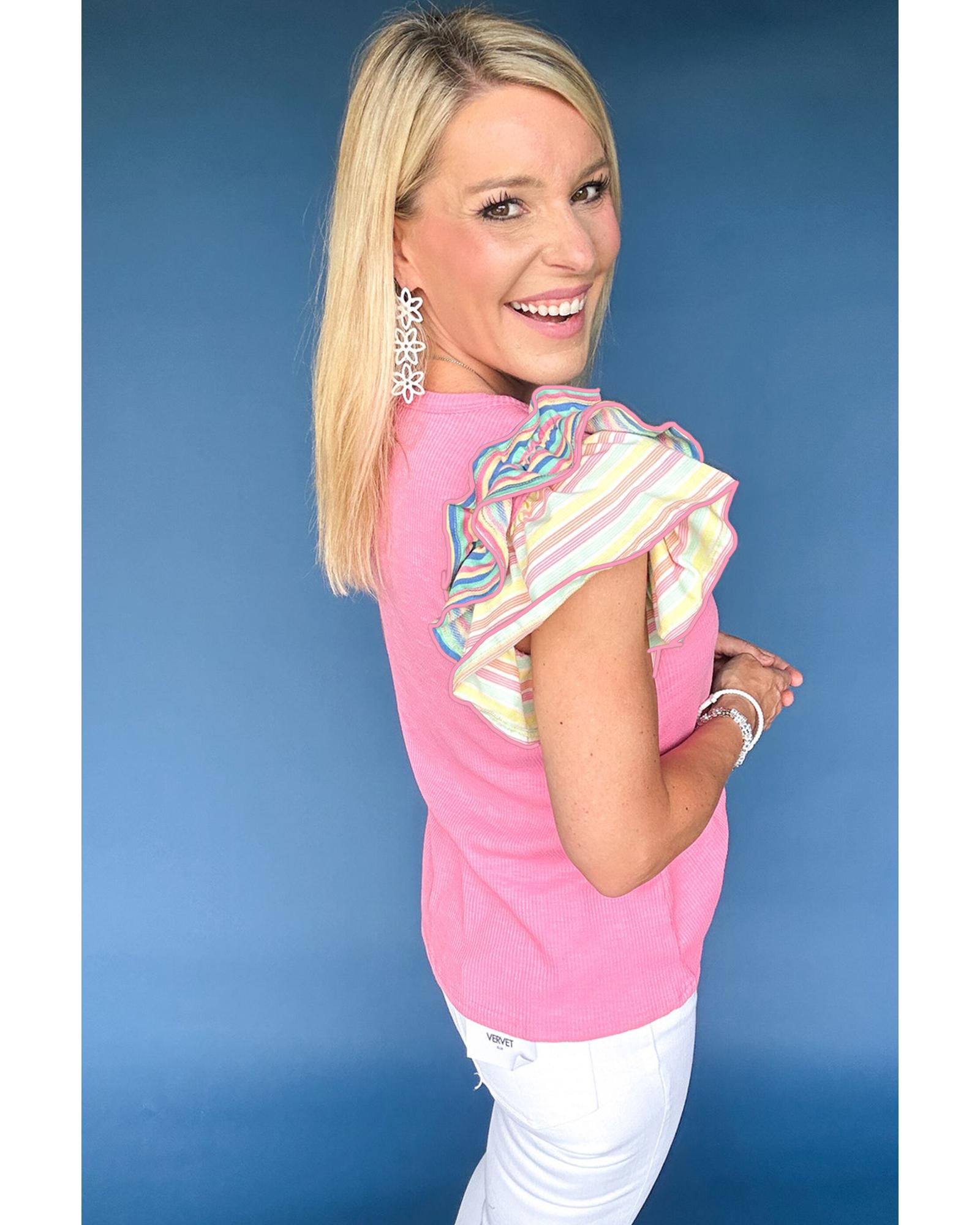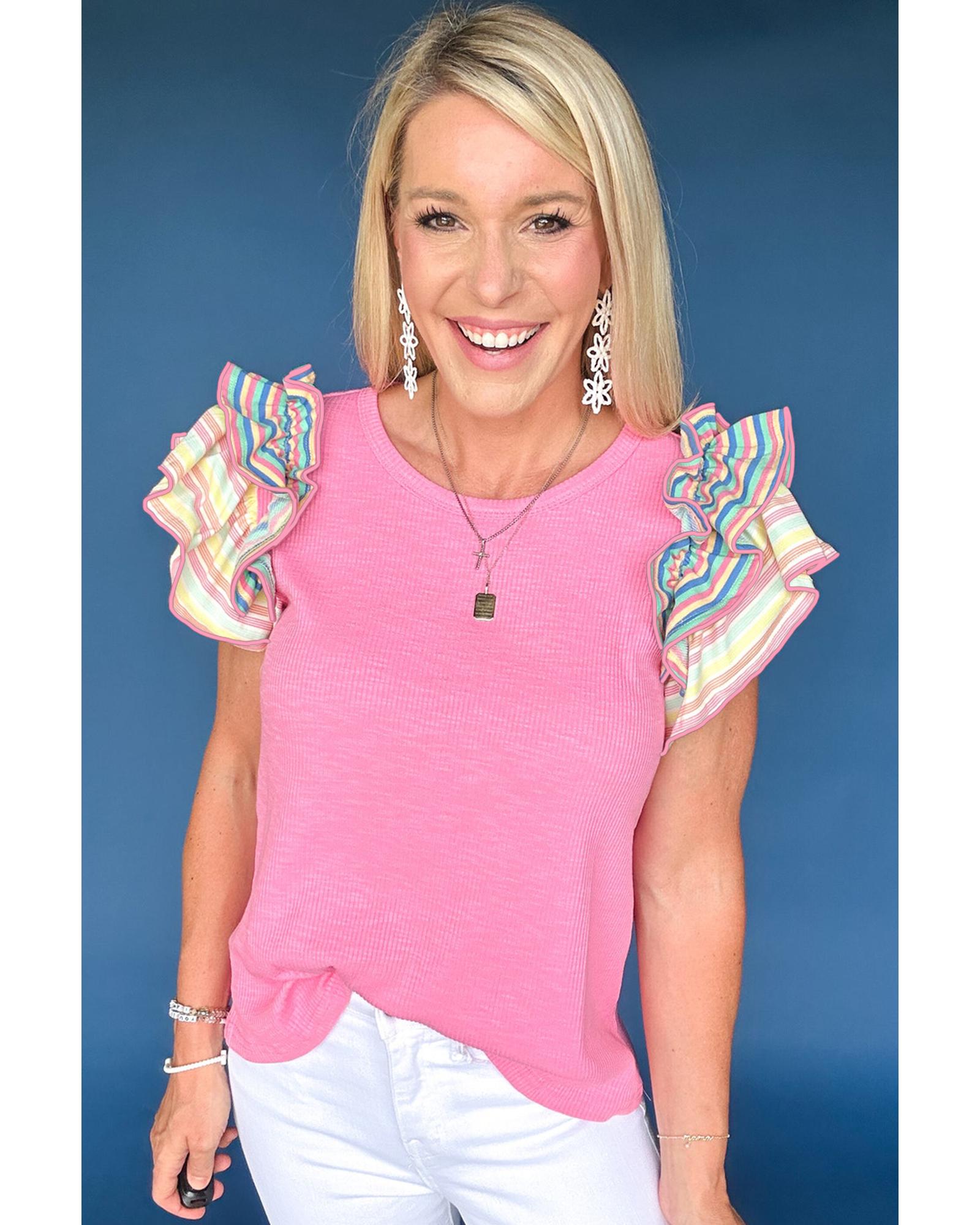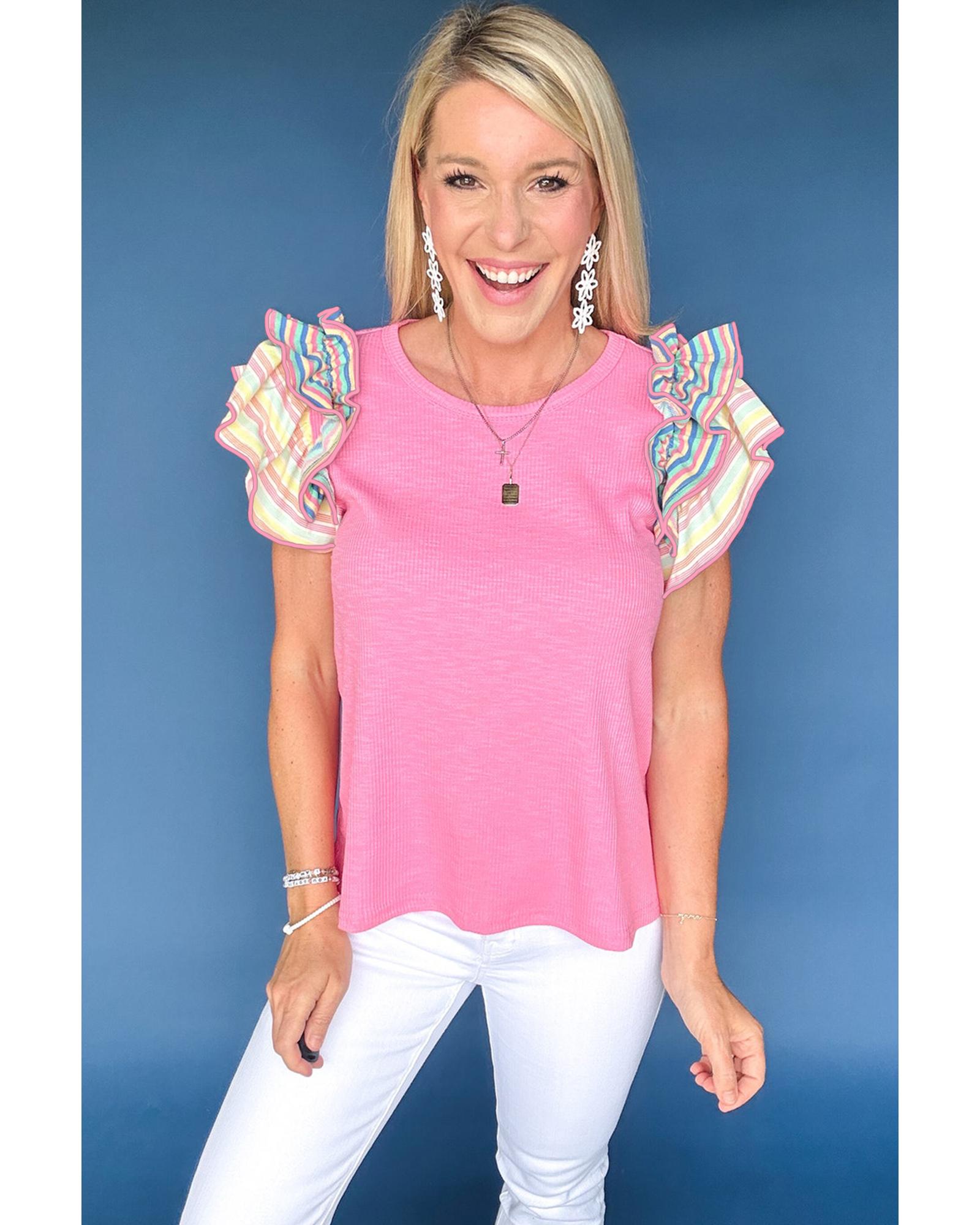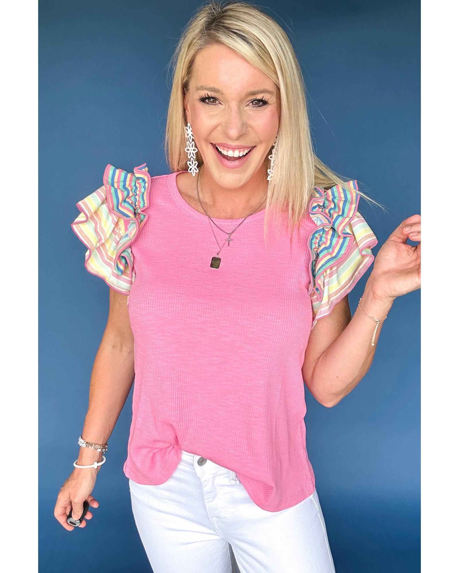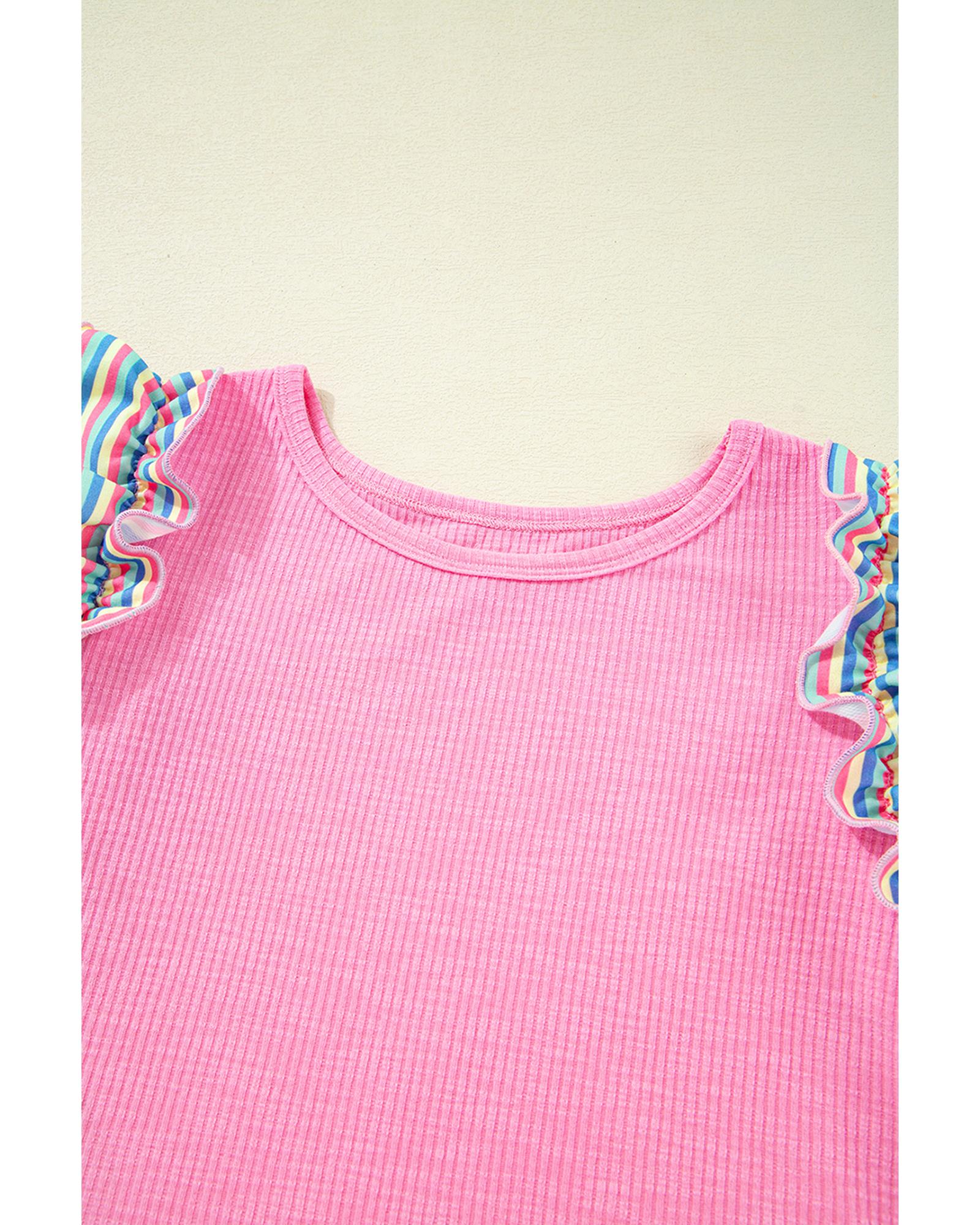 Bonbon Striped Ruffle Flutter Sleeve Ribbed Blouse – L
