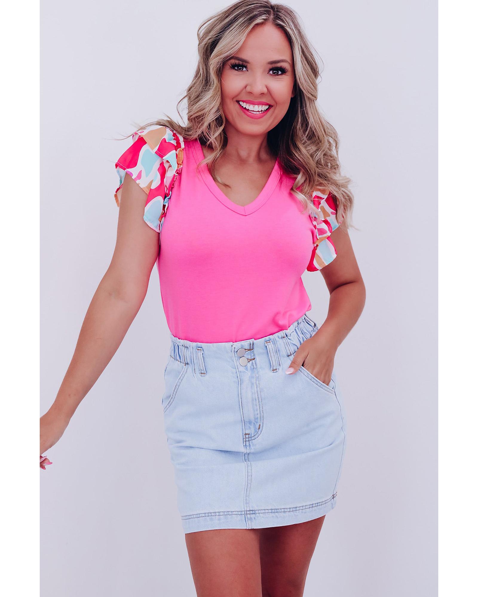 Bonbon V Neck Printed Ruffle Sleeve Patchwork T-shirt – M