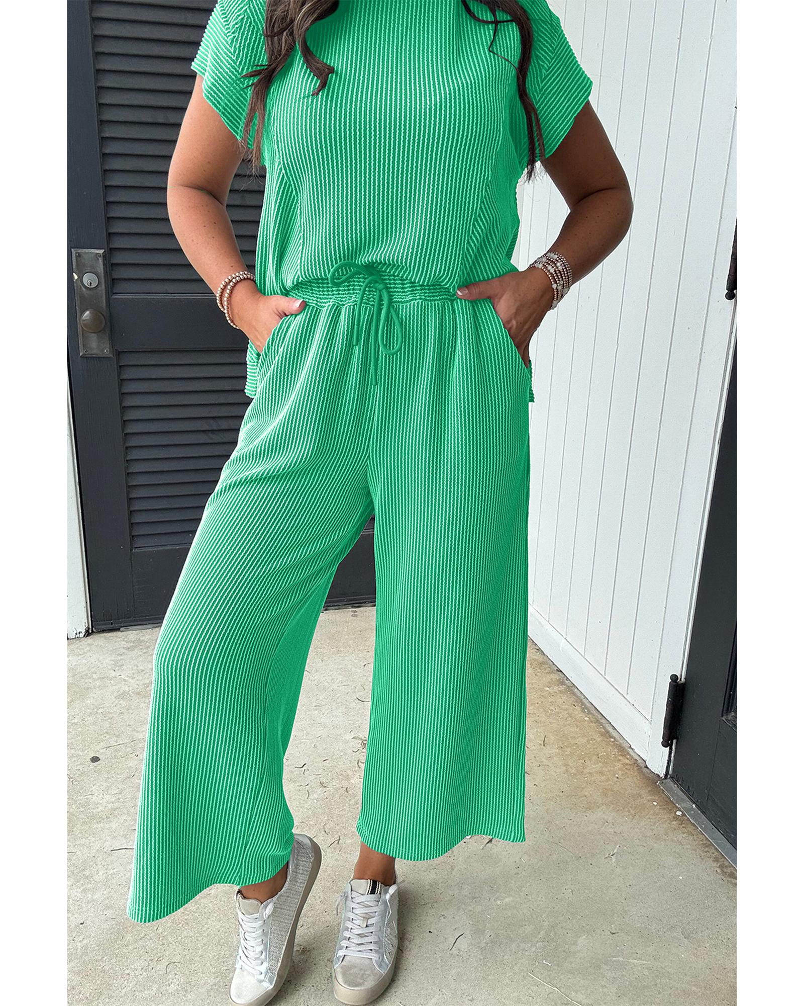 Bright Green Solid Corded Knit Short Sleeve T Shirt and Wide Leg Pants Set - M