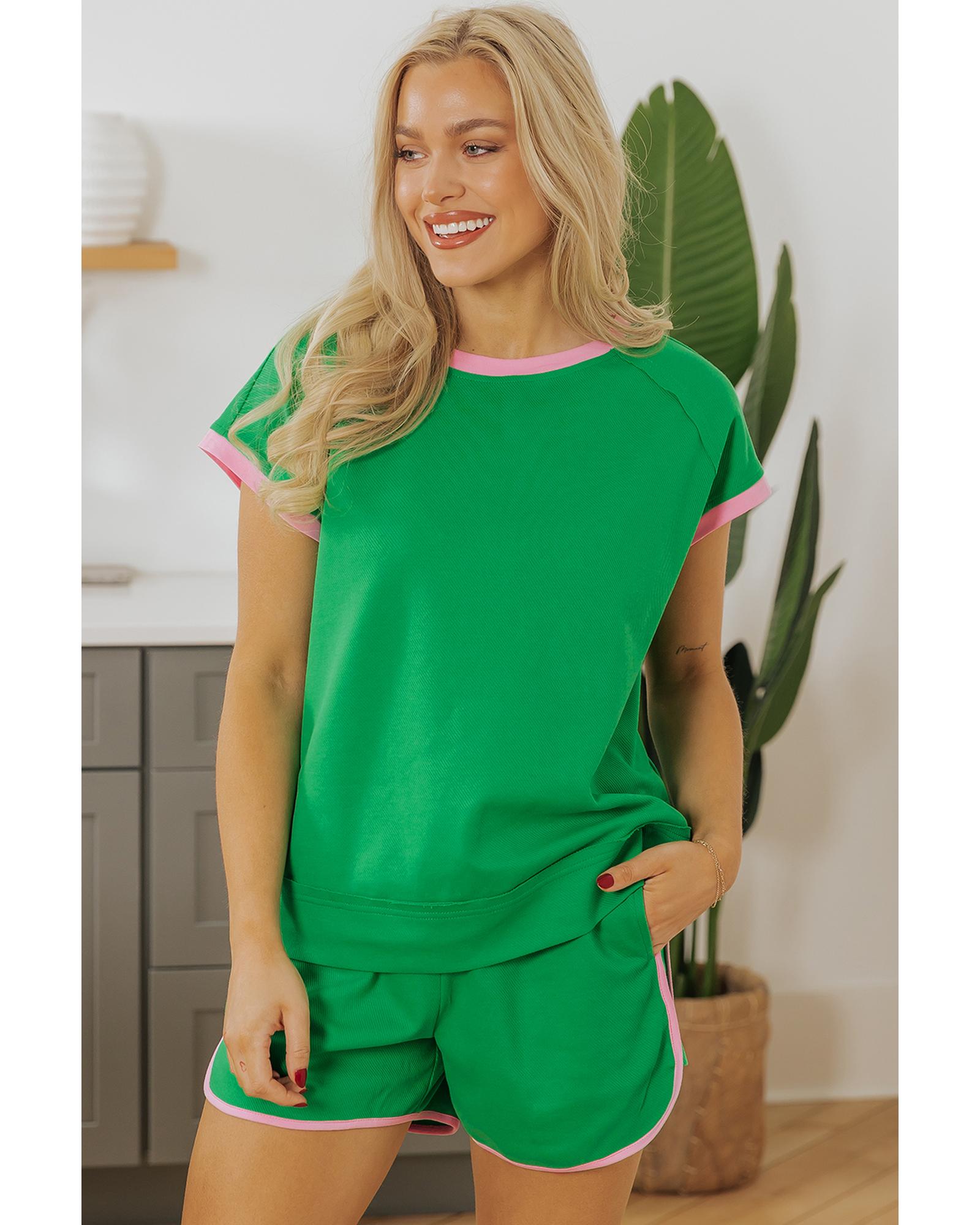 • Bright Green Two Tone Contrast Textured Crewneck Tee and Shorts Set