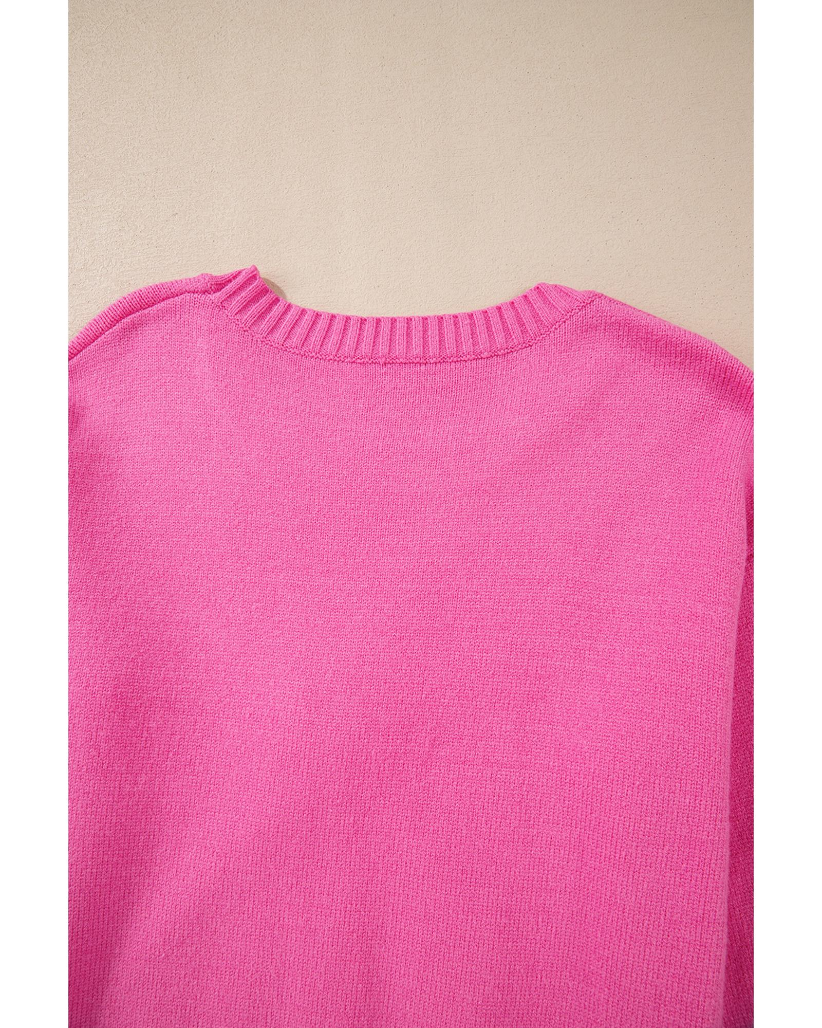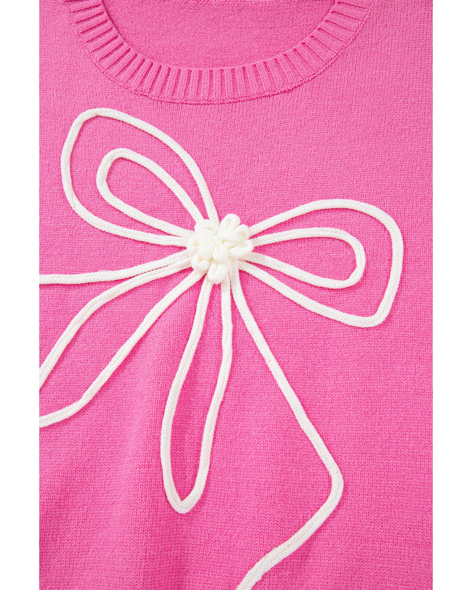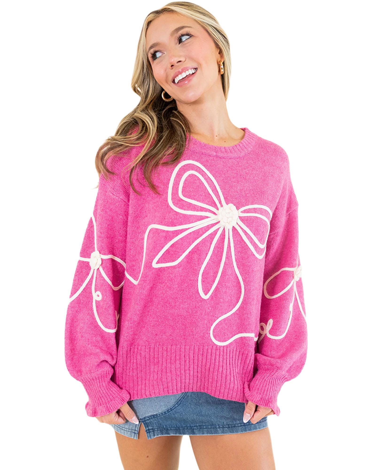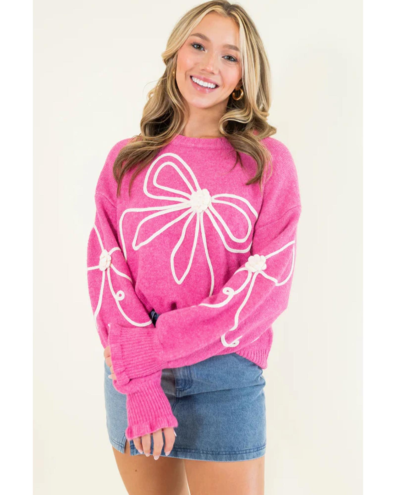 Bright Pink Corded Flower Bow Ribbed Trim Casual Sweater – M