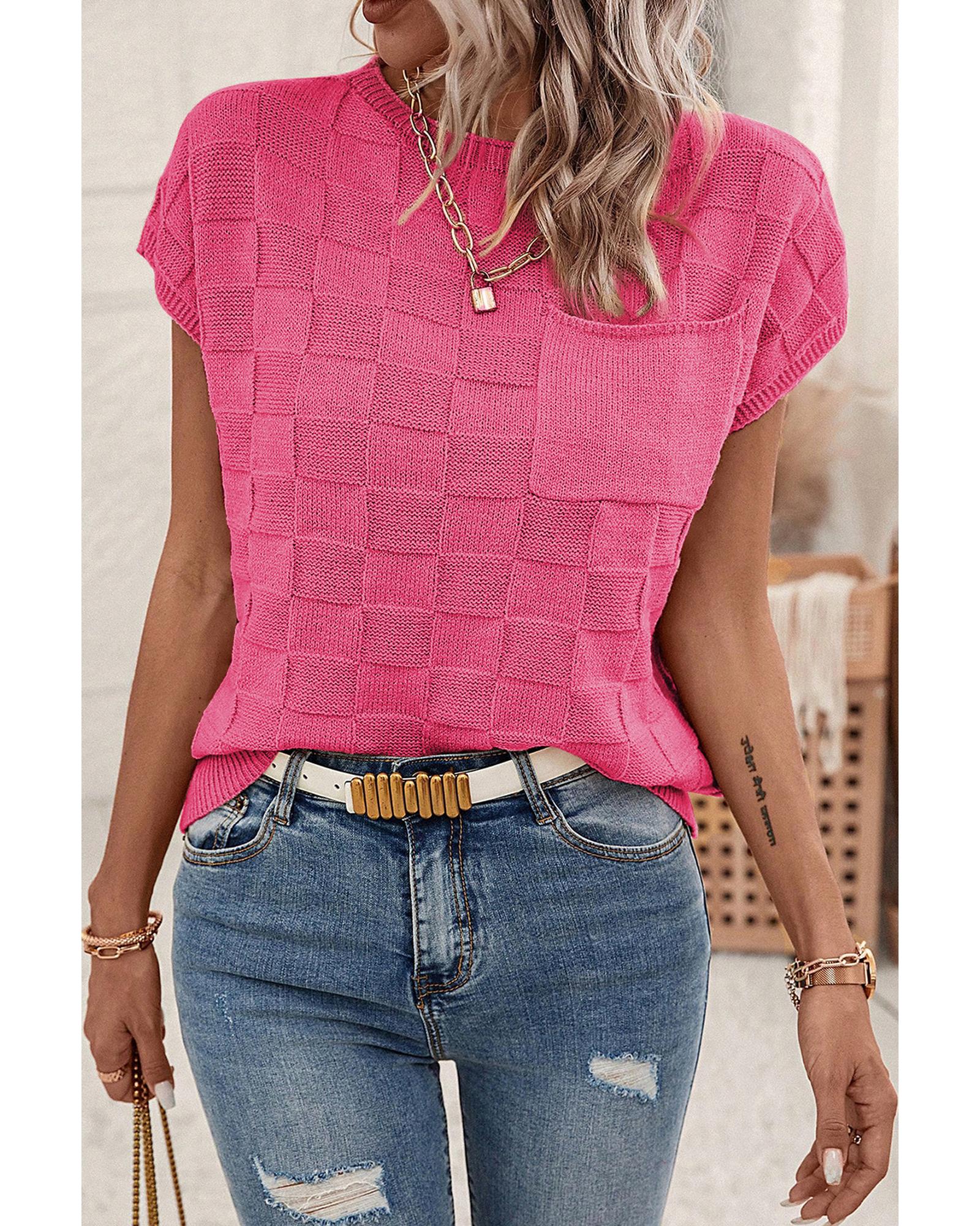 Bright Pink Lattice Textured Knit Short Sleeve Sweater – XL