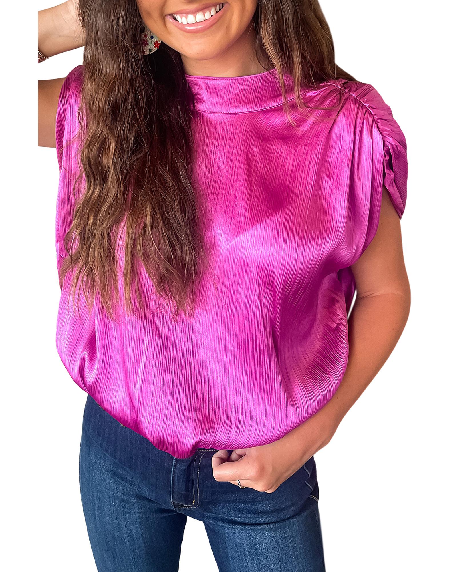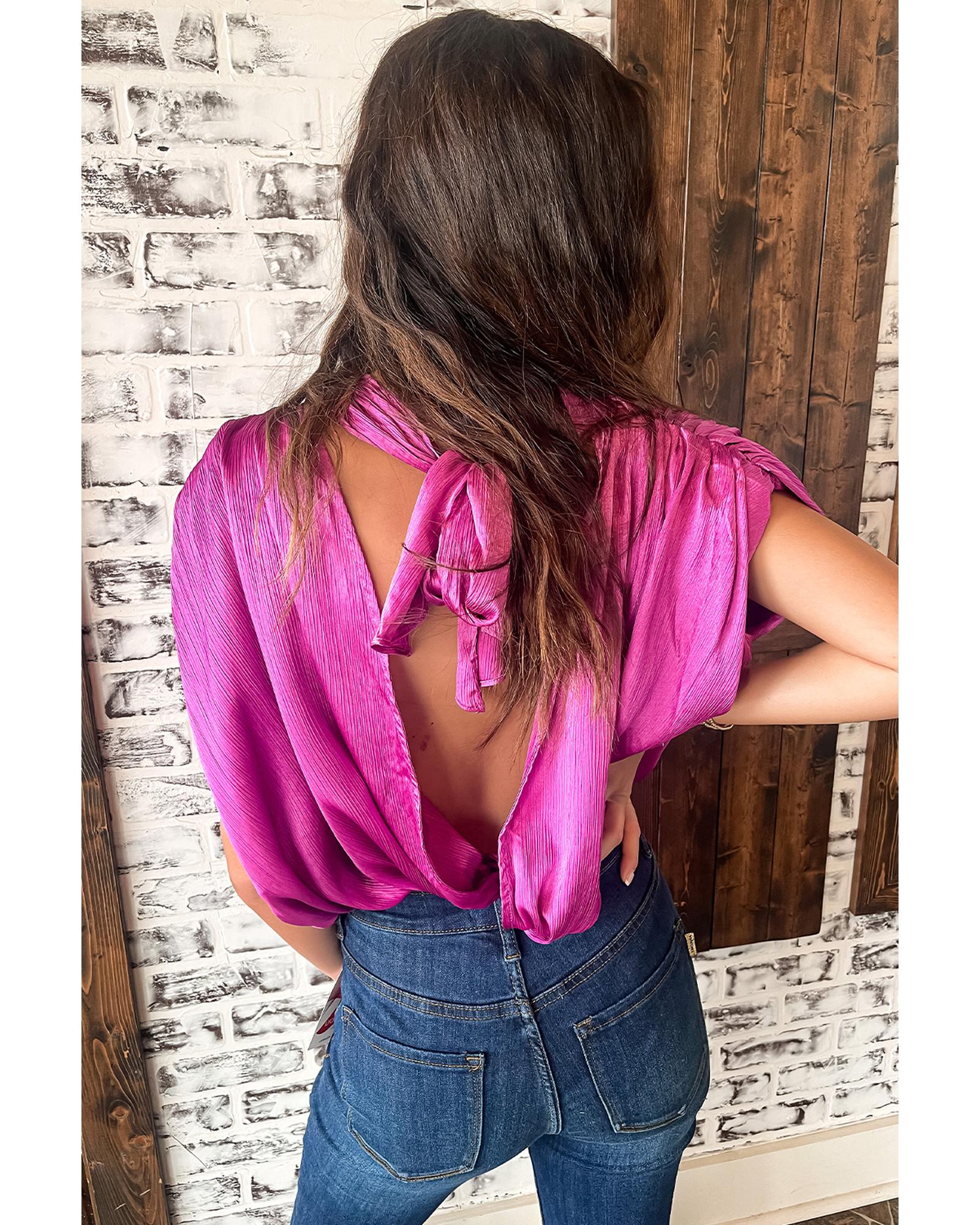 Bright Pink Ruched Sleeves Knotted Backless Blouse – L