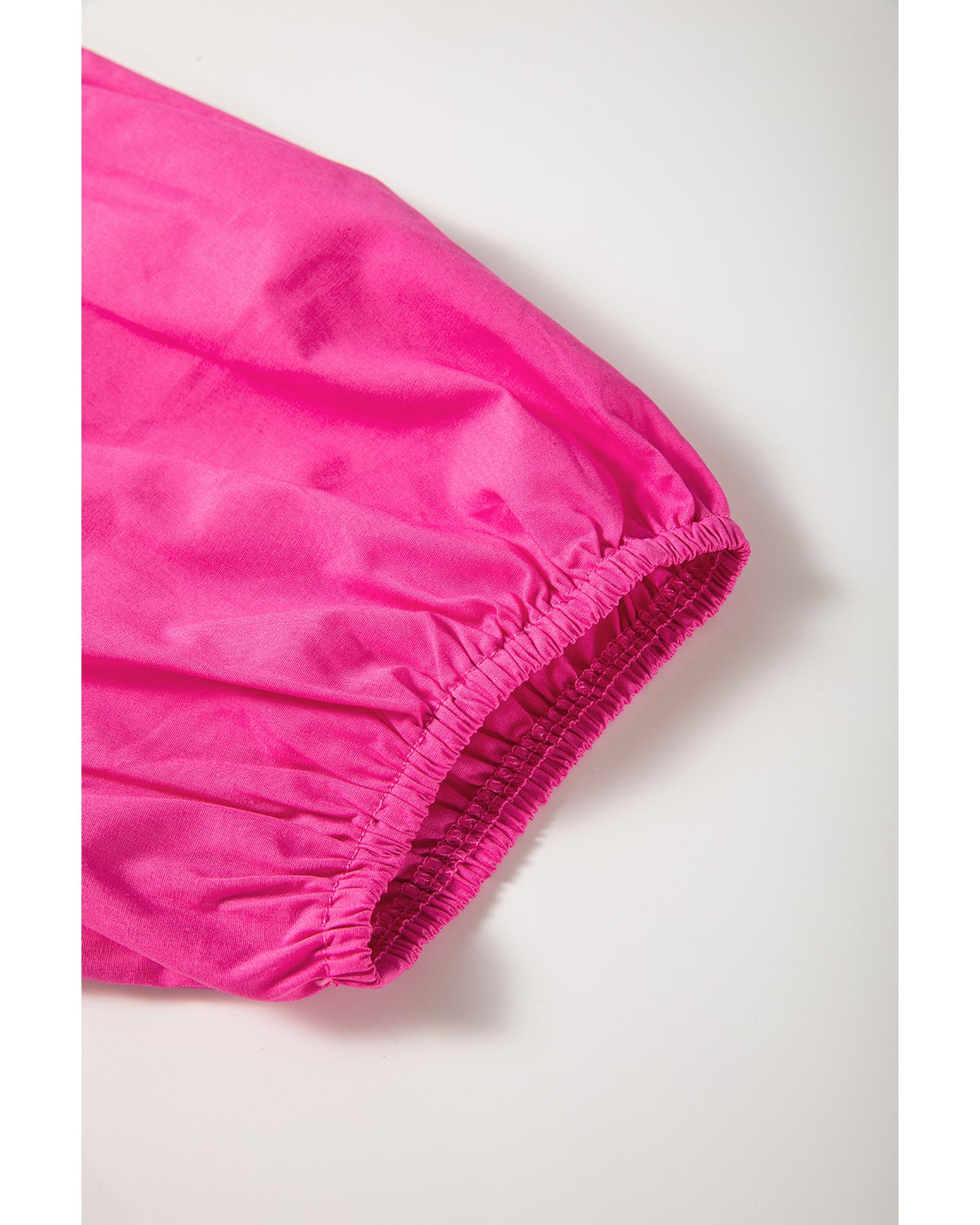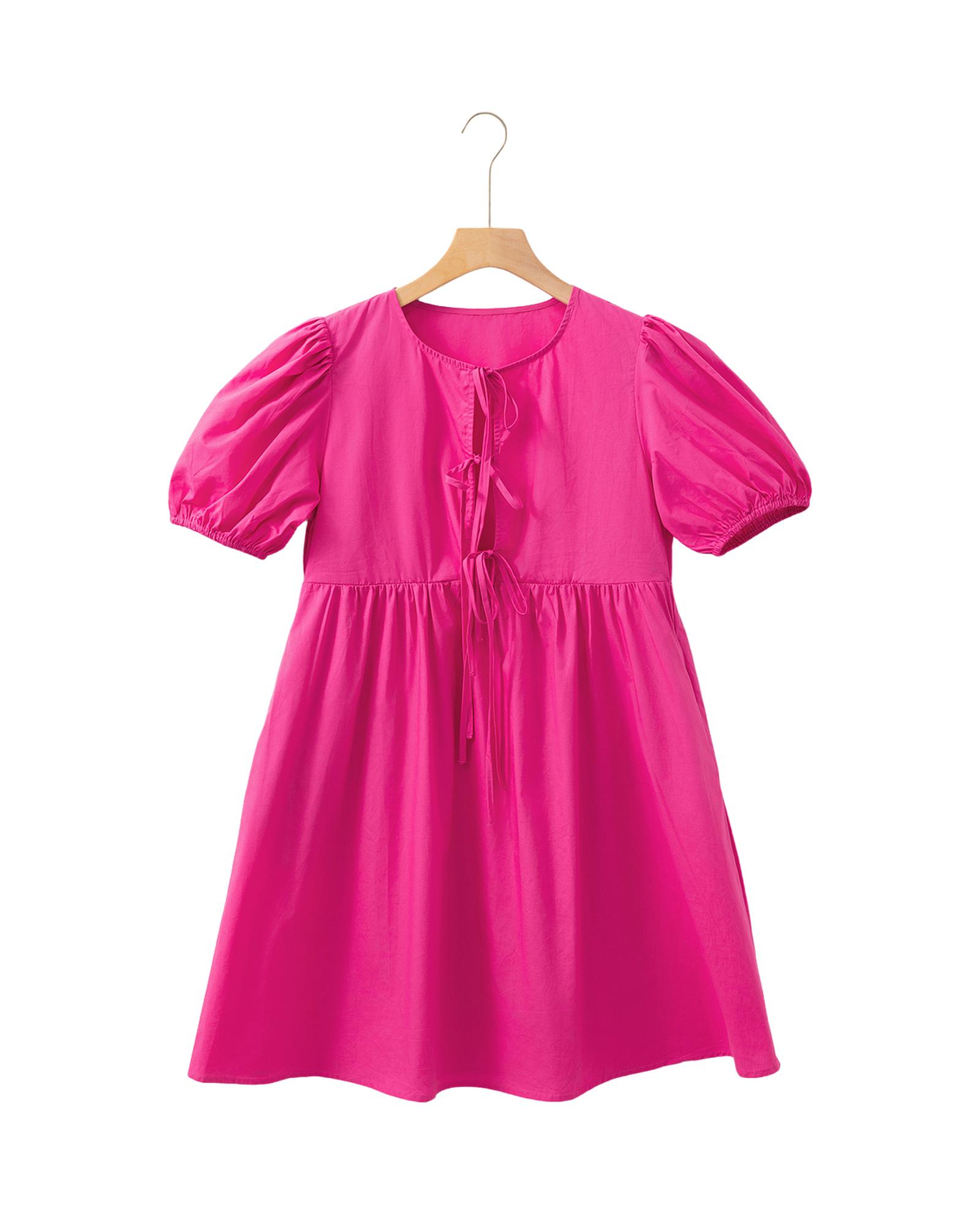 Bright Pink Solid Color Puff Sleeve Tie Front High Waist Mini Dress – L