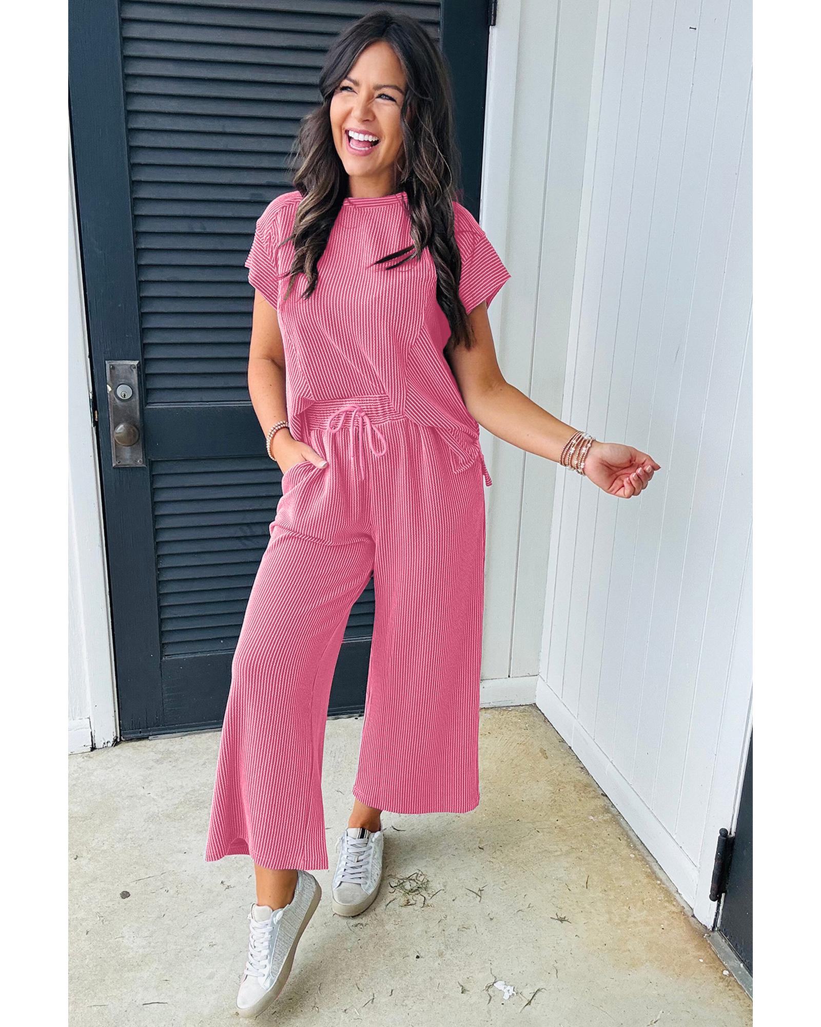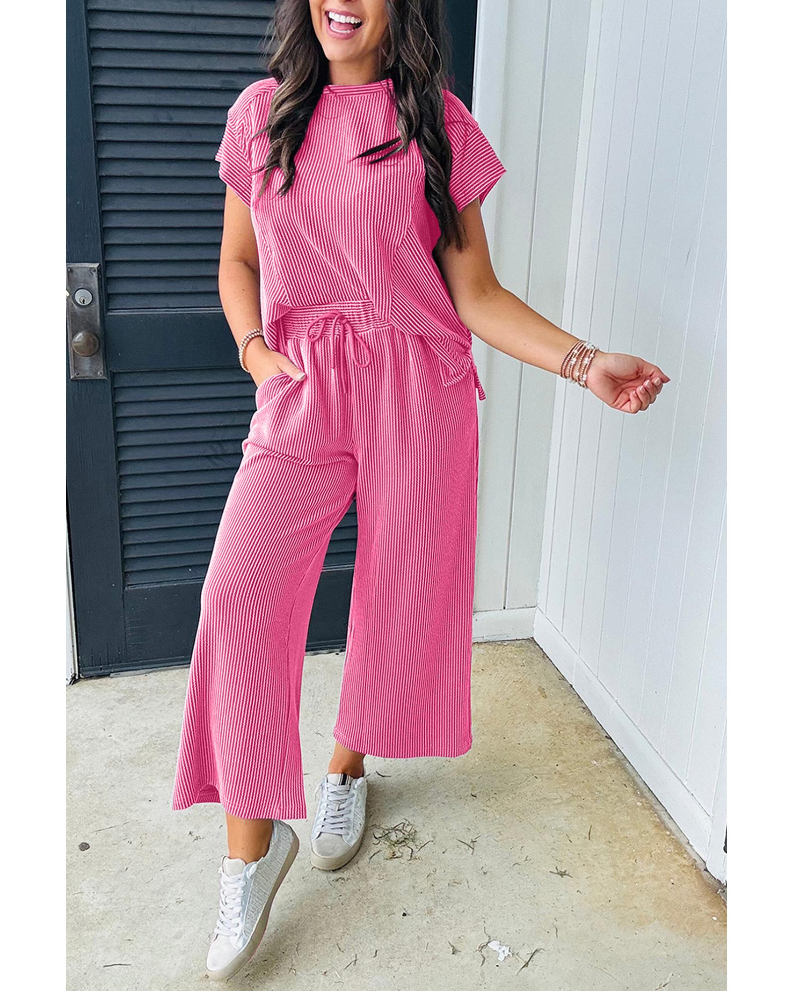 Bright Pink Solid Corded Knit Short Sleeve T Shirt and Wide Leg Pants Set – S