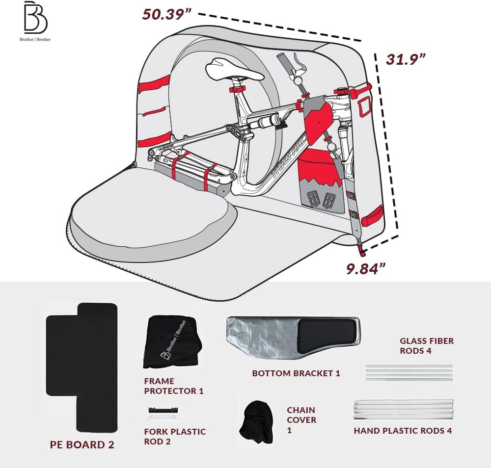 • What’s In The Box – Each set comes with 8 products: Bike Travel Bag with Inner Dimensions of 49.6 x 31.1 x 9.45 inches and Outer Dimensions of 50.39 x 31.5 x 9.84 inches. 2 PE boards, frame protector, drivetrainer chain cover, 4 hard plastic rods, 2 fork plastic rods, 4 glass fibre rods, bottom foam block, and a Manual.