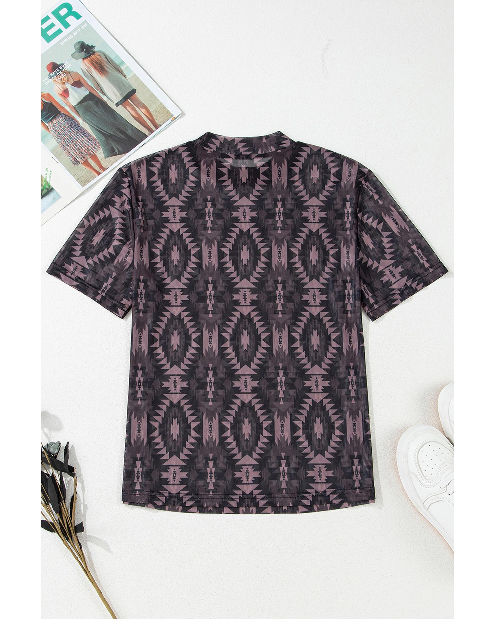 Brown Aztec Print Mock Neck Short Sleeve Mesh T Shirt – S