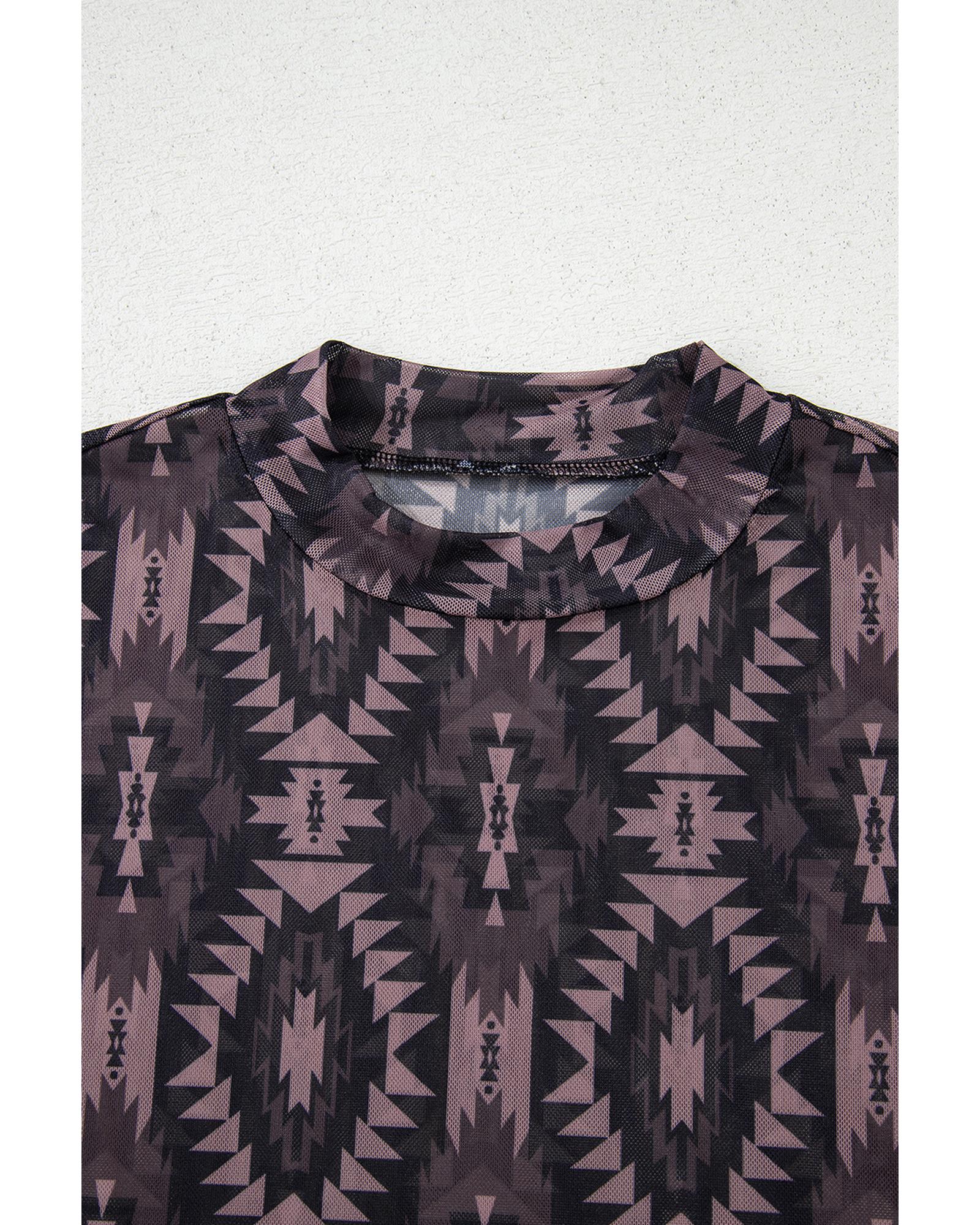 Brown Aztec Print Mock Neck Short Sleeve Mesh T Shirt – XL