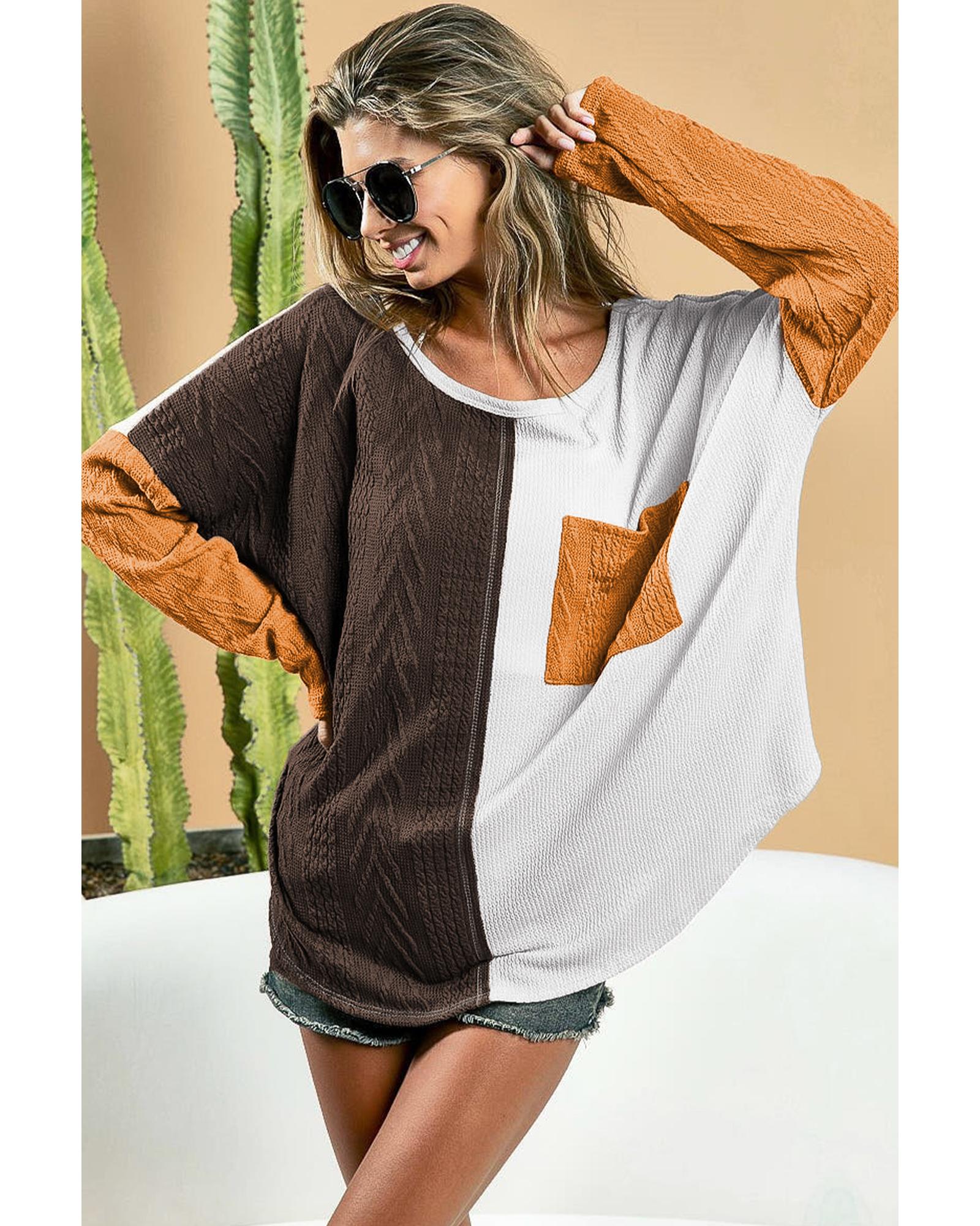 Brown Color Block Patchwork Chest Pocket Long Sleeve Top – L