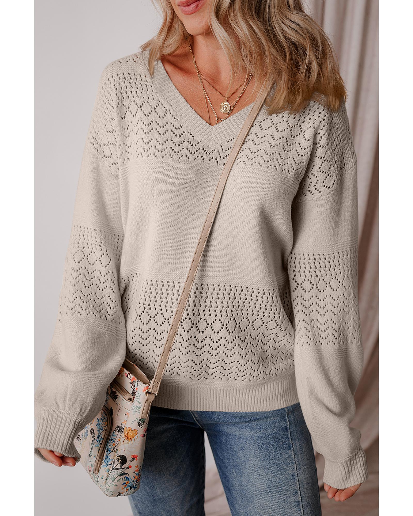 Brown Eyelet Pattern Detail V Neck Drop Shoulder Sweater – M