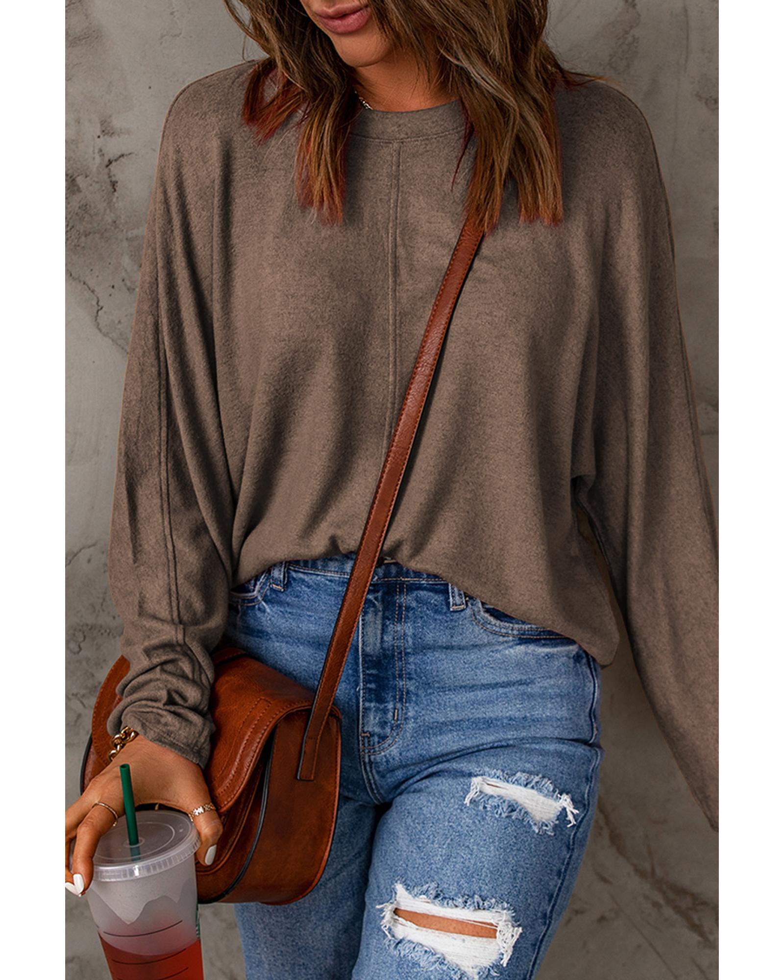 Brown Fiery Solid Color Patchwork Long Sleeve Top – S