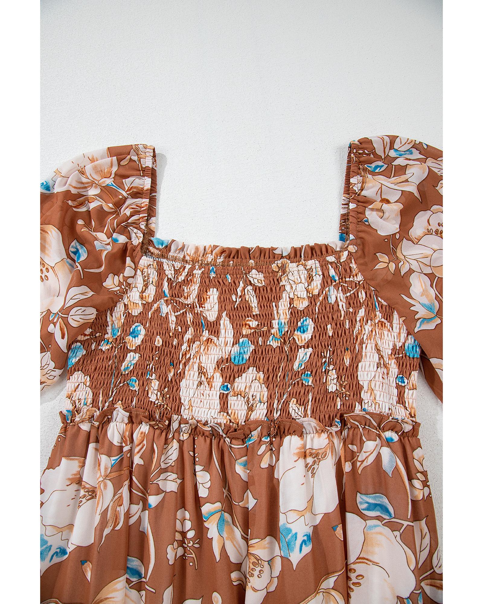 - Brown Floral Print Shirred Square Neck High Waist Maxi Dress