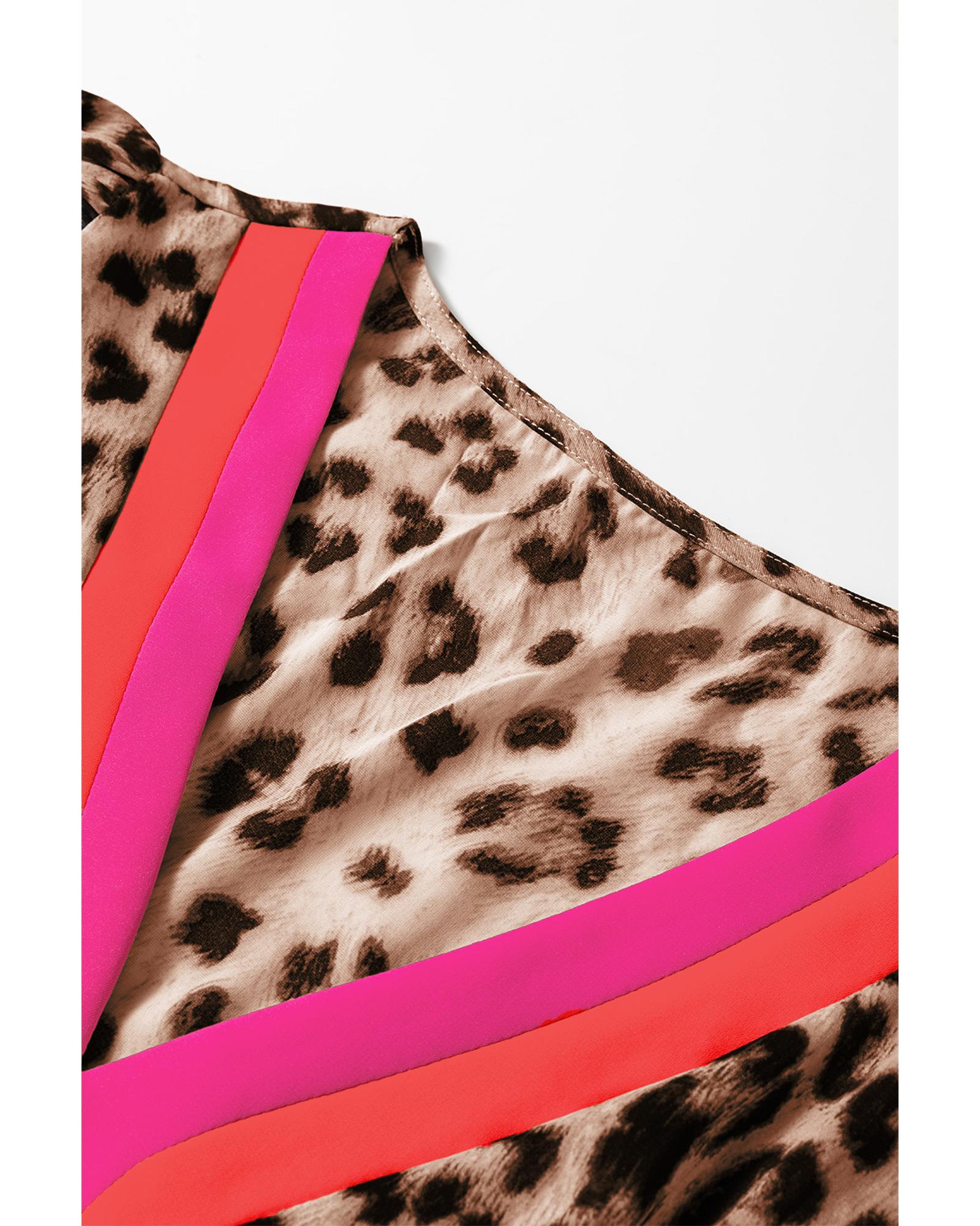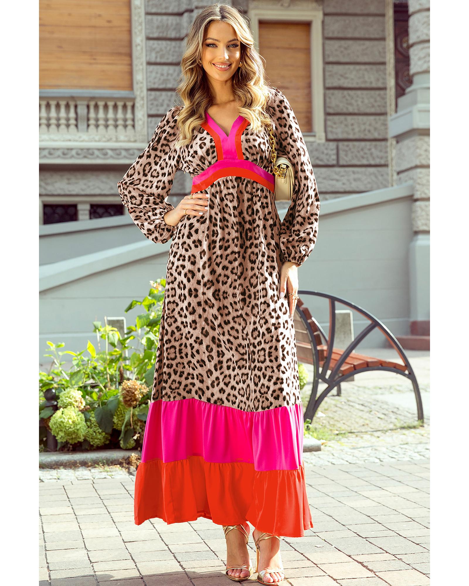 Brown Leopard Color Block V Neck Loose Fit Maxi Dress – M