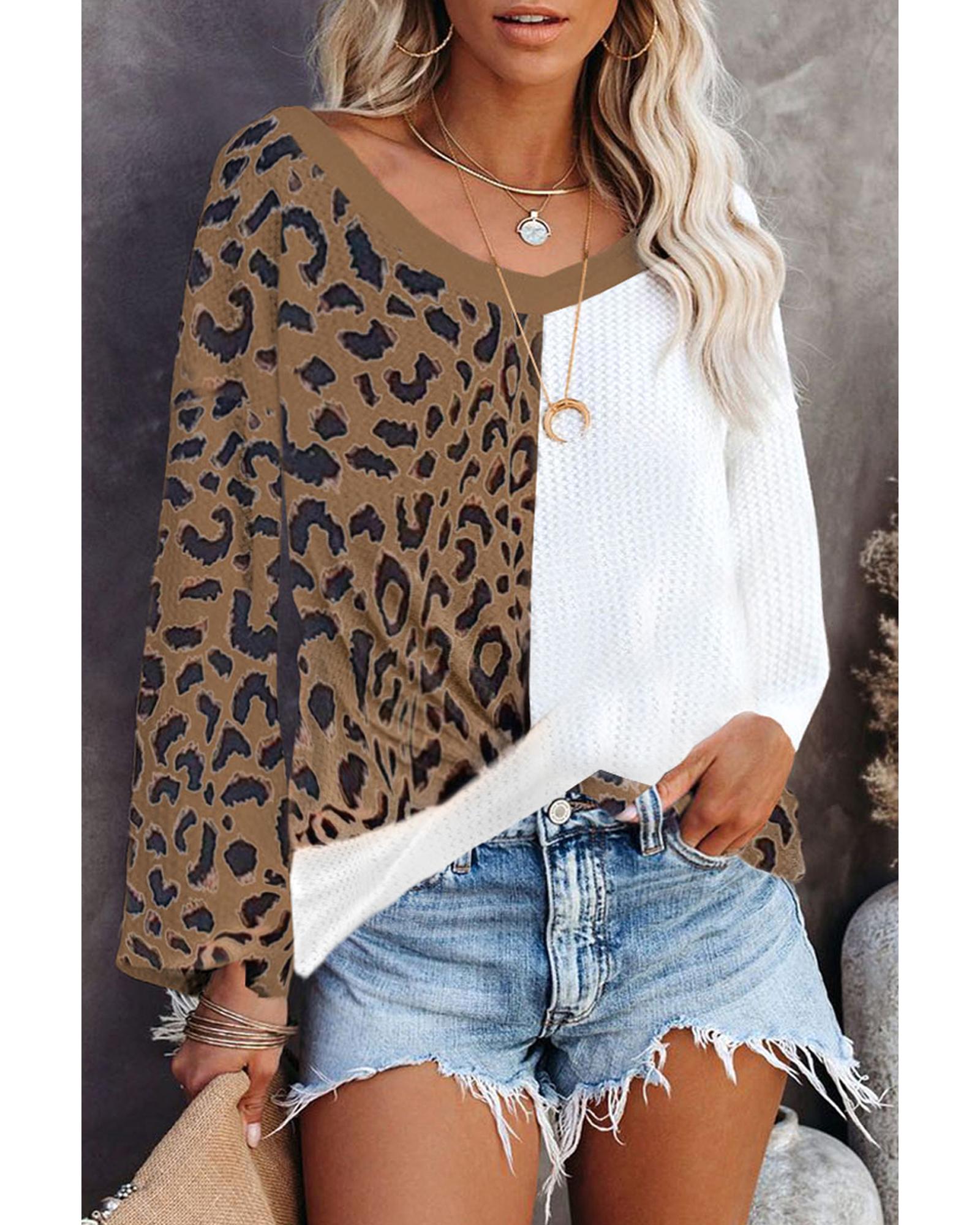 - Unisex Brown Leopard Contrast Waffle Knit Twist Hem V Neck Top