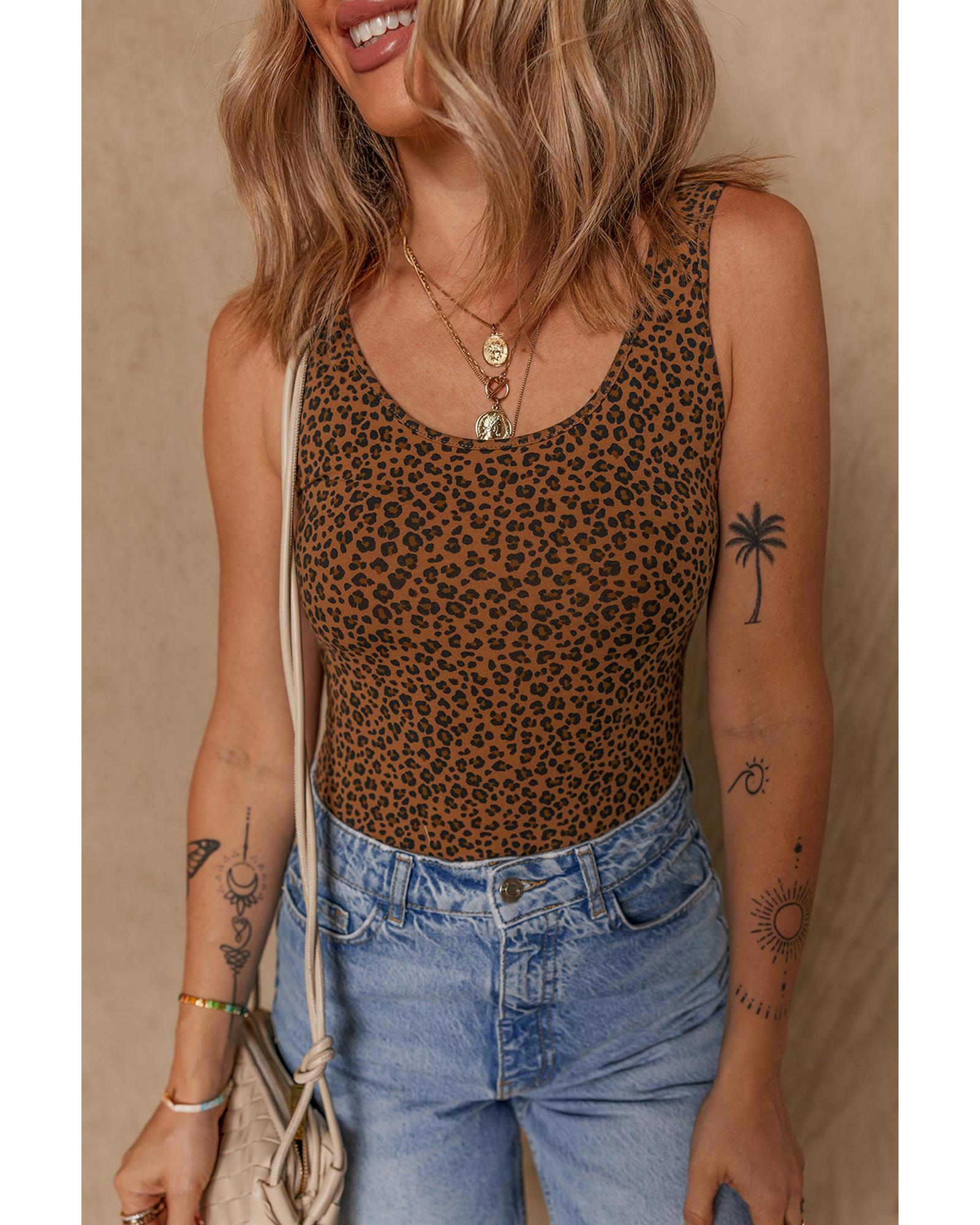 - Brown leopard printed sleeveless scoop neck bodysuit