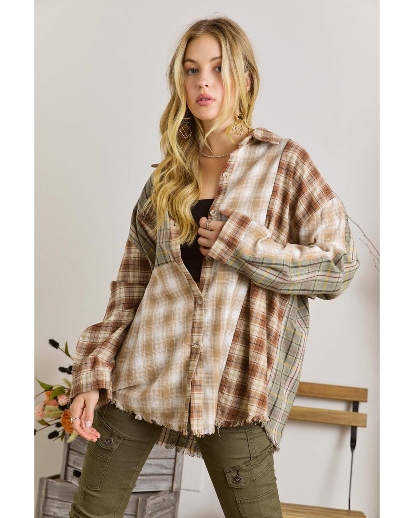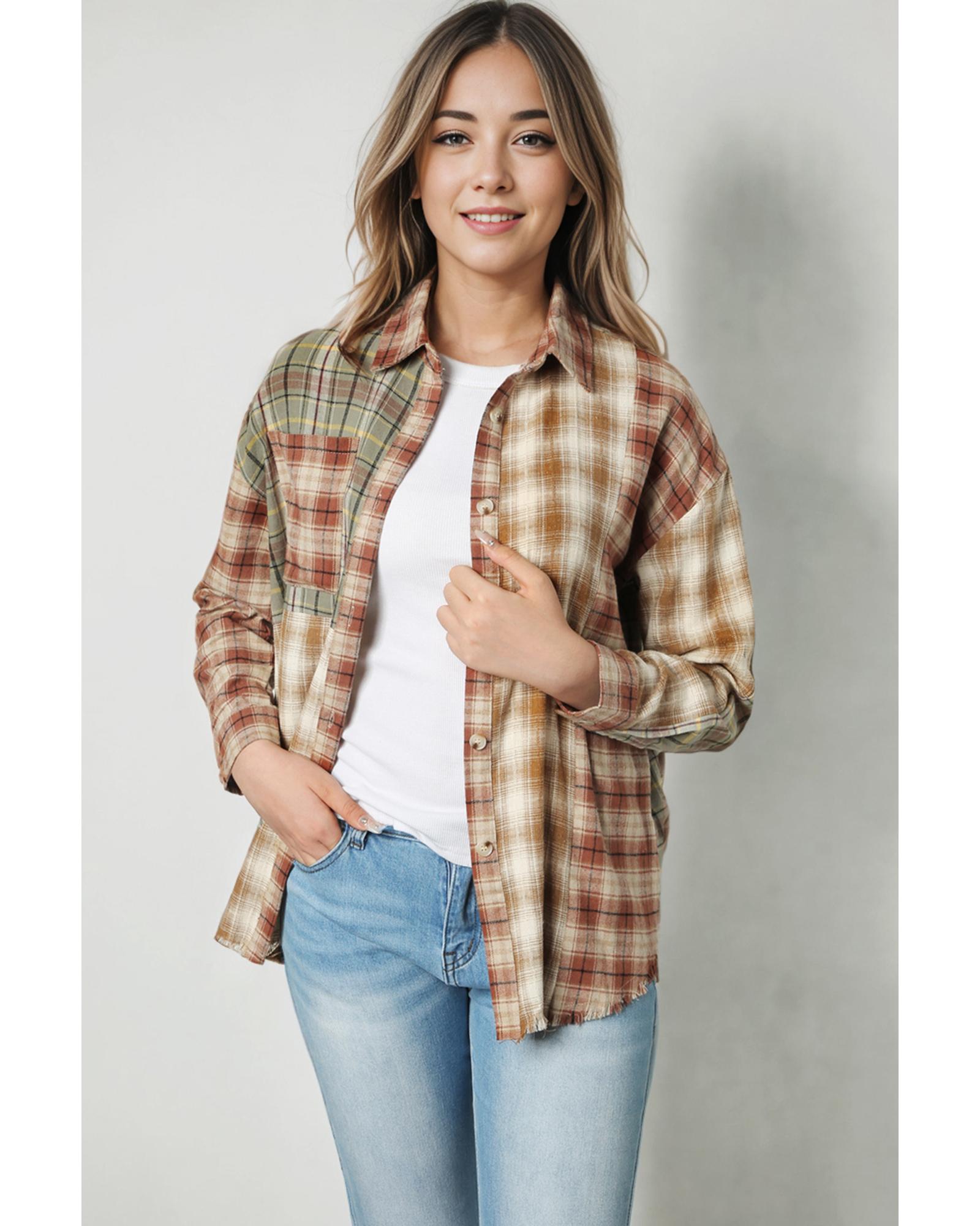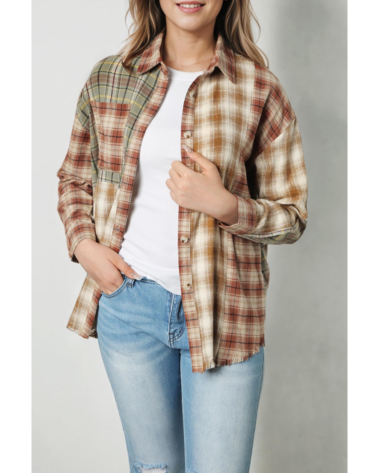 Brown Multi Plaid Patchwork Raw Edge Casual Shirt – XL