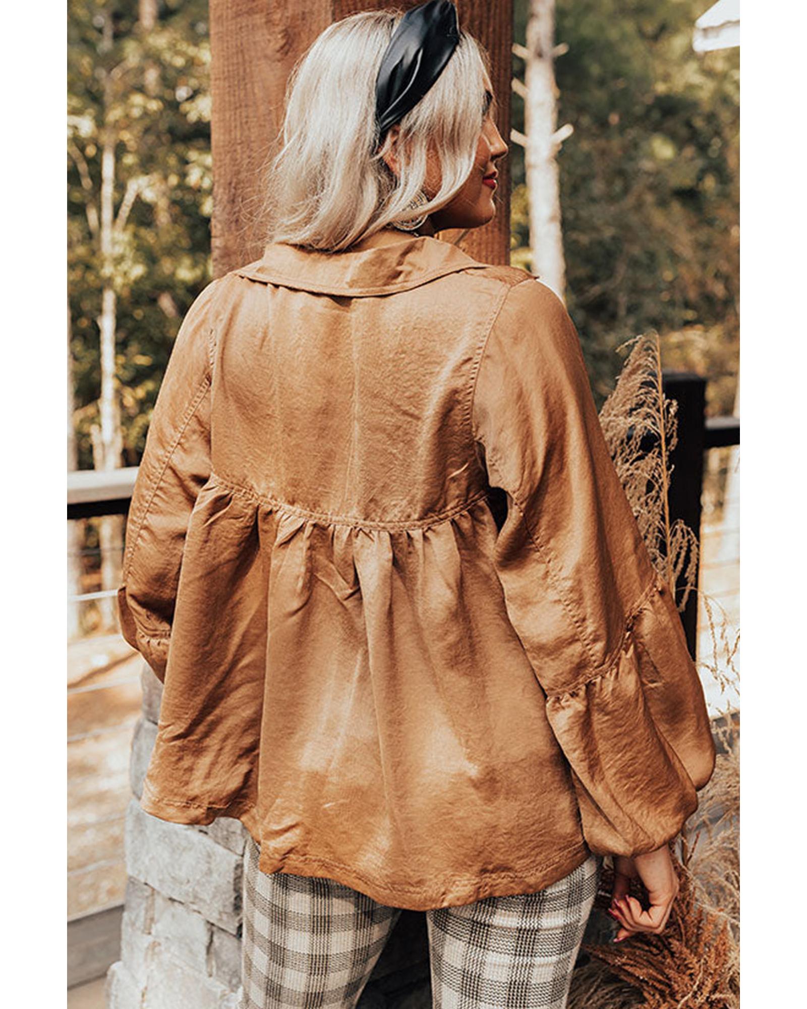 Brown Puff Sleeve Collared Pleated Babydoll Blouse - L