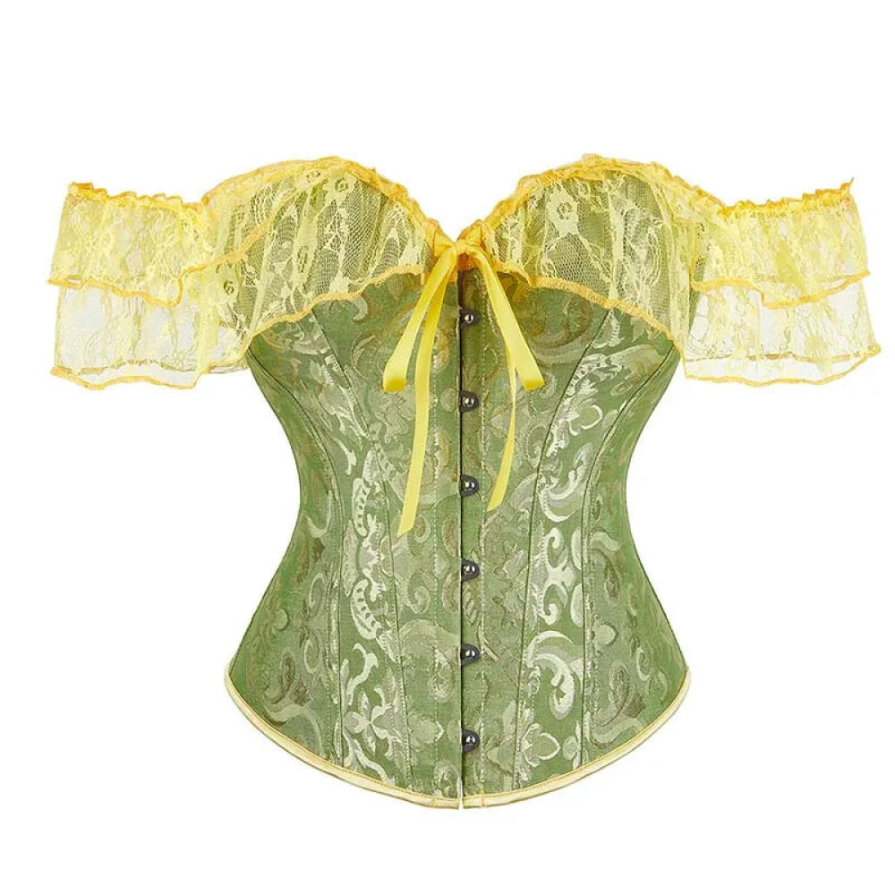 • 1 x Brown Steampunk Corset With Front Busk Closure Floral Lace And Puff Sleeves