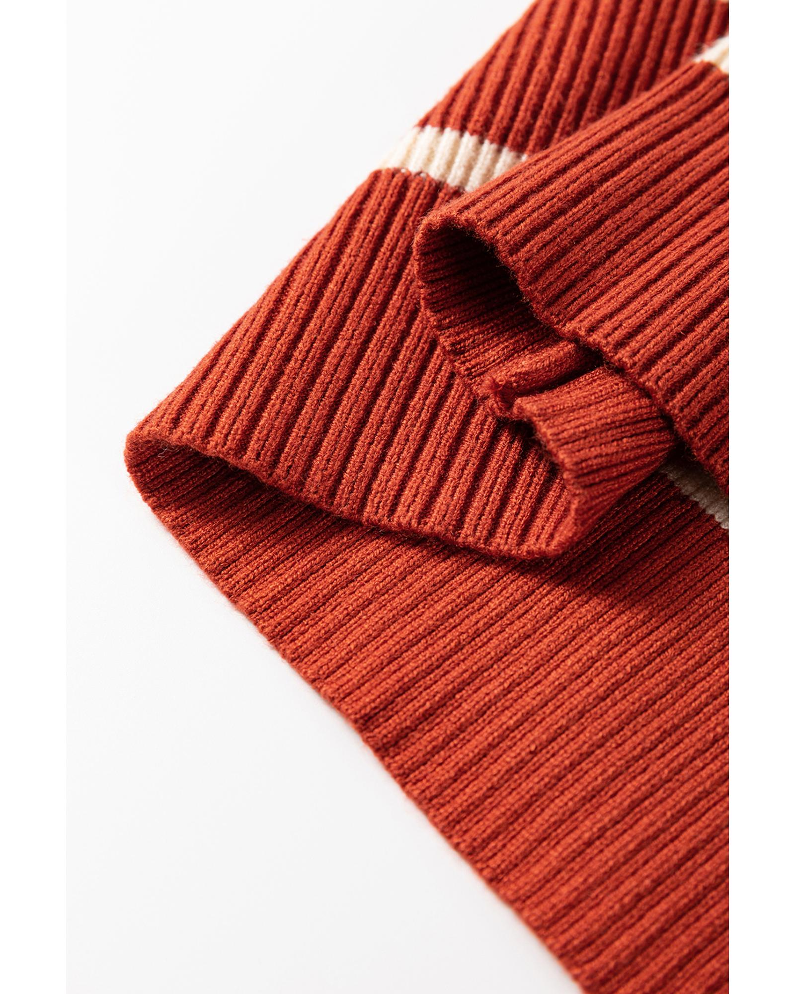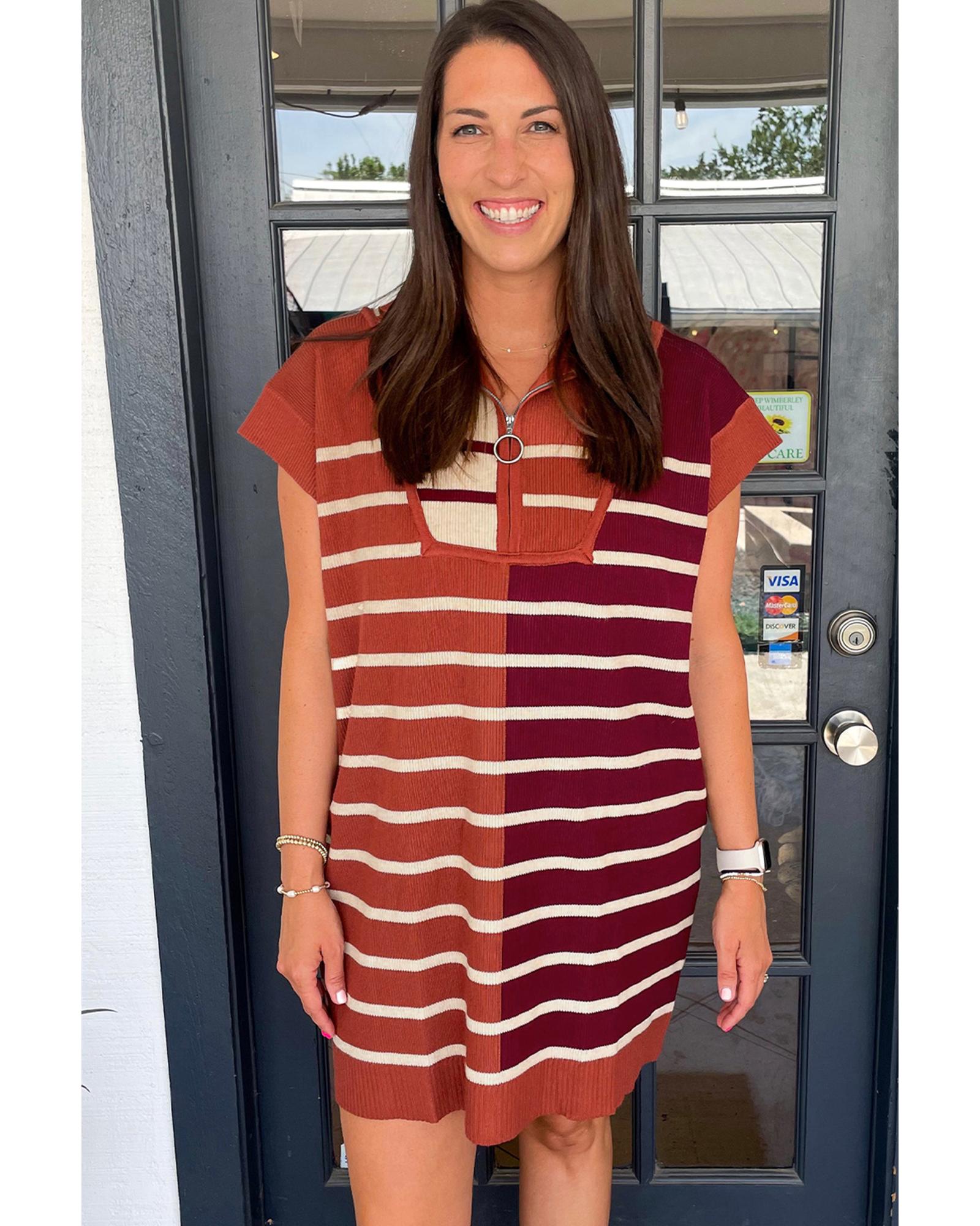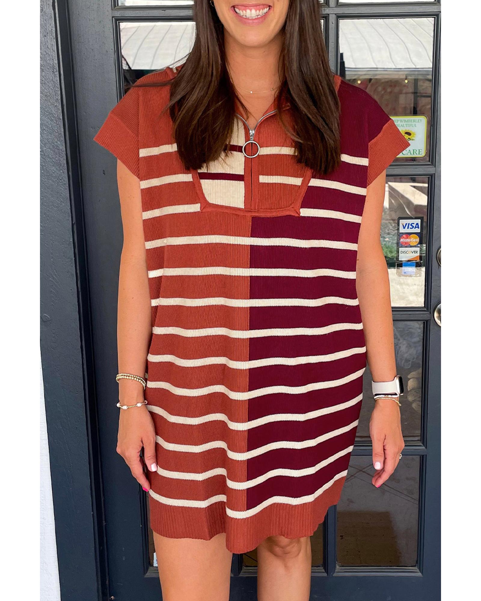 Brown Stripe Color Block Quarter Zip Collar Short Sleeve Sweater Dress – S