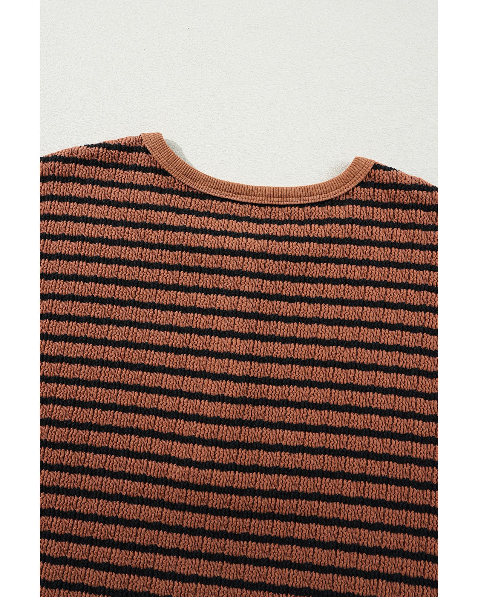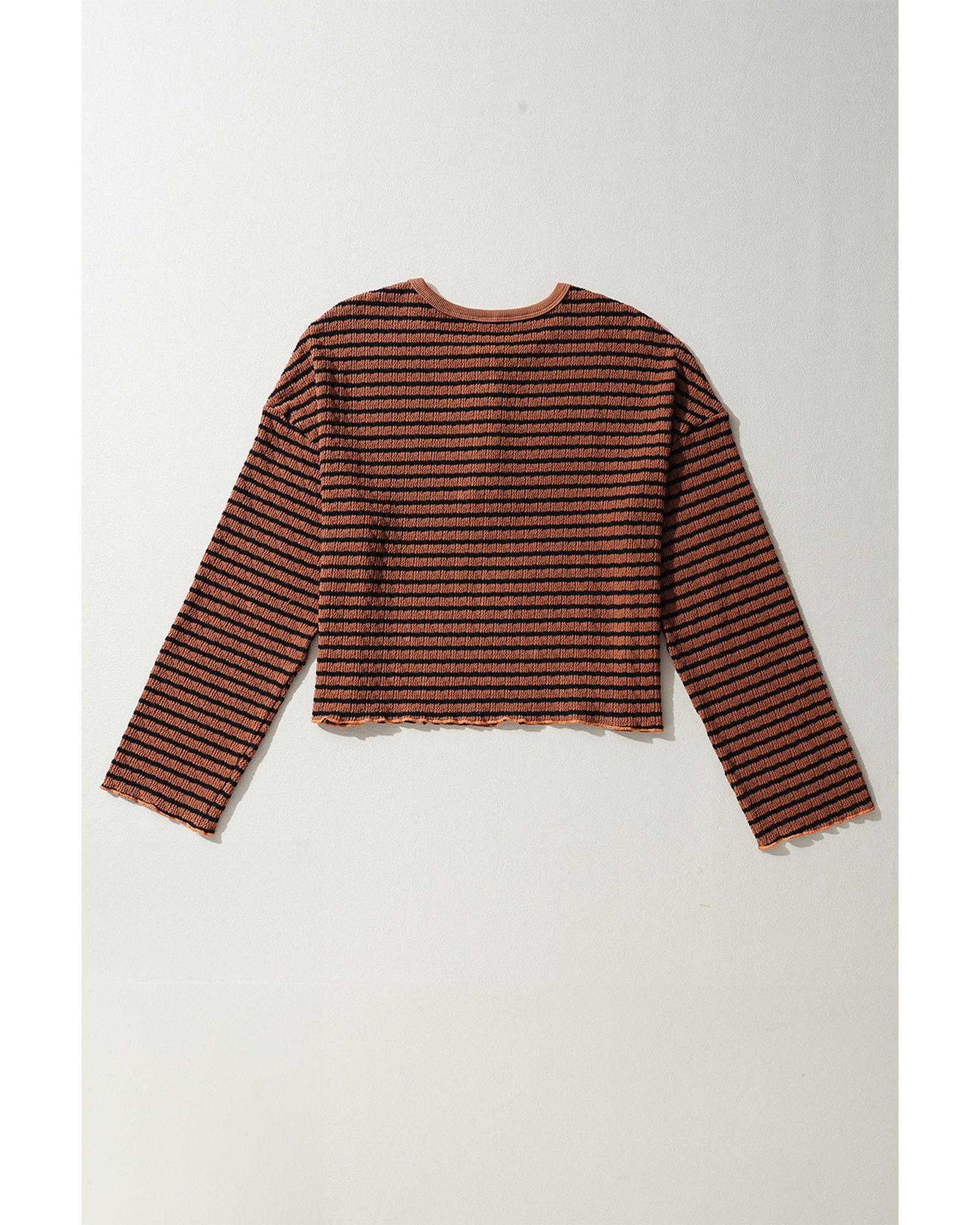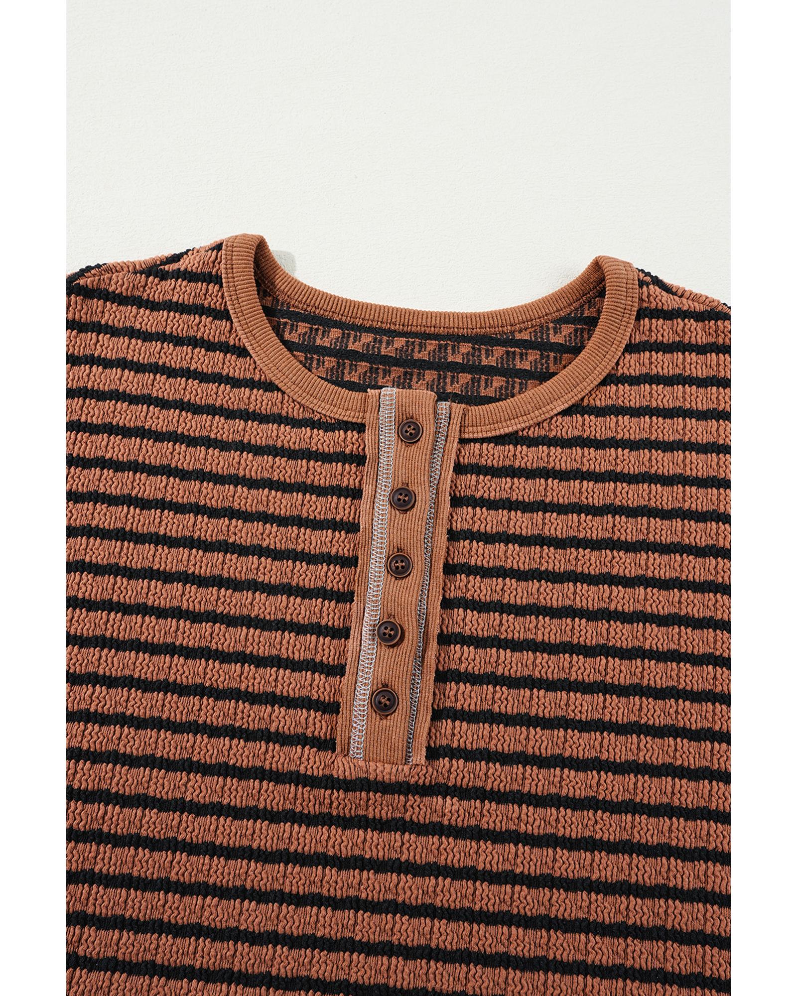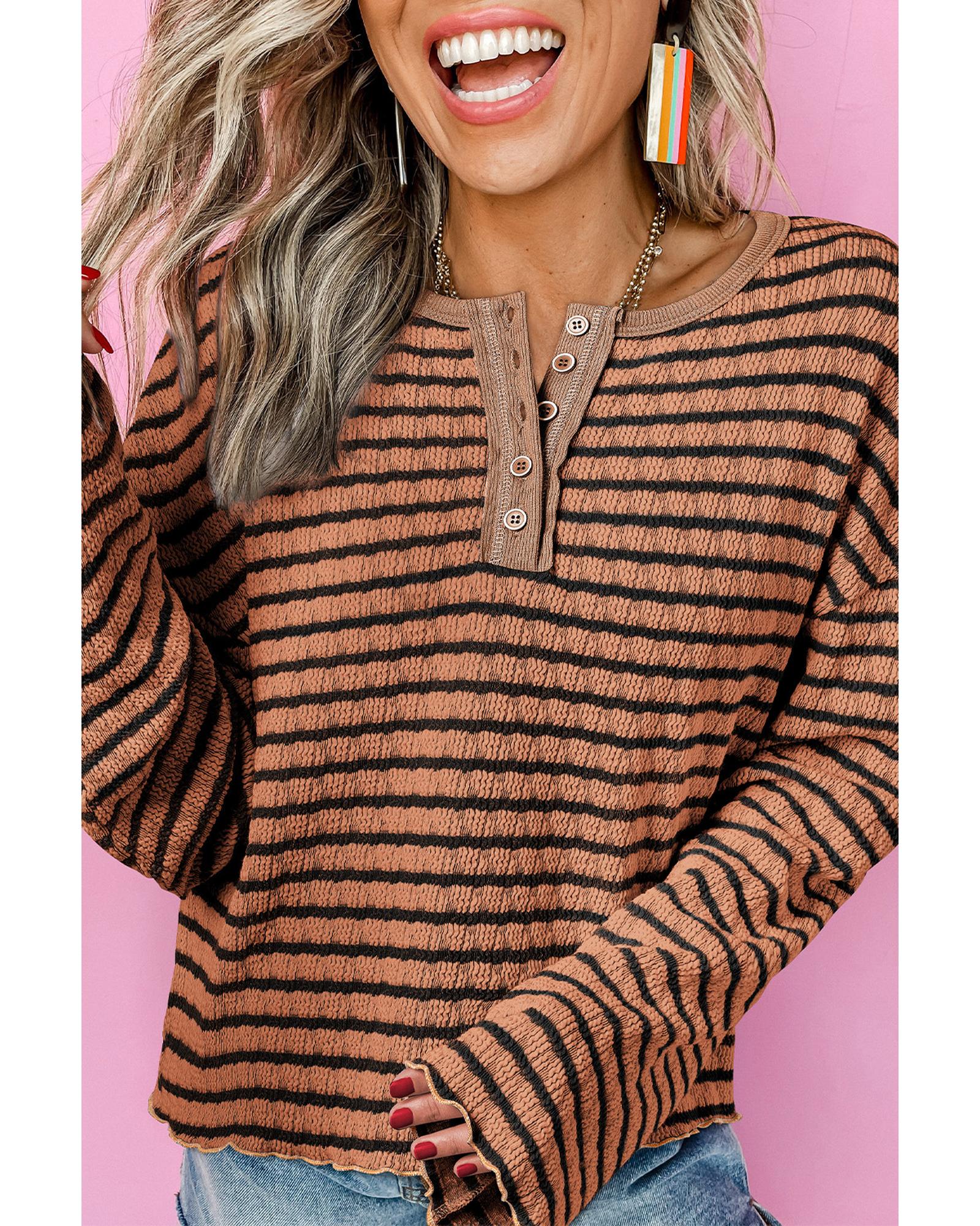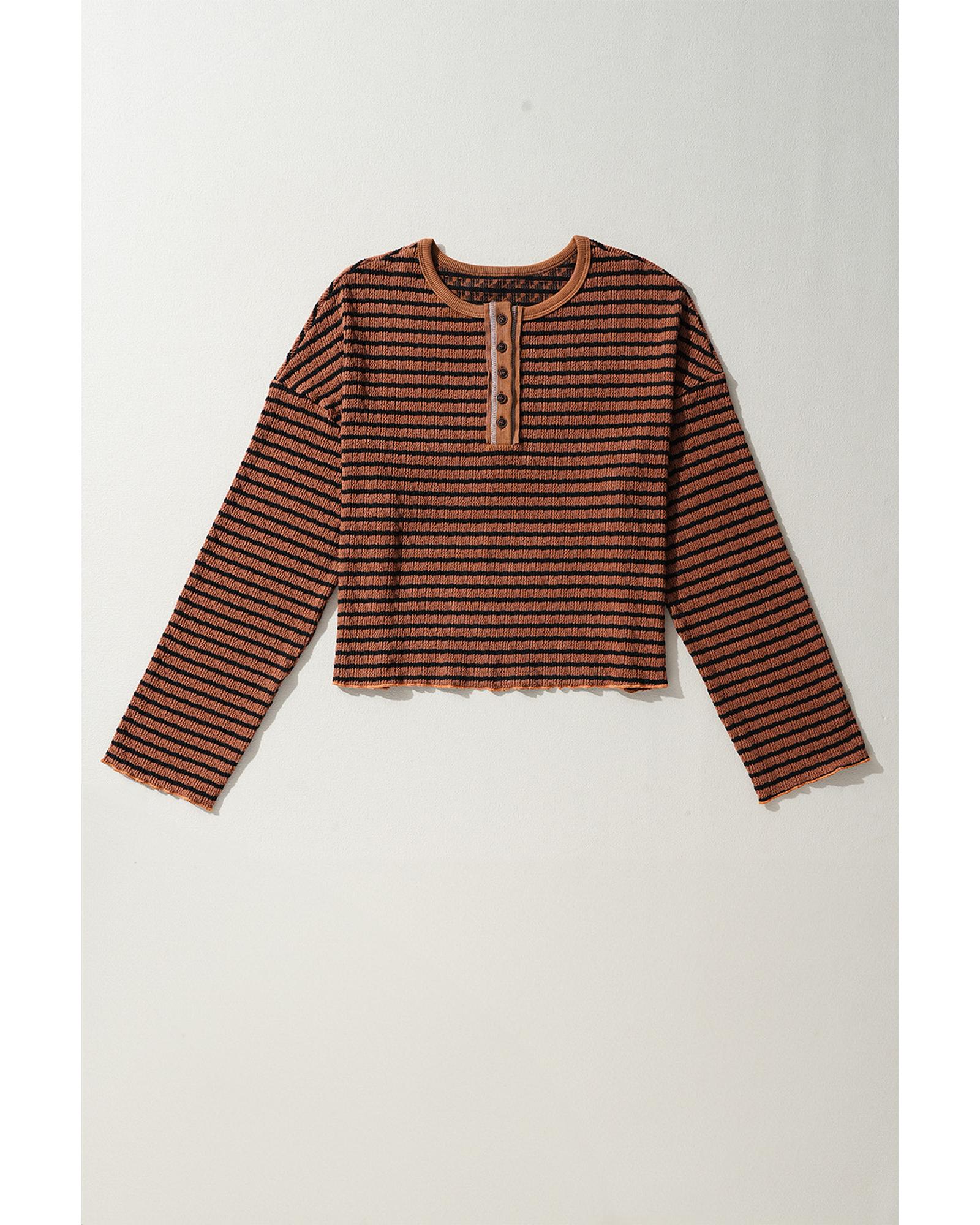 - Brown Stripe Textured Frilly Trim Buttons Henley Long Sleeve Top